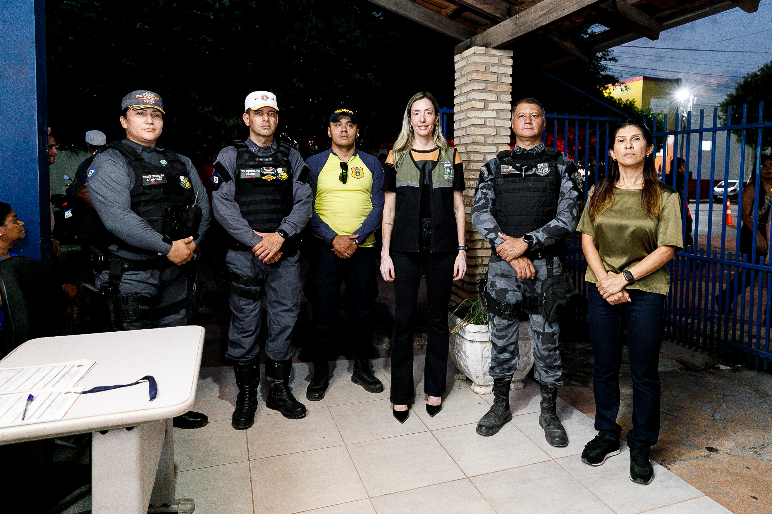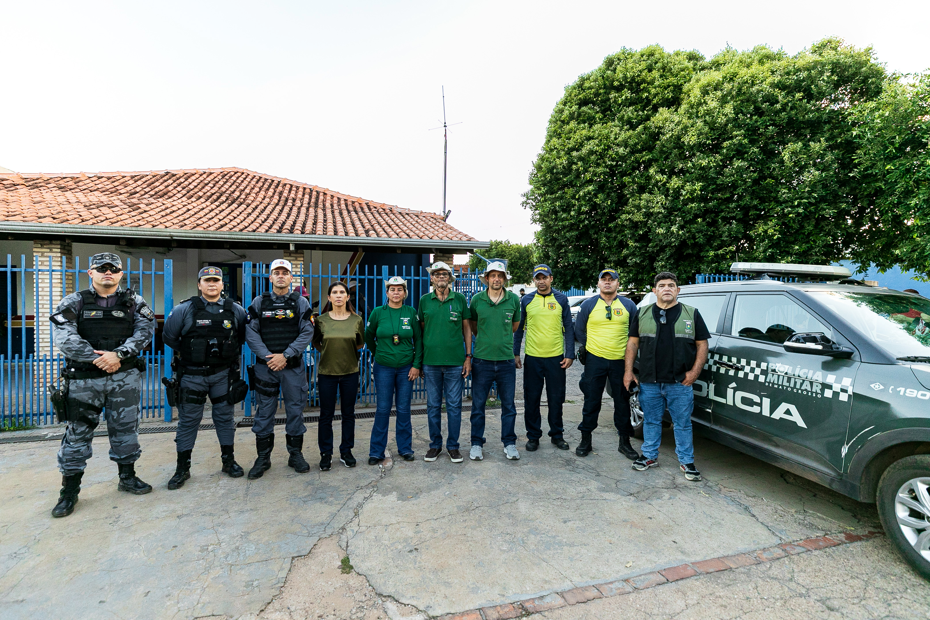 A imagem mostra equipes da PM e da Prefeitura de Cuiabá que comandaram a operação. São 3 policiais militares fardados, um servidor da Semob e as secretárias de Ordem Pública e Segurança Pública de Cuiabá.
