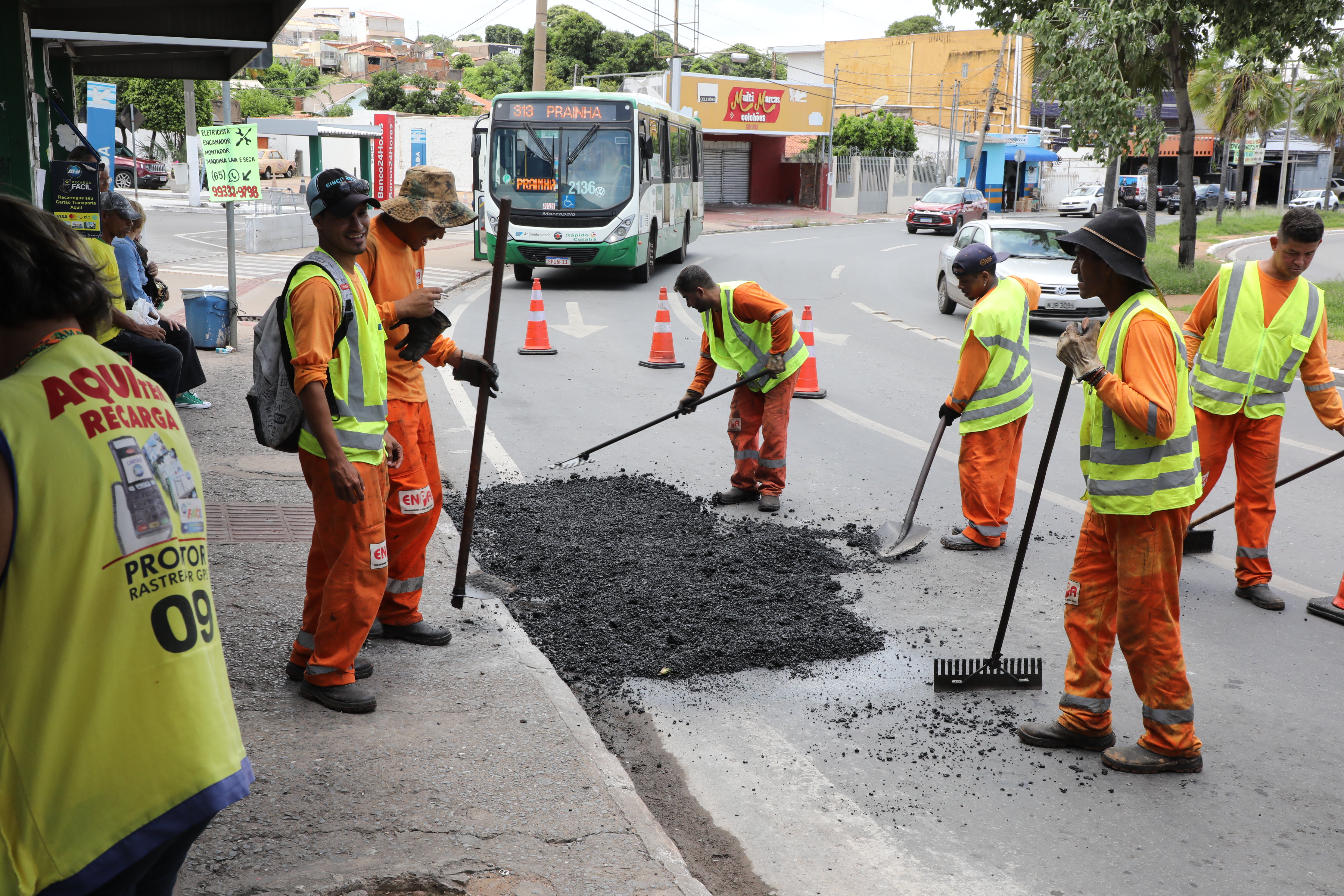 A imagem mostra seis operadores realizando o rastreamento de lama asfáltica colocada na Avenida Tenente Coronel Durante (Prainha), no bairro Dom Aquino. Eles estão usando uniformes laranja com coletes refletivos. Ao fundo, é possível ver um ônibus com o letreiro indicando o itinerário "313 – PRAINHA".