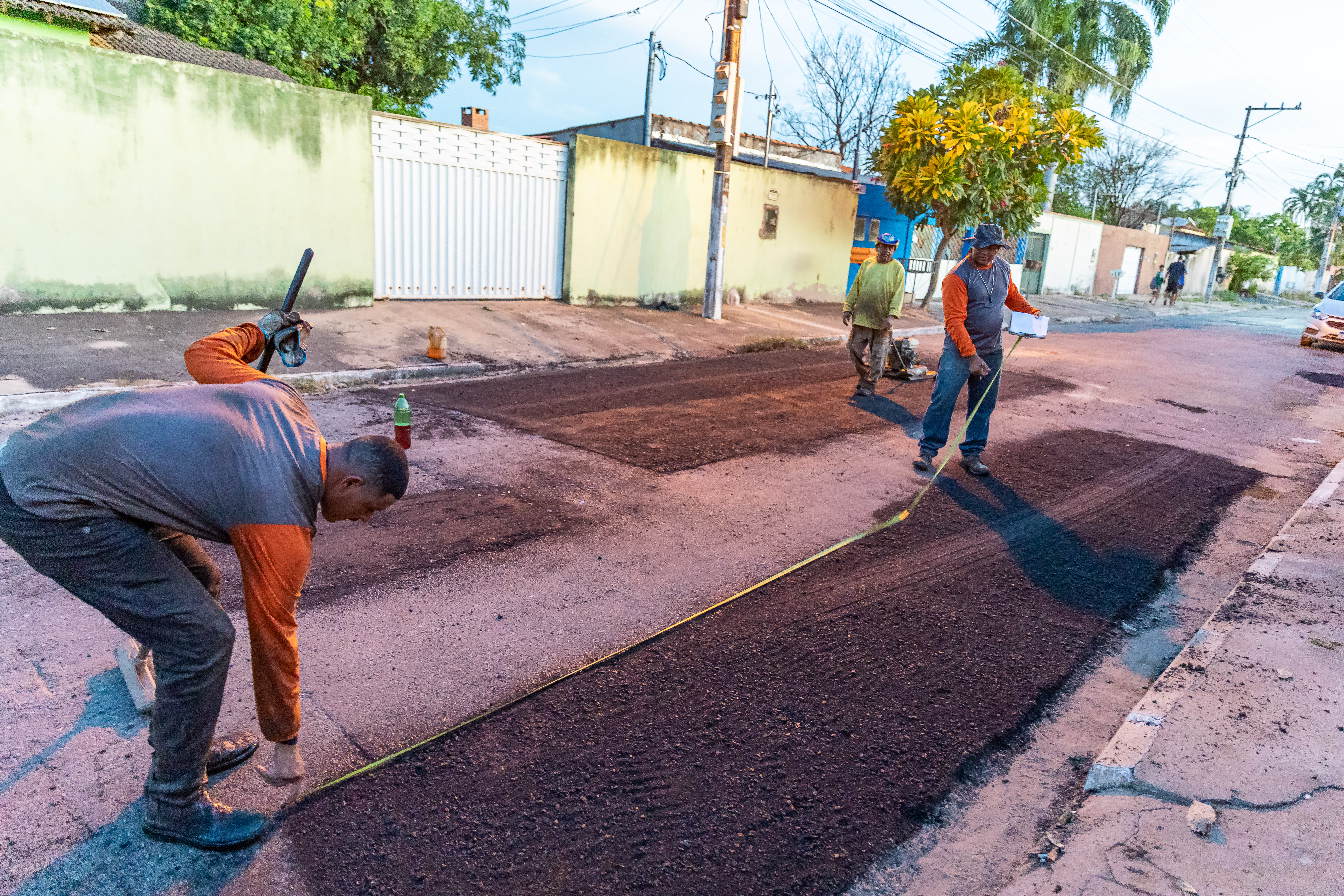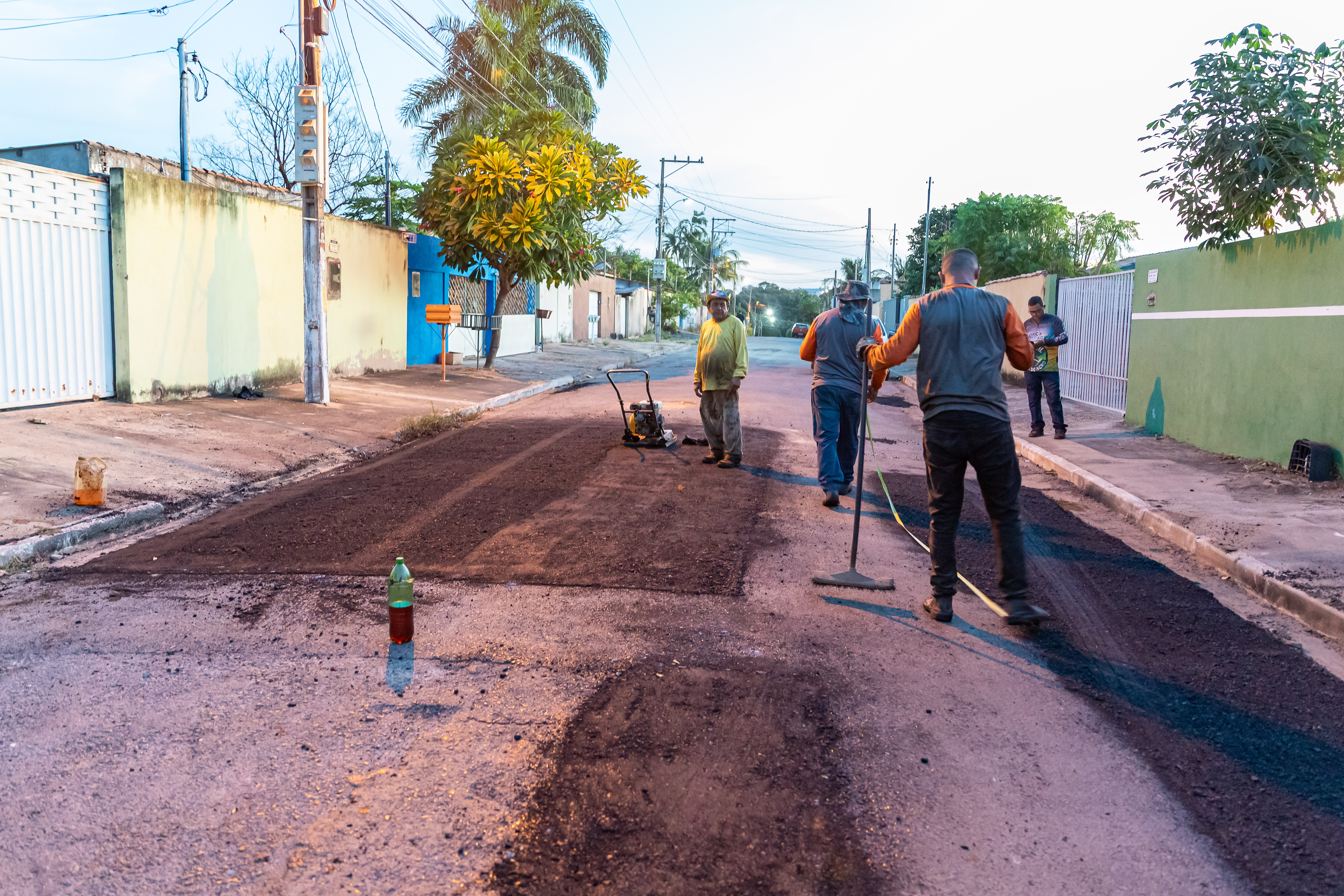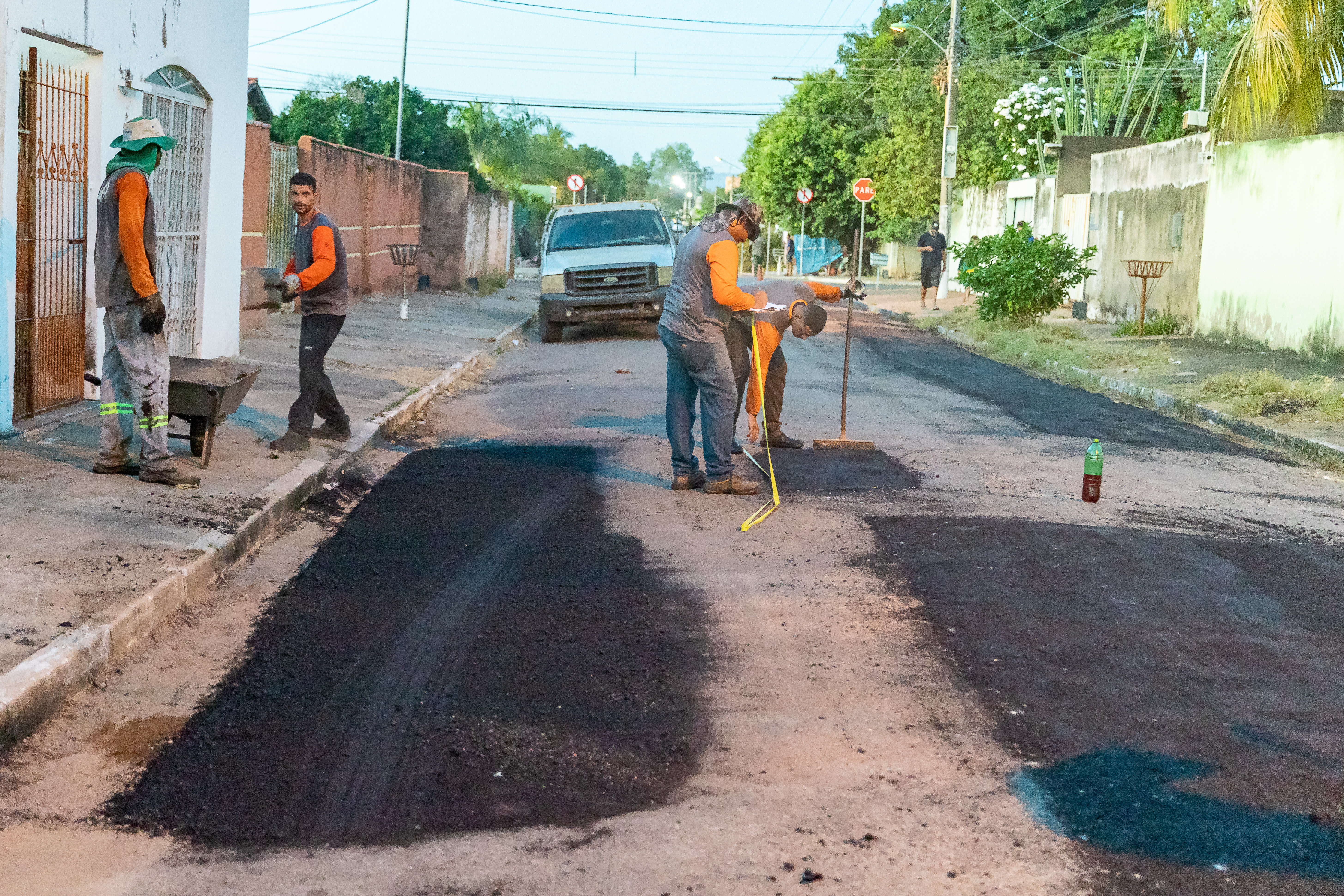 A imagem mostra trabalhadores da Secretaria Municipal de Obras Públicas realizando o serviço de tapa-buraco no bairro Jardim dos Ipês.