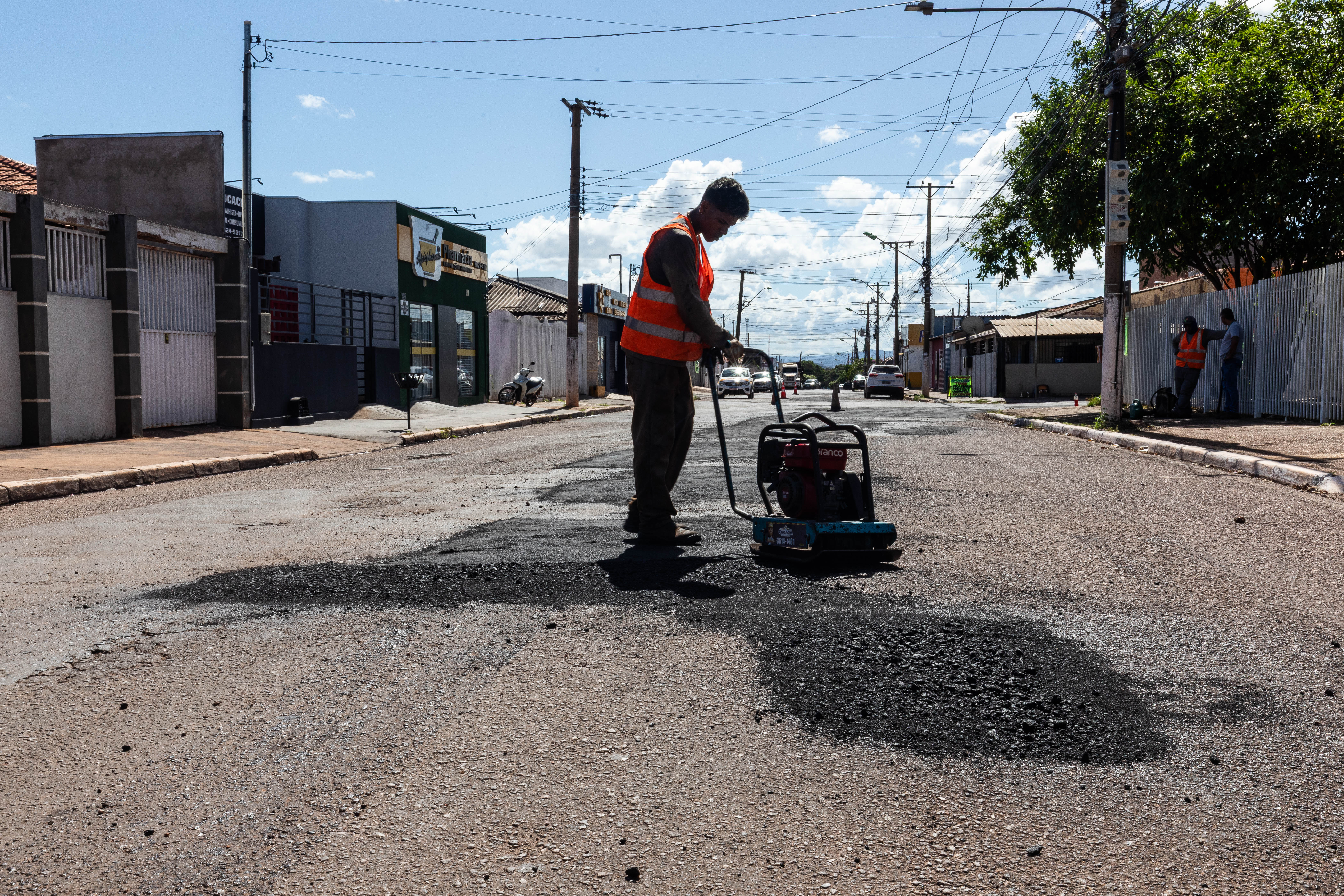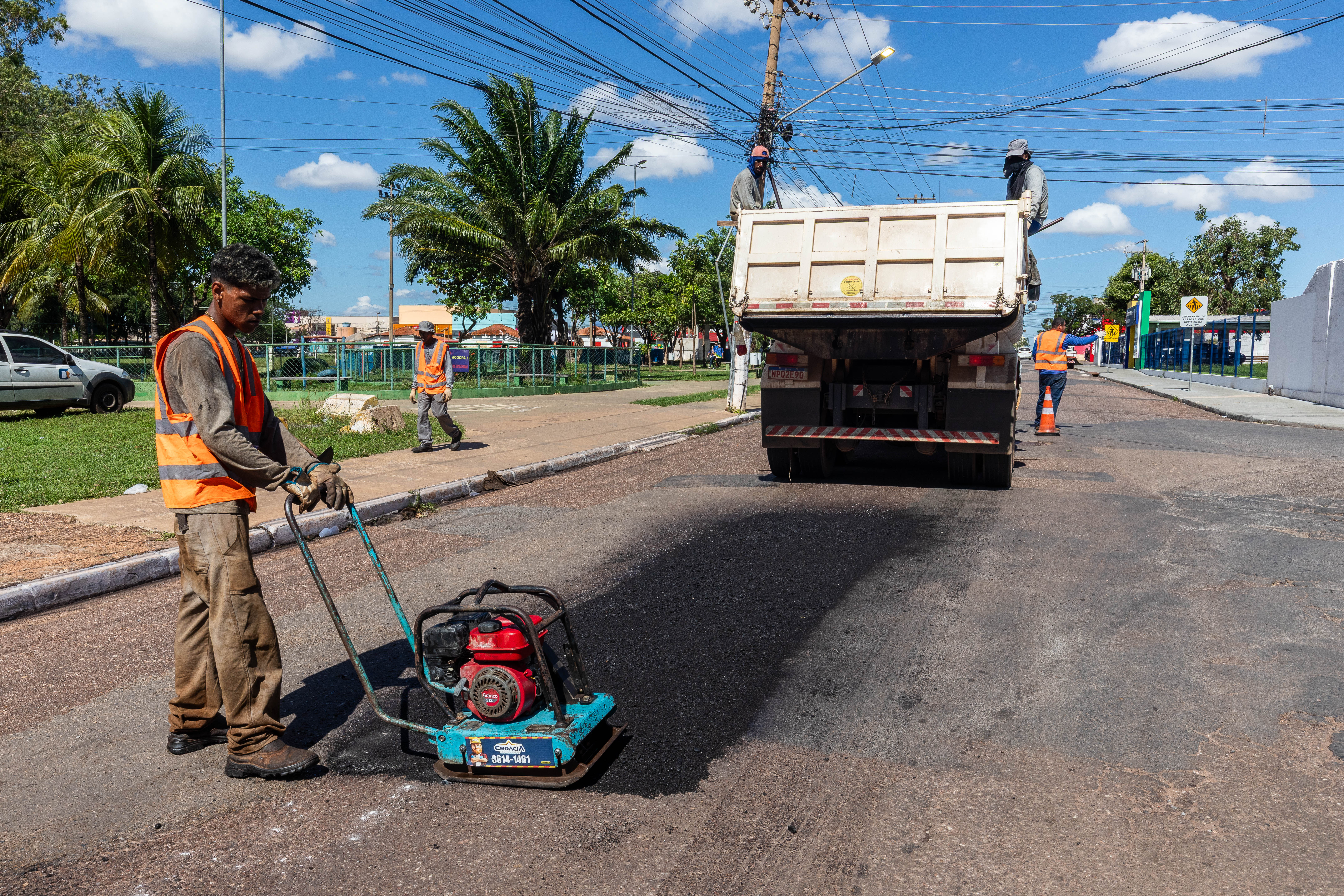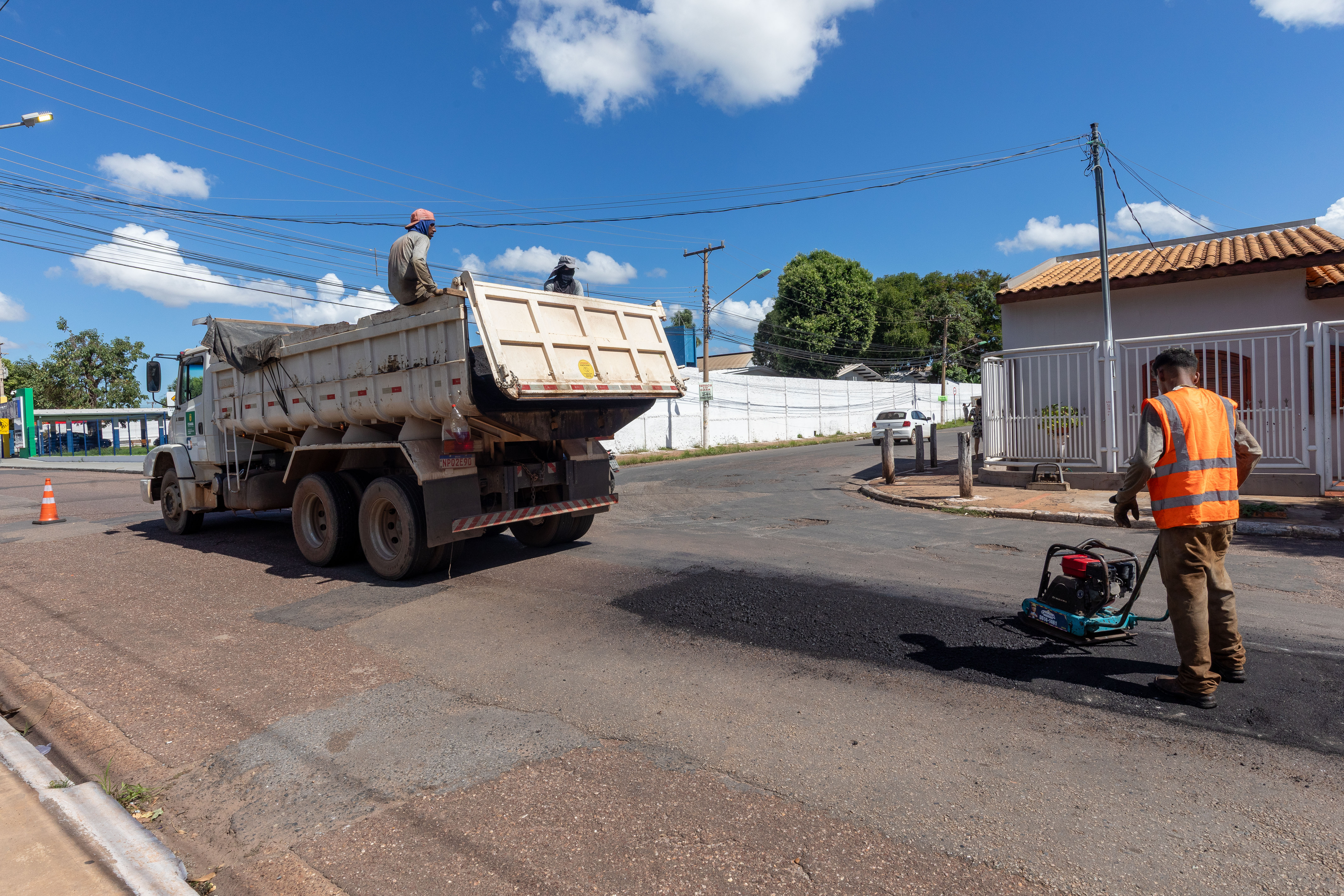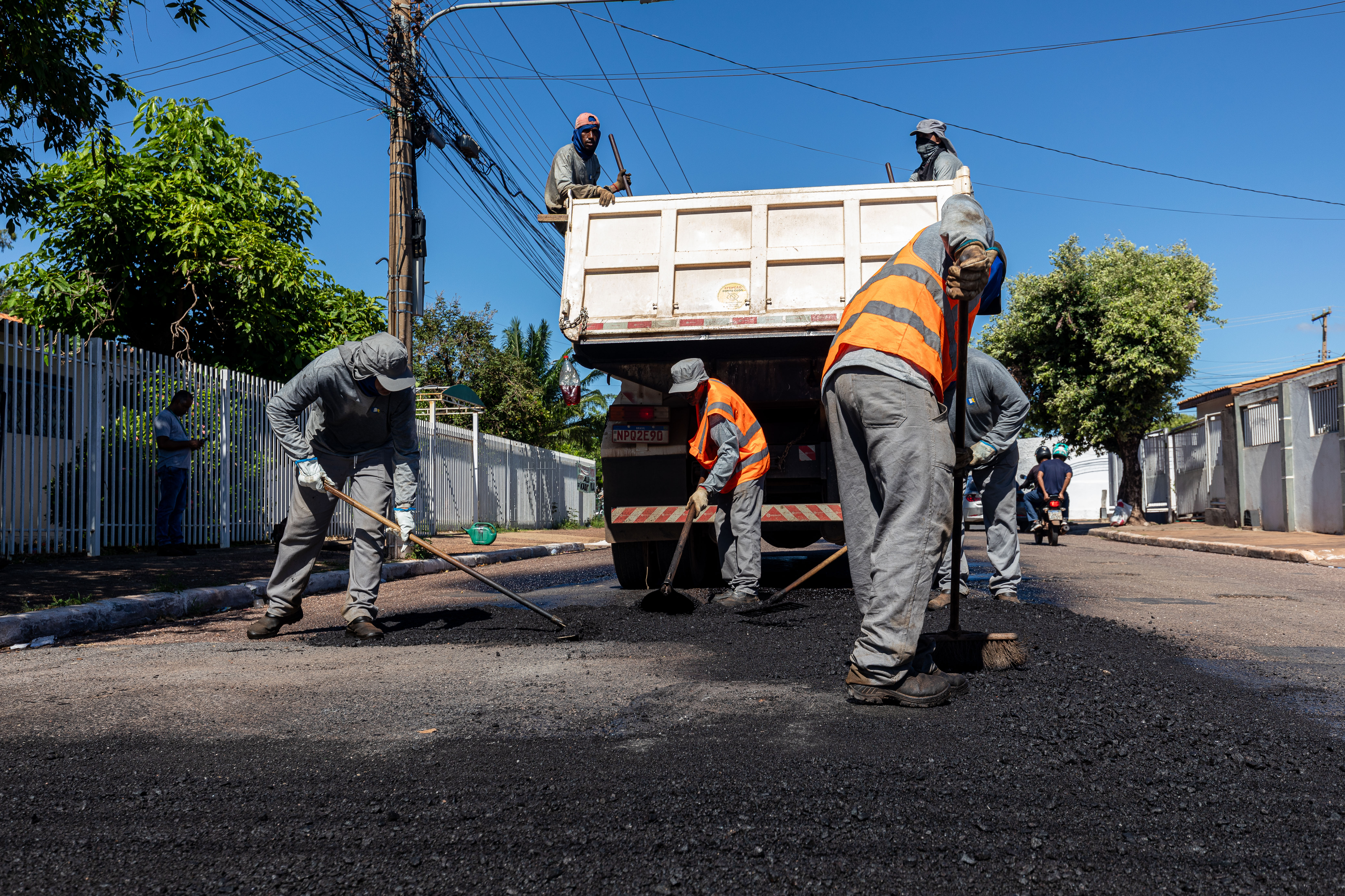 A imagem mostra as equipes da Secretaria Municipal de Obras Públicas realizando a operação tapa-buraco no bairro CPA II.