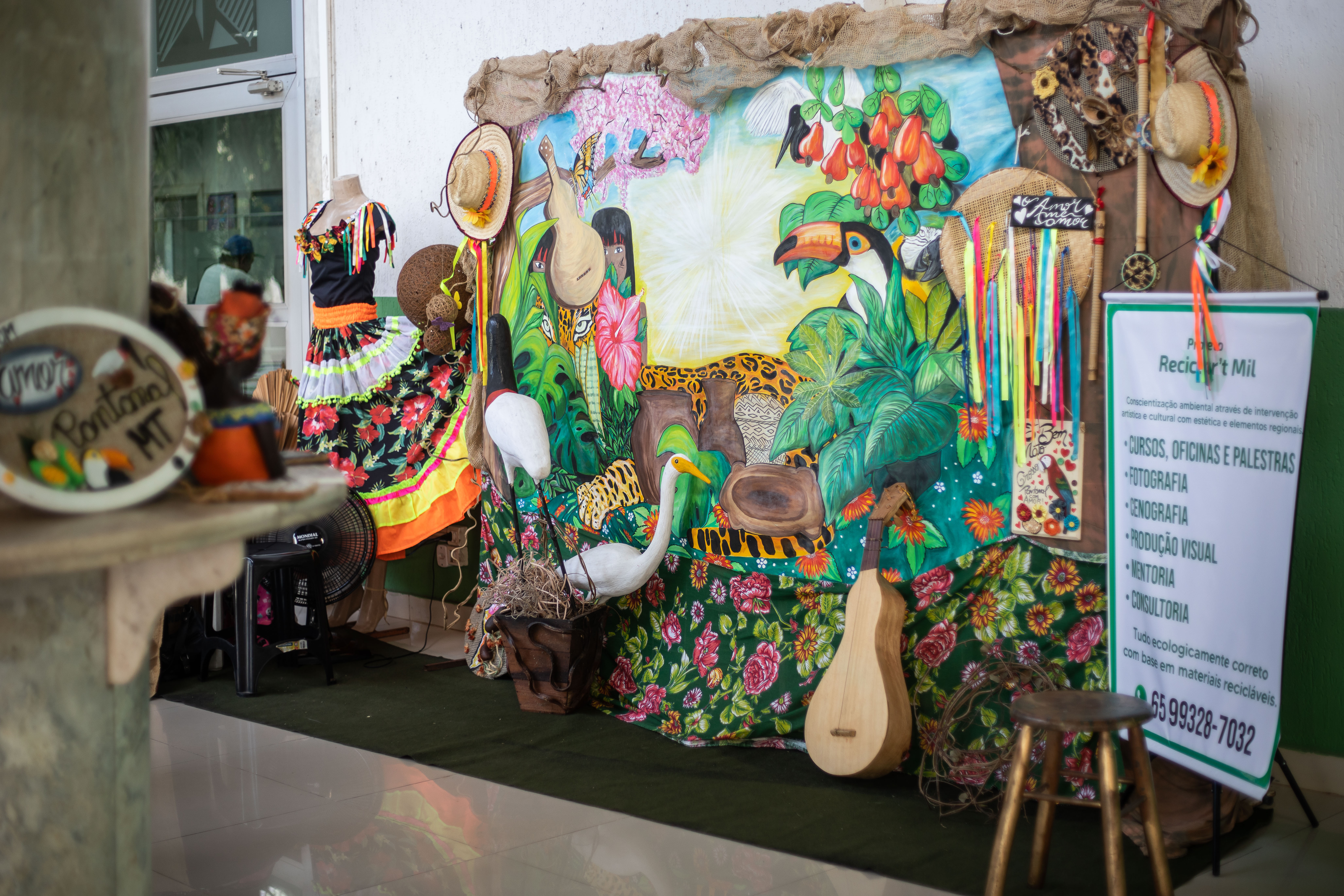 Quem passa pela Prefeitura de Cuiabá, no Palácio Alencastro, região central da capital, está tendo a oportunidade de conhecer um pouco sobre o projeto Reciclart Mil, que ganhou como tema especial nesta edição "Meio Ambiente Sou Eu". No saguão principal do prédio, foi montado um cenário tipicamente regional, com artigos da cuiabania, todos produzidos com materiais reciclados, onde as pessoas são convidadas a registrar o momento por meio de um ensaio fotográfico regional, em comemoração ao aniversário de 305 anos da cidade.
