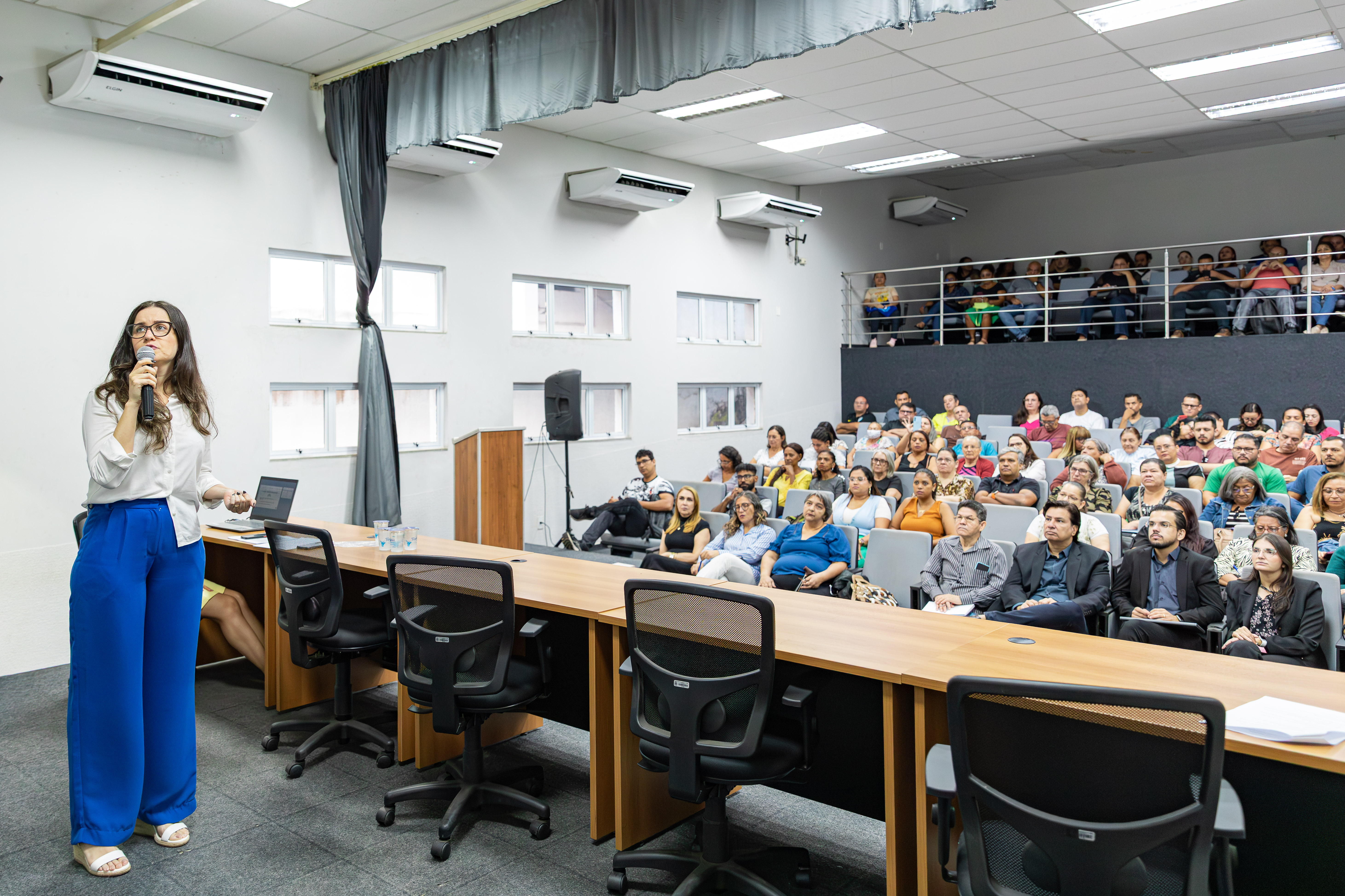 A foto ilustra profissionais da educação sentados em cadeiras almofadadas em um auditório. Uma mulher de pele branca, vestindo blusa branca e calça azul, fala ao microfone enquanto observa uma tela.