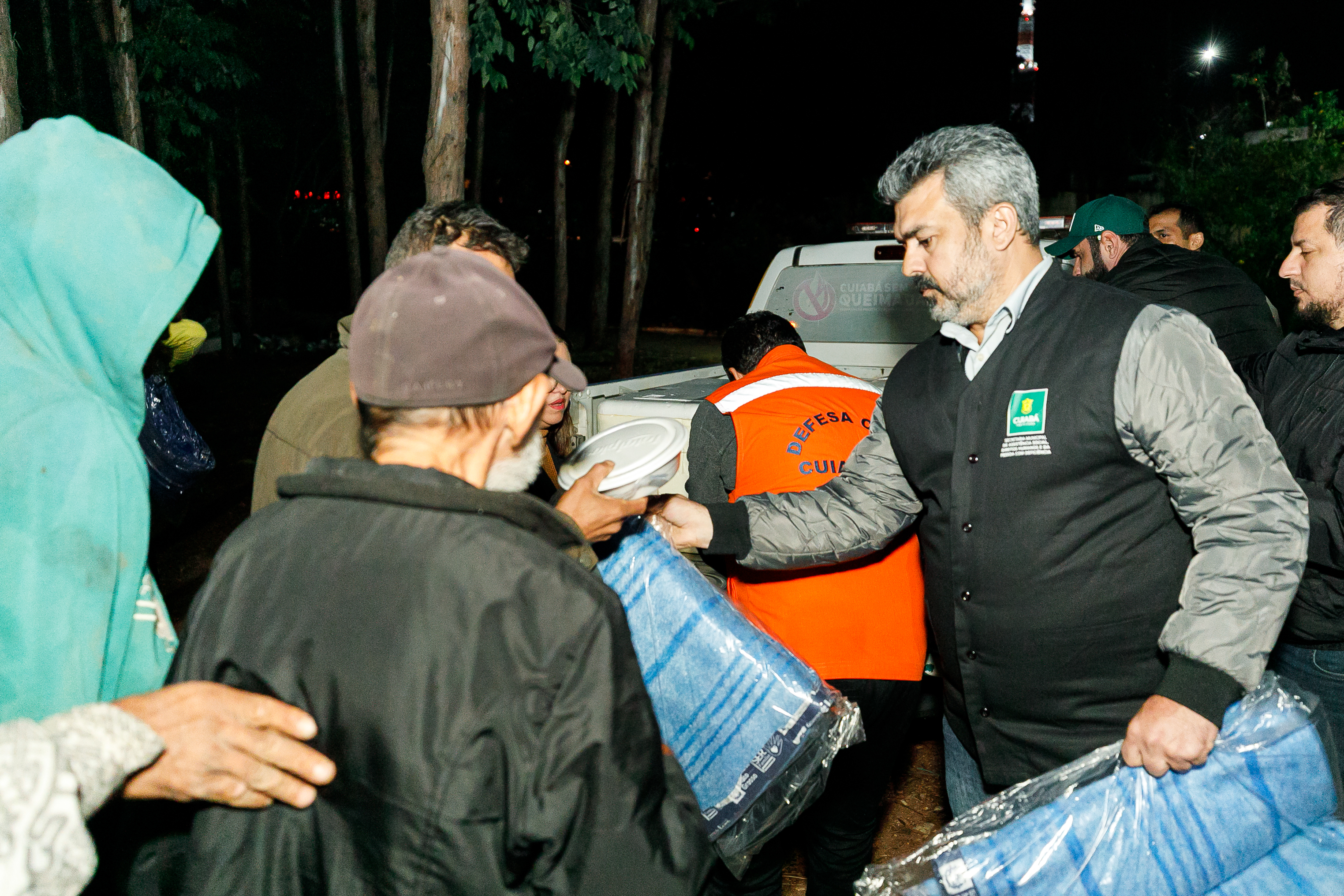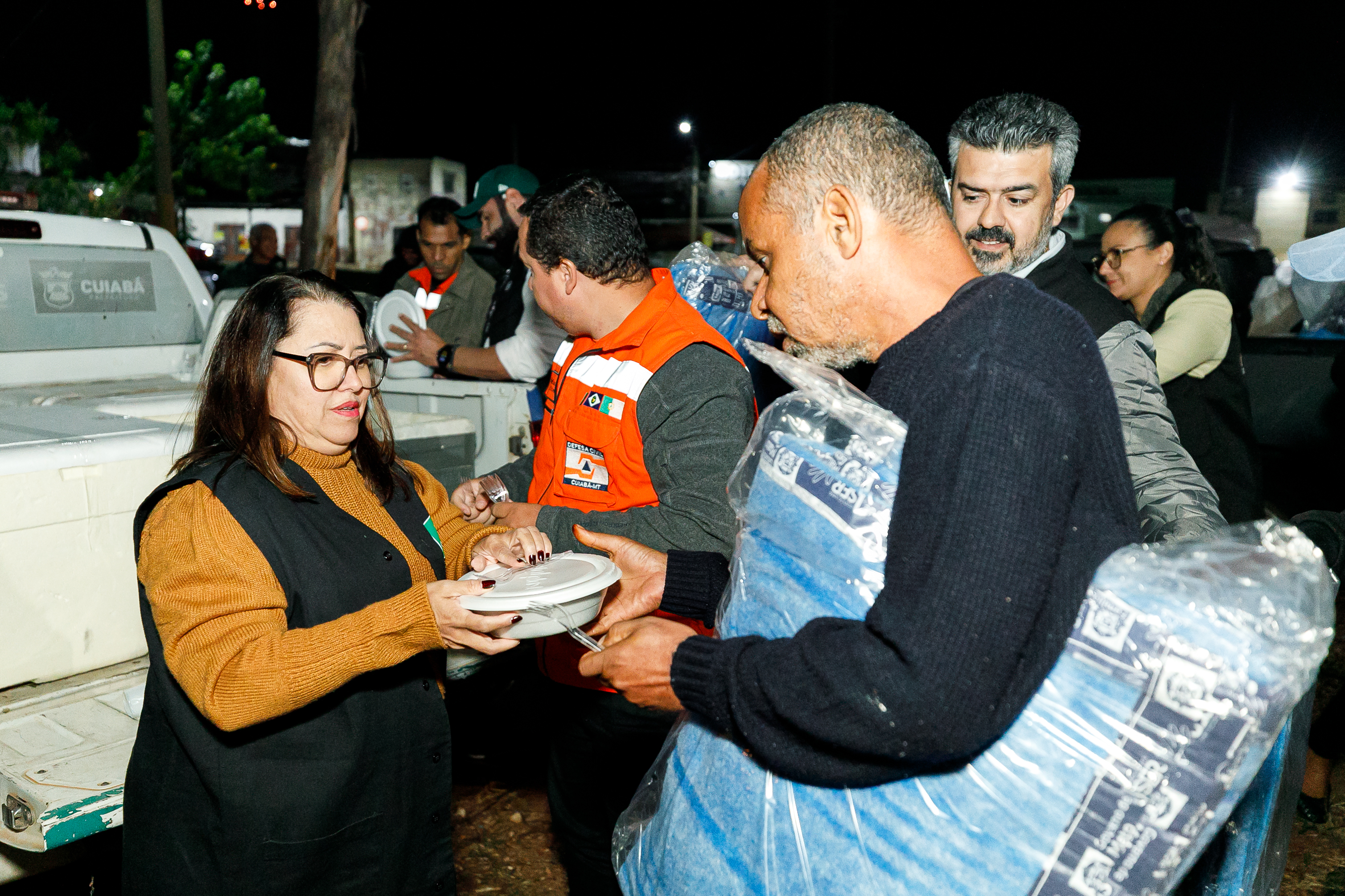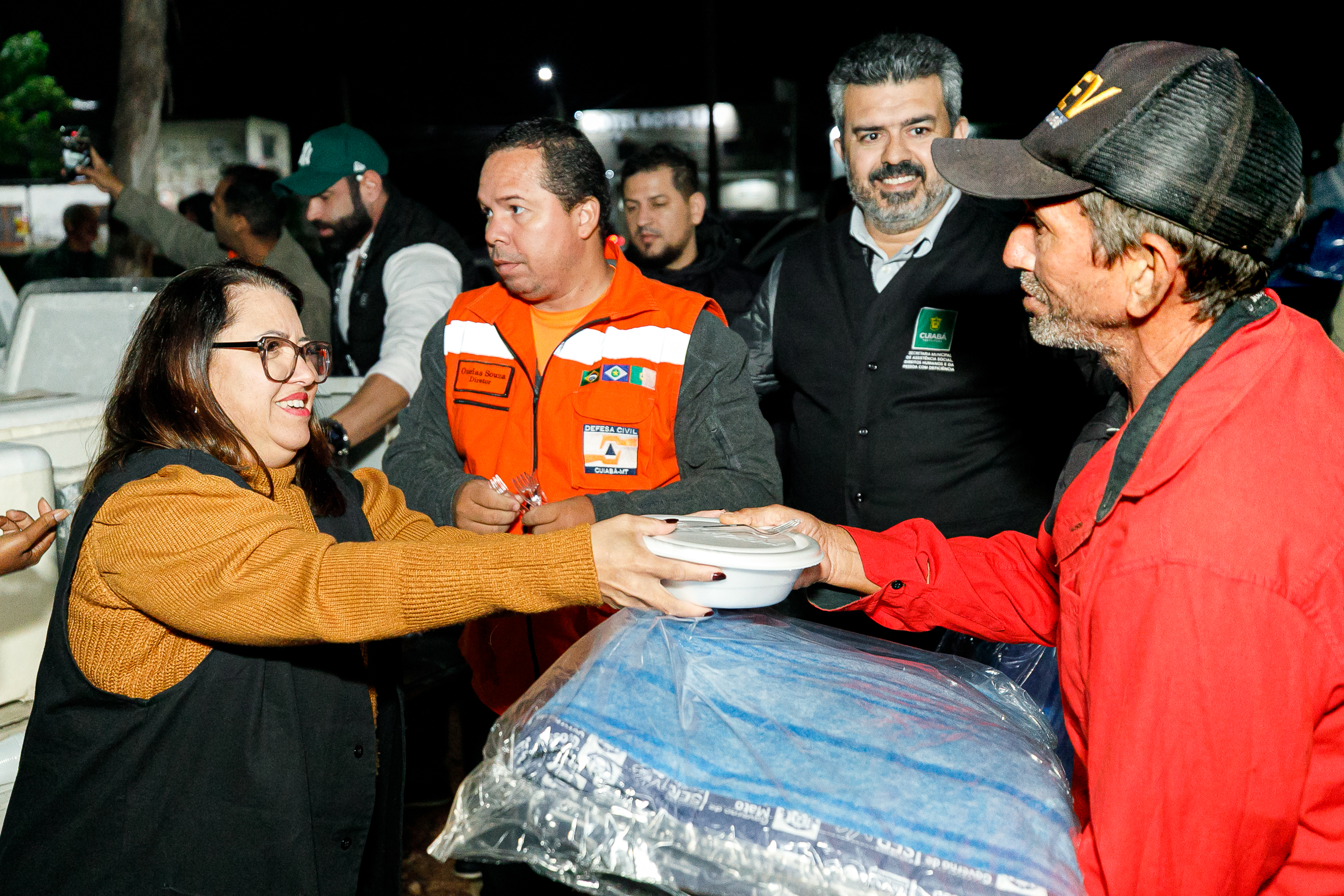 Diante da queda nas temperaturas registradas nos últimos dias, a Prefeitura de Cuiabá intensificou as ações de acolhimento à população em situação de rua. Na noite desta quinta-feira (29), equipes da Secretaria Municipal de Assistência Social, Direitos Humanos e da Inclusão, em parceria com a Defesa Civil Municipal e o Governo do Estado, realizaram a entrega de 200 marmitas e 150 cobertores em sete pontos críticos da capital.