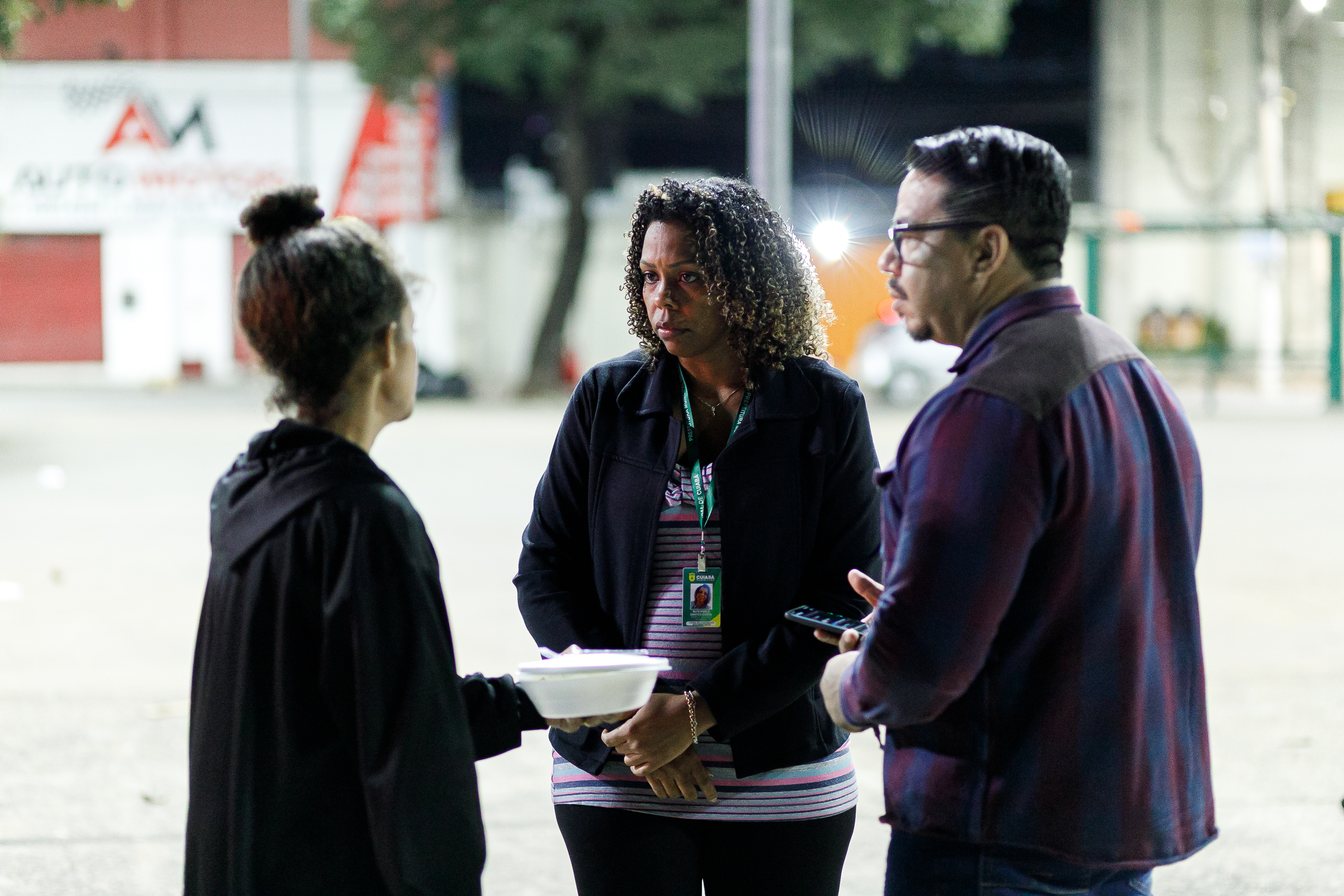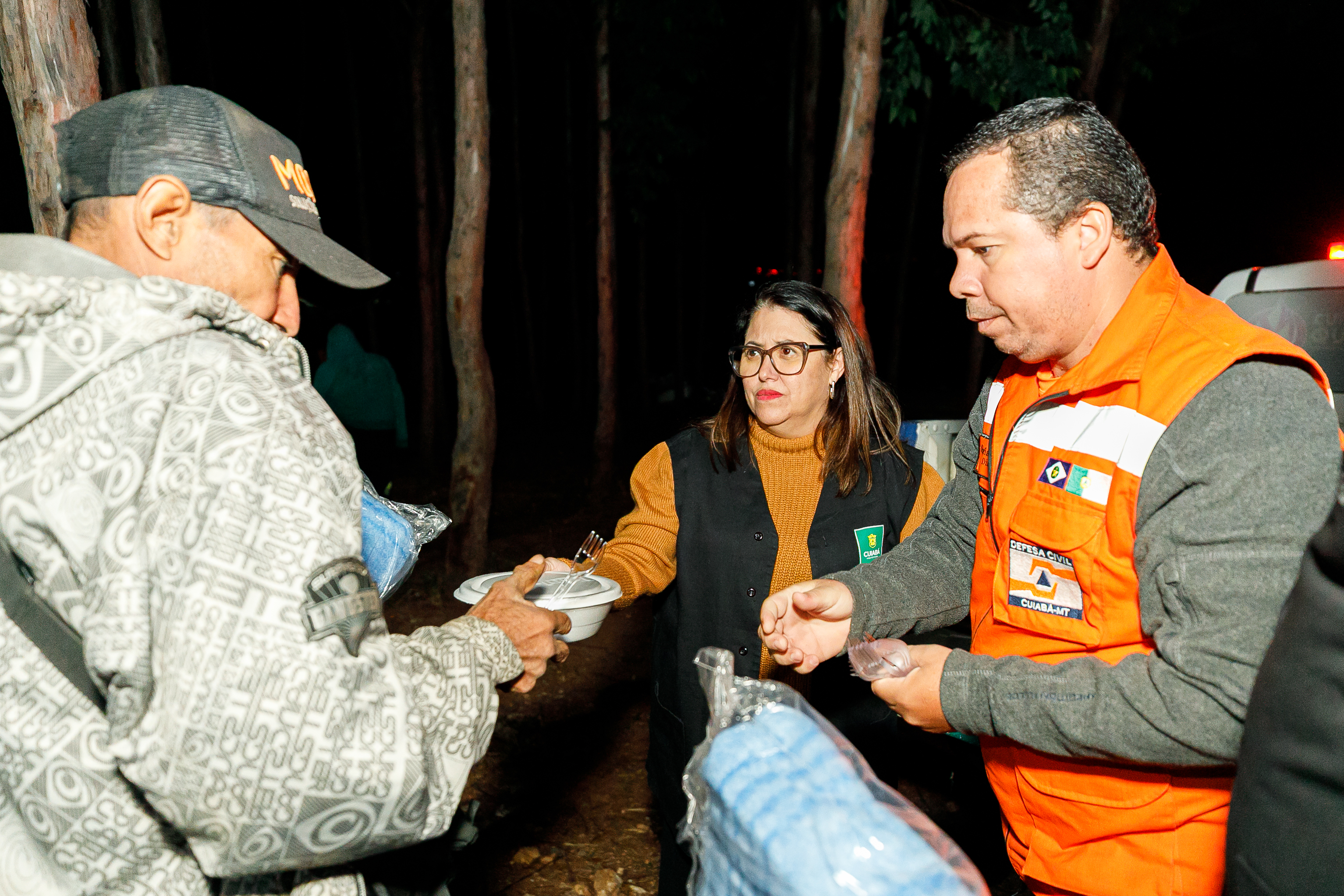 A imagem mostra a secretária de Assistência Social, Direitos Humanos e da Inclusão, Hélida Vilela, o secretário-adjunto de Inclusão, Andríco Xavier, e o diretor da Defesa Civil, Ozeias Souza, entregando marmitas e cobertores a pessoas em situação de rua na Praça do Eucalipto, no bairro Consil, durante ação emergencial de acolhimento promovida pela Prefeitura de Cuiabá.