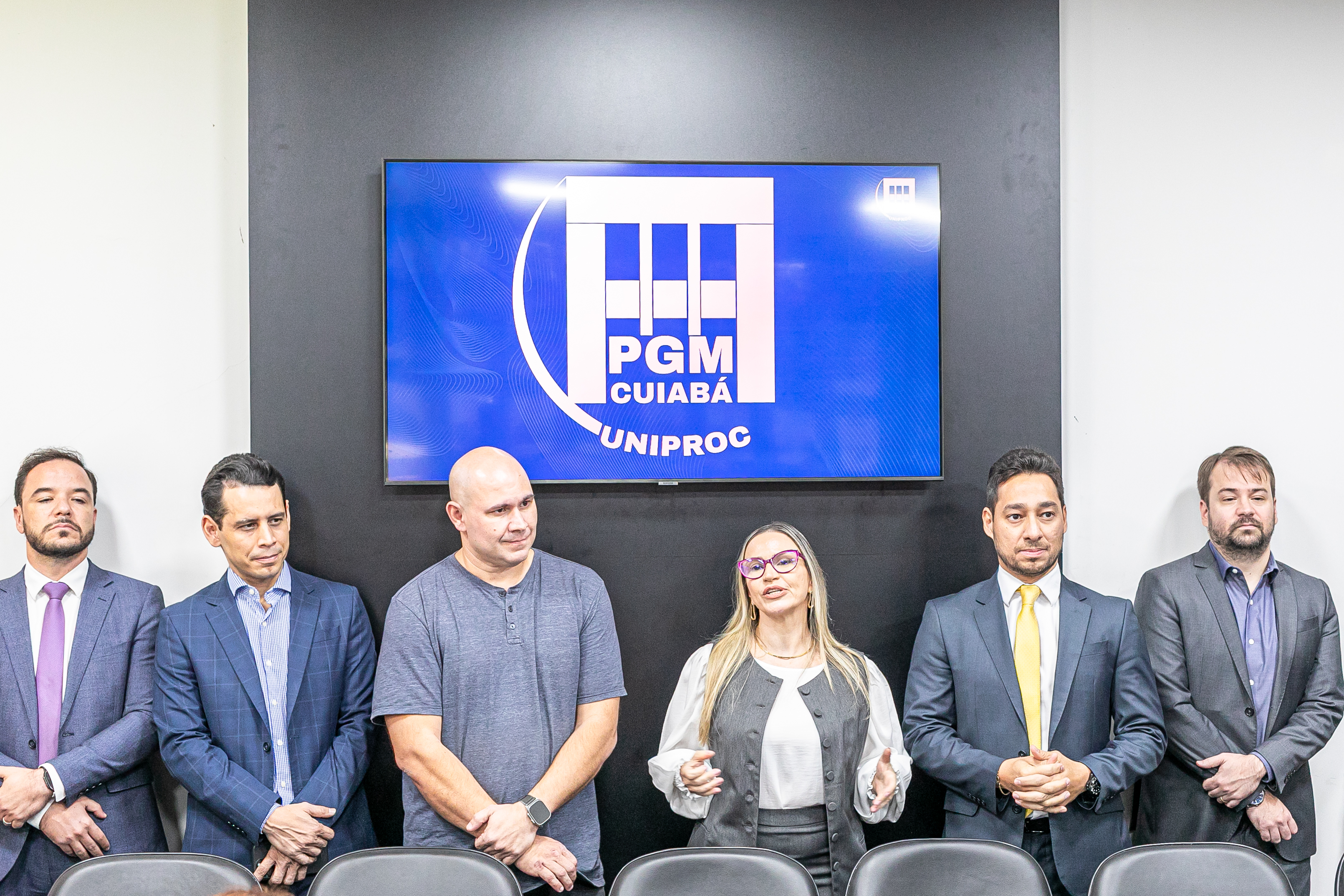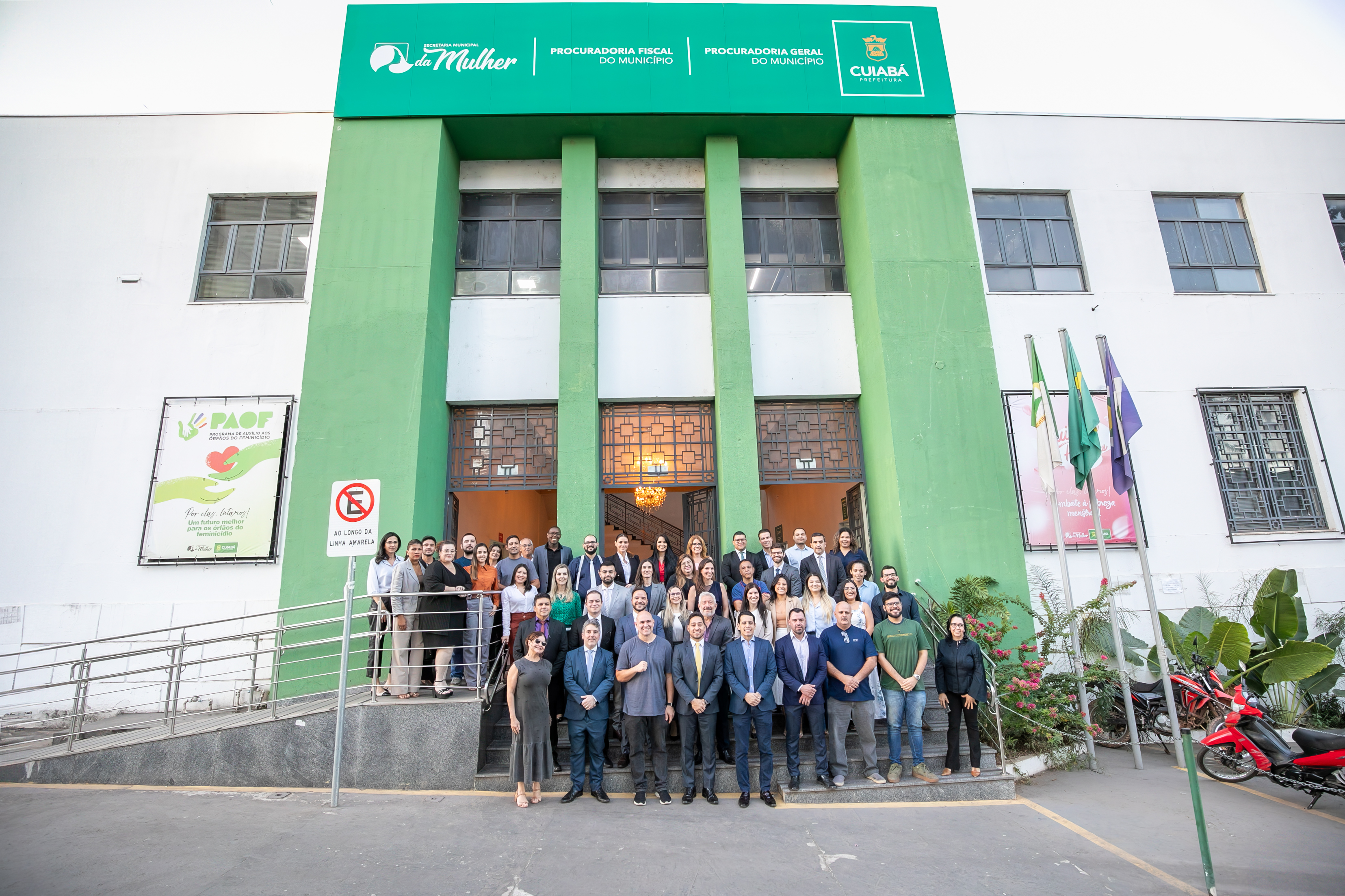 A foto ilustra o prefeito de Cuiabá, Abilio Brunini, o procurador Luiz Antônio Araújo Junior, lado a lado, com diversos procuradores e servidores no fundo.