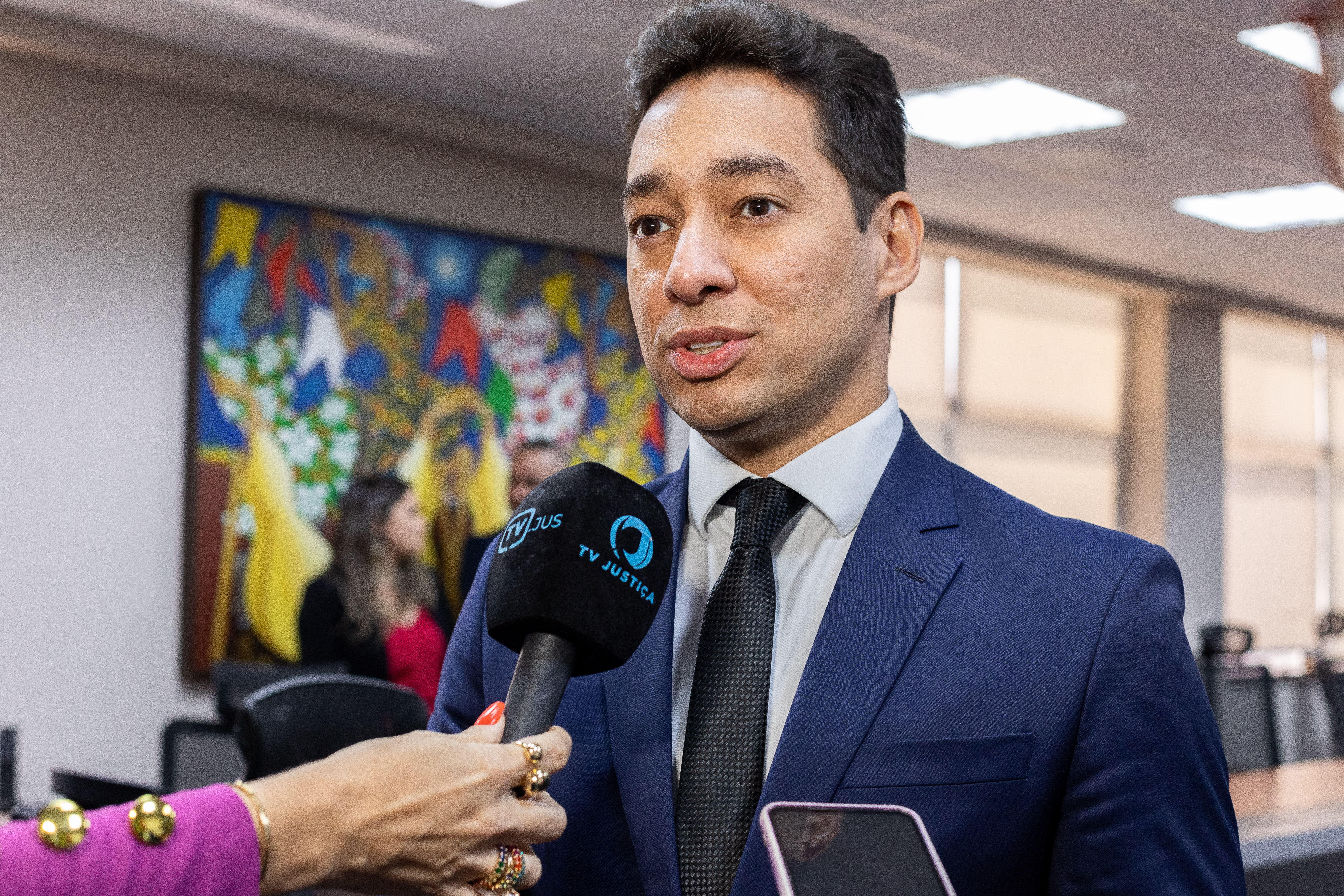 A foto ilustra o procurador geral do município, Luiz Antônio Araújo Júnior, concedendo entrevista a veículos de imprensa. Ele veste terno azul, blusa cinza e uma camisa preta.