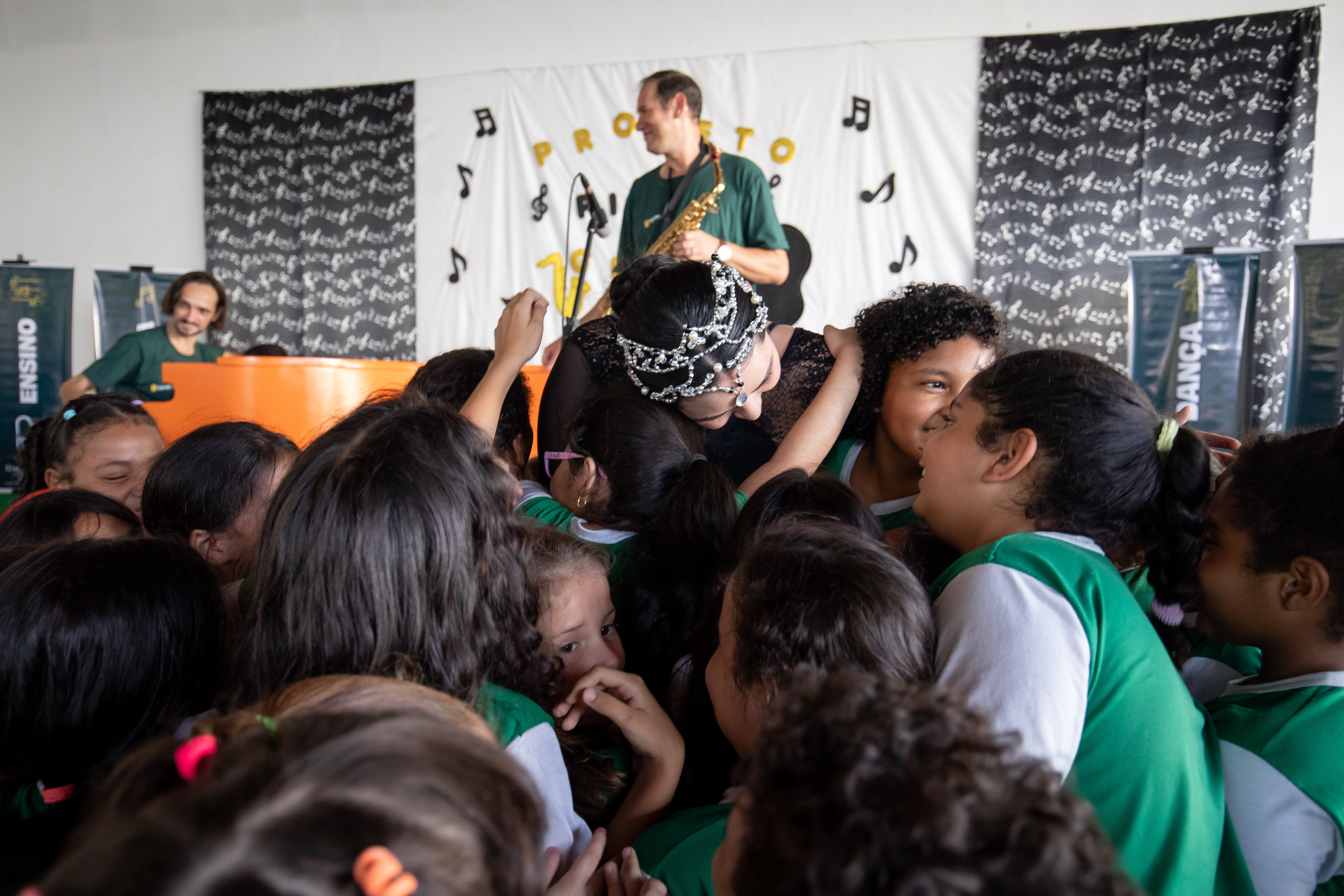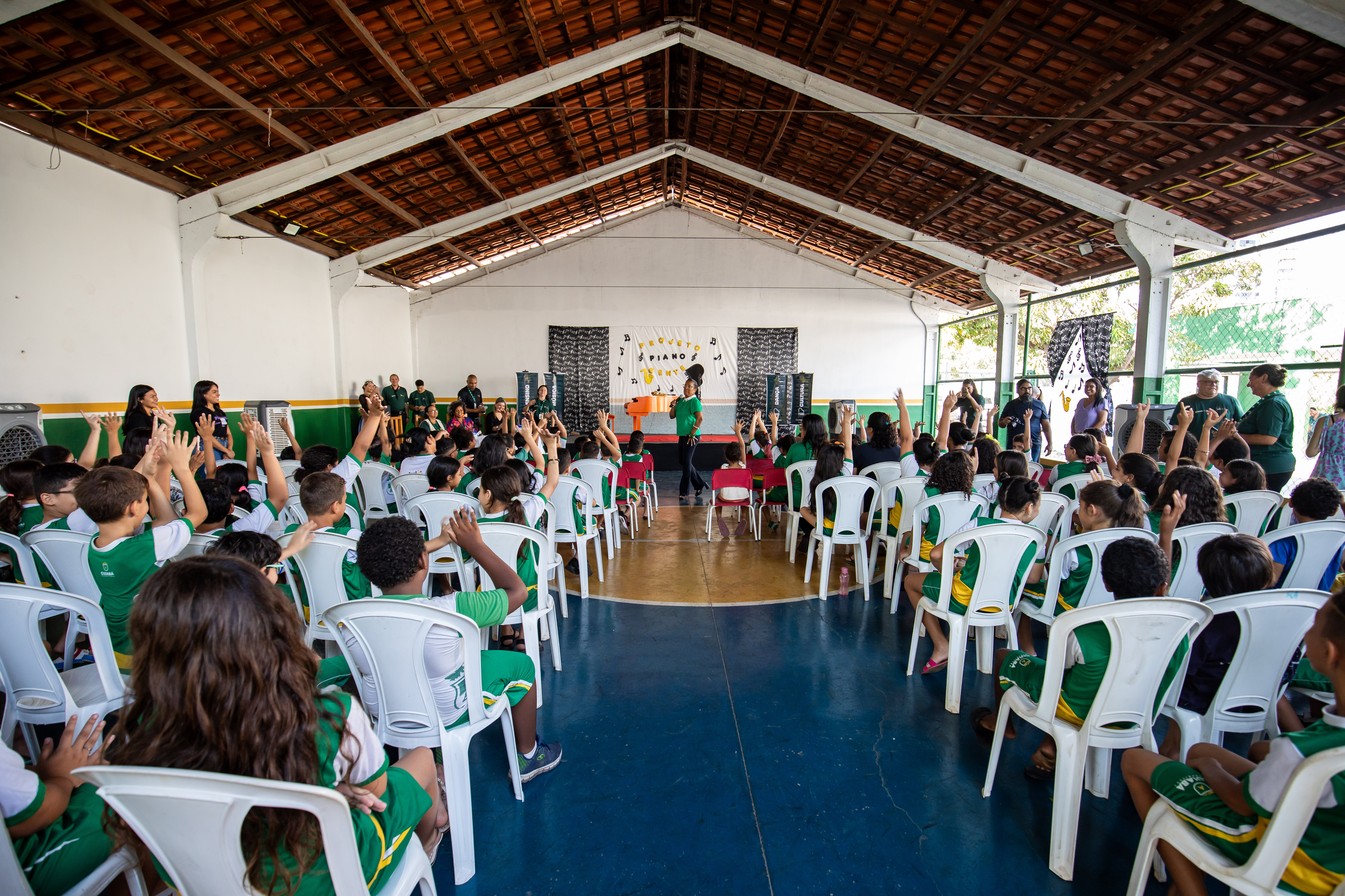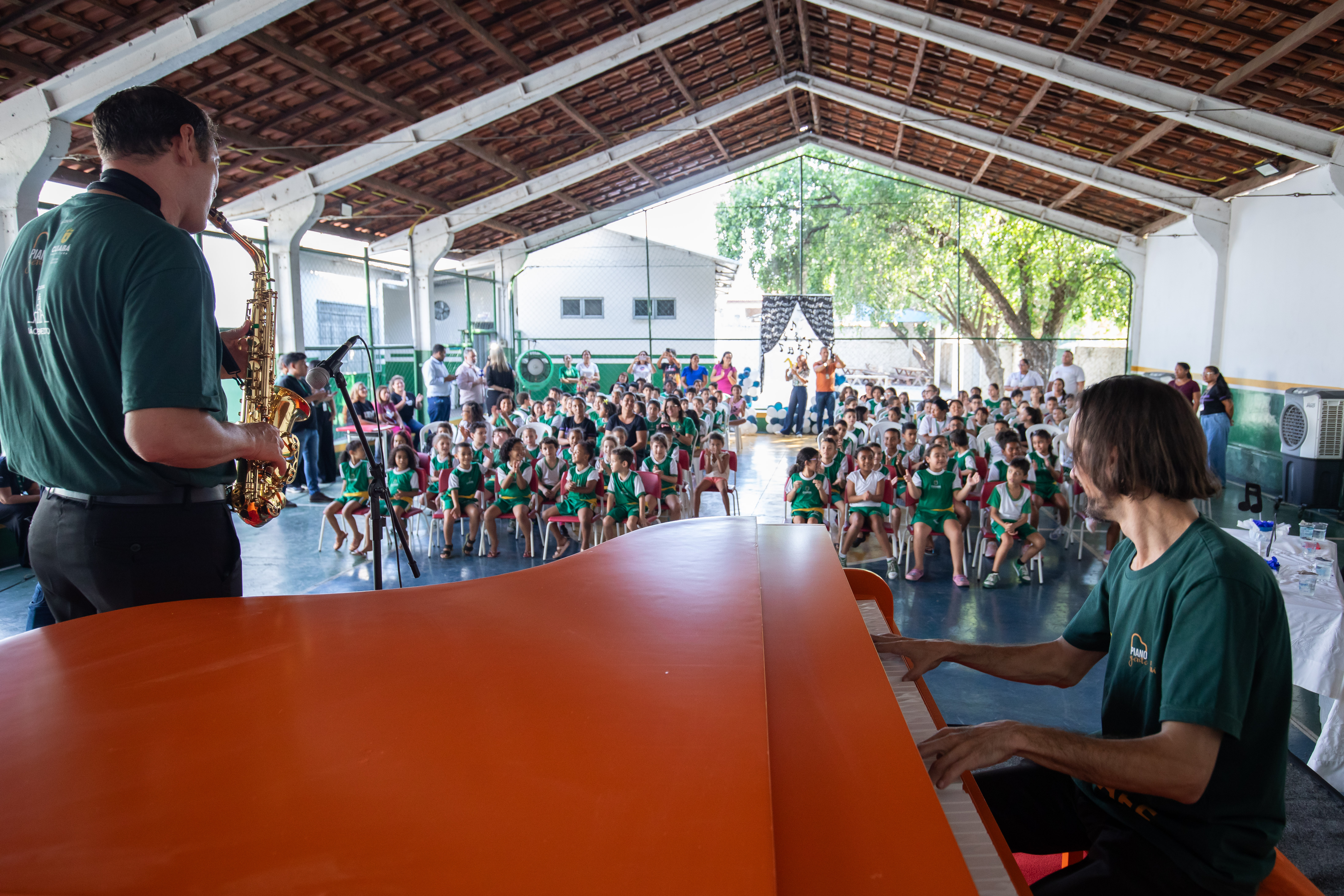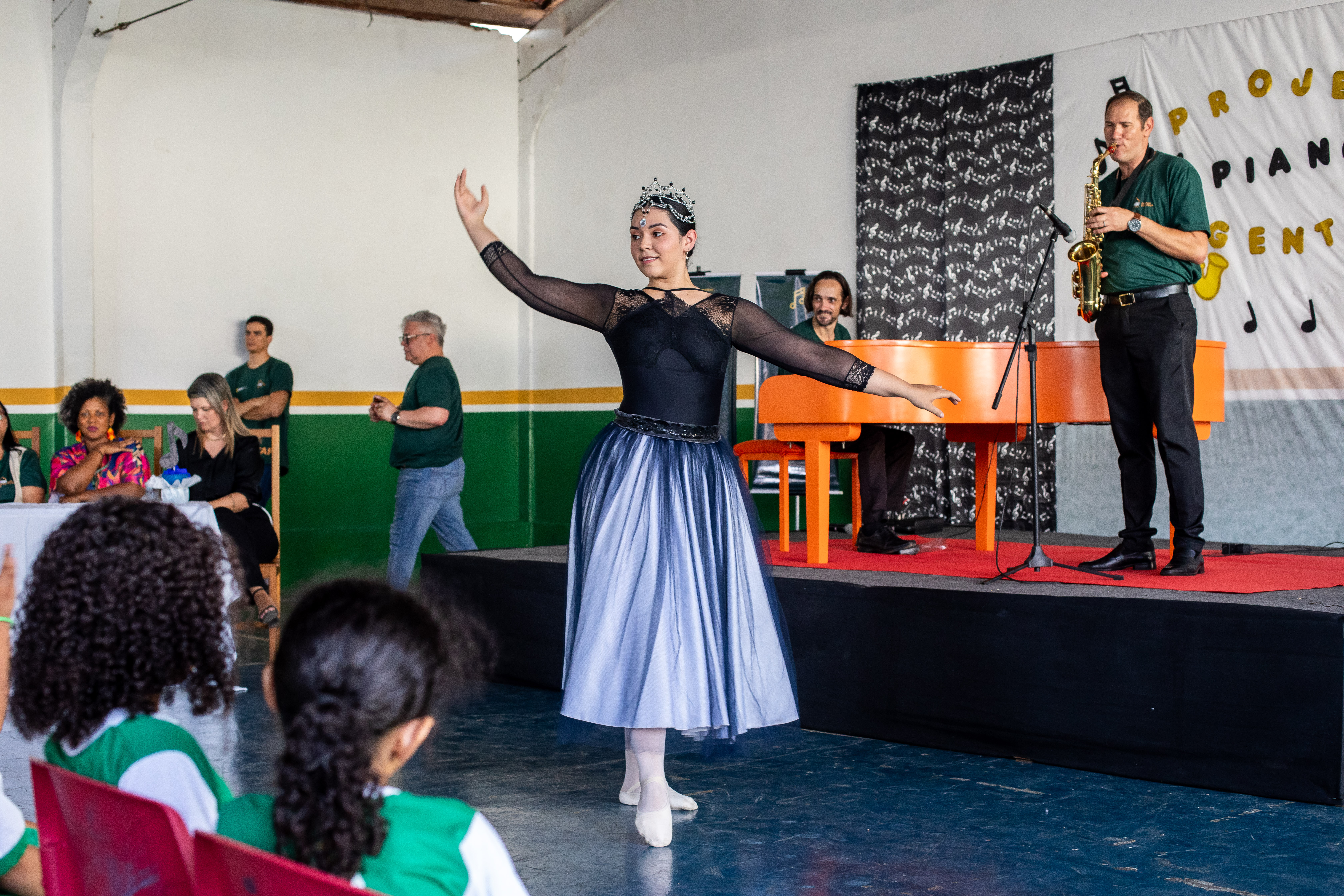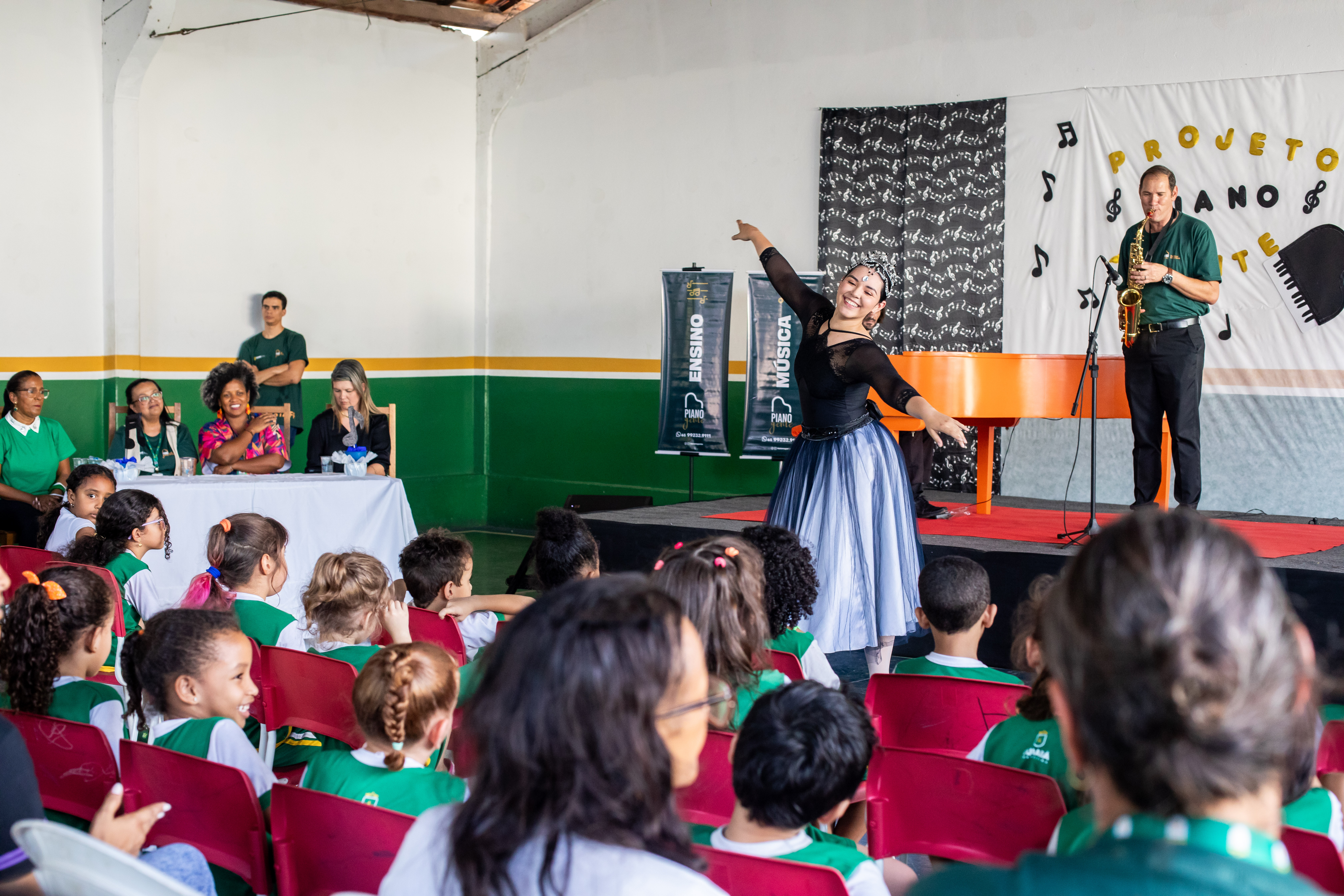 Oitenta crianças conferiram de perto a apresentação de clássicos infantis, nacionais e internacionais em piano e saxofone. Em seguida, houve a apresentação da bailarina Julia Fernandes, que acumula experiências em exibições nos grupos “Flor Ribeirinha” e “Flauta Mágica”.
