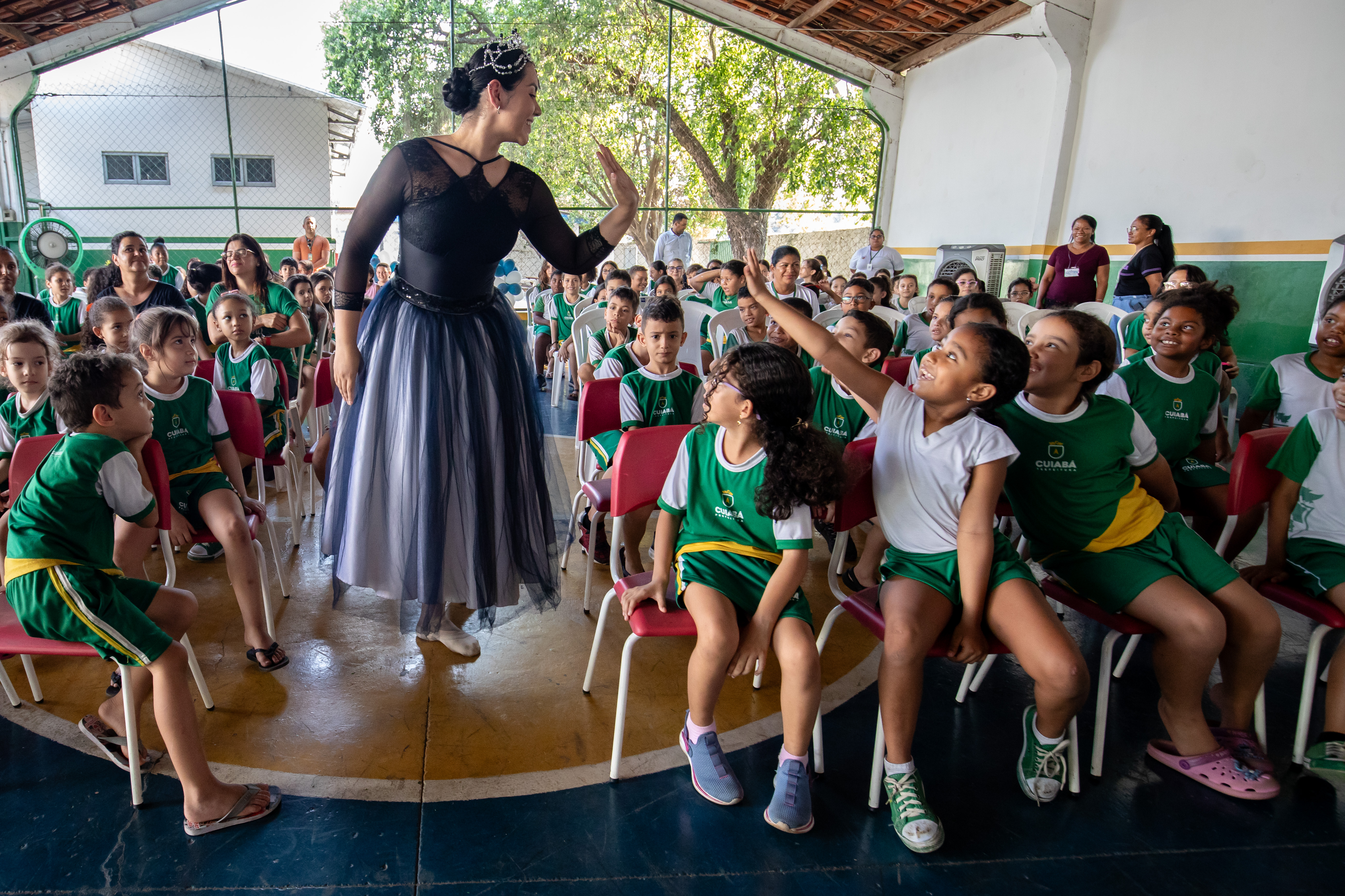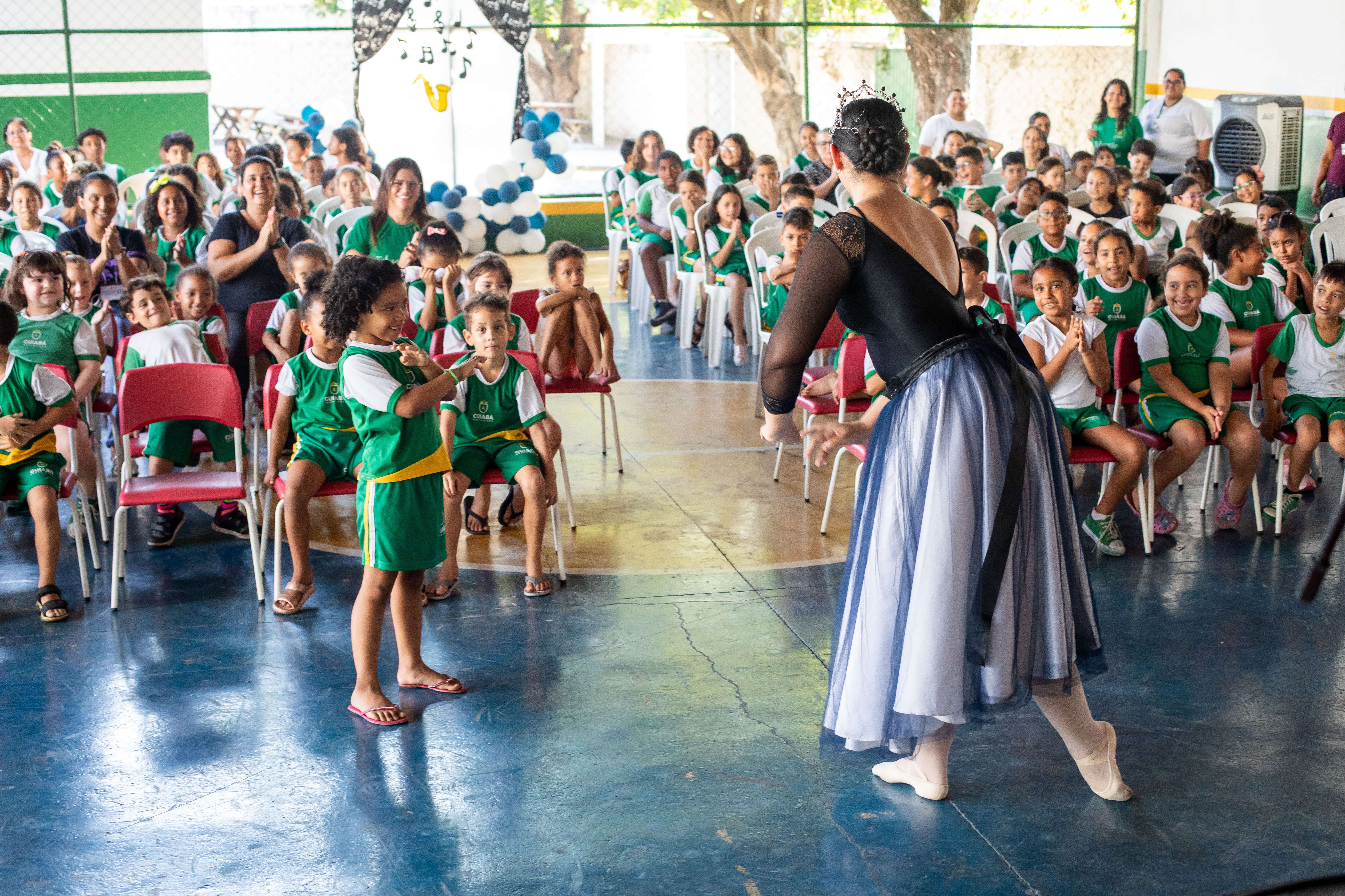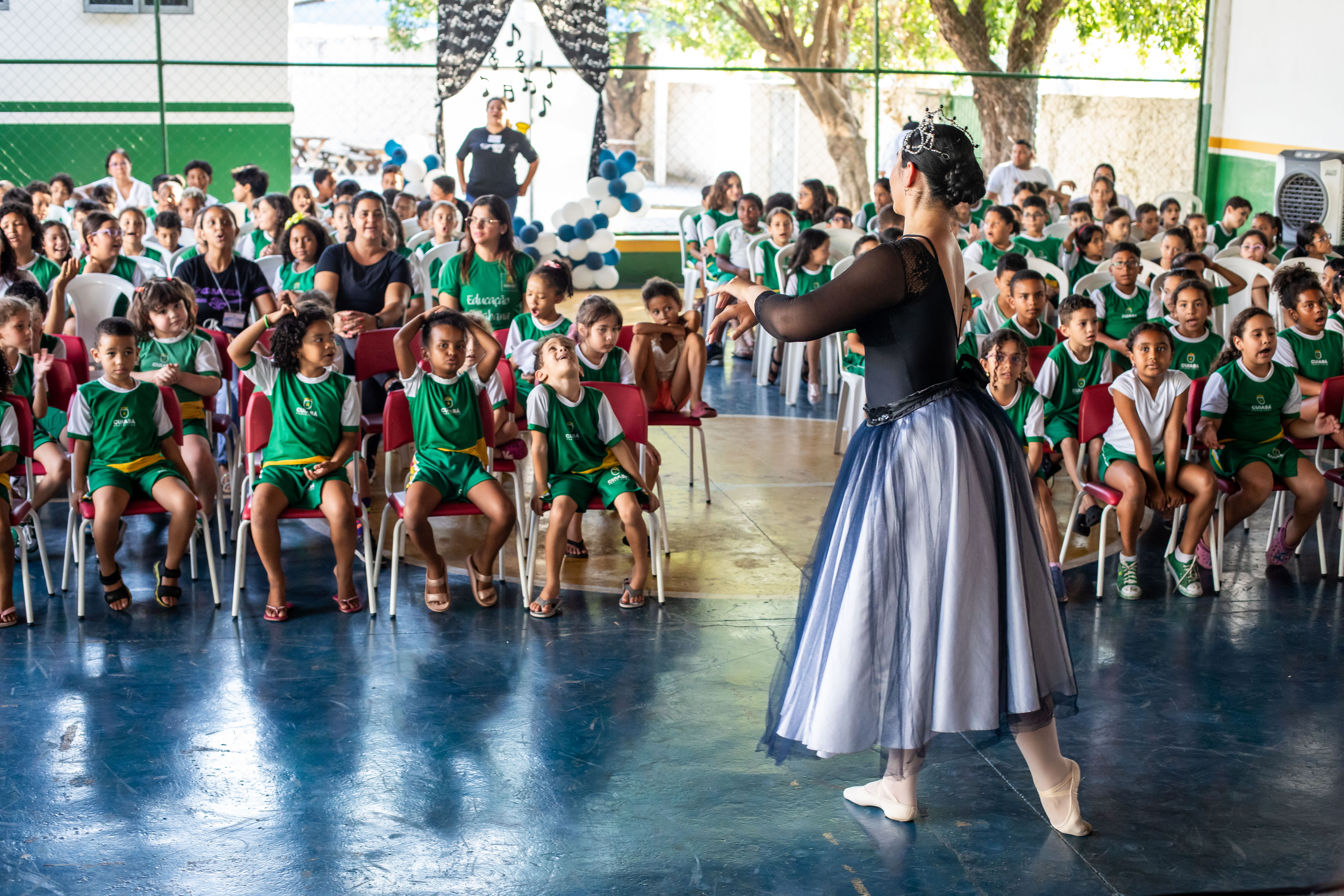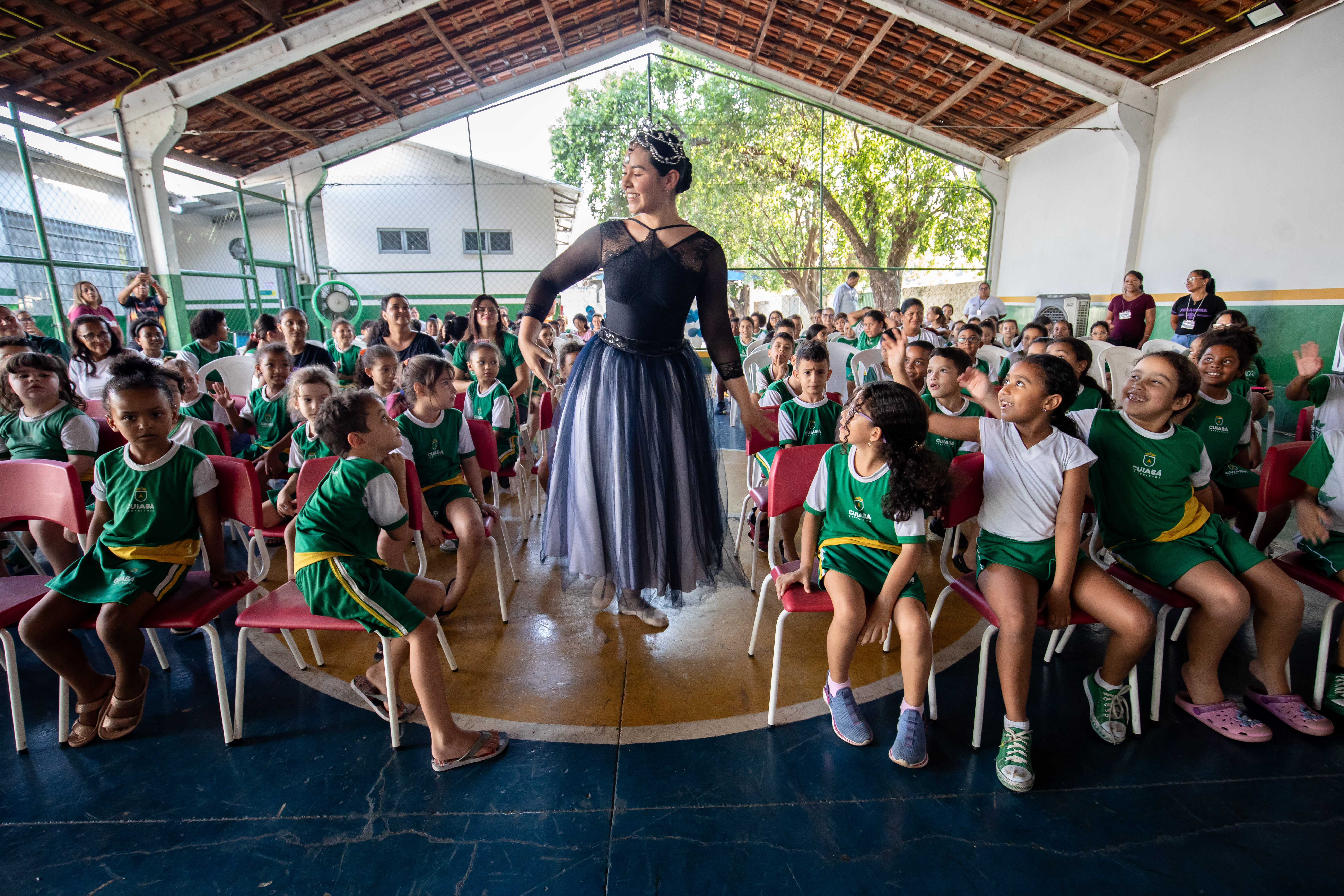 A foto ilustra uma bailarina dançando numa quadra esportiva de piso azul. No local, estão crianças sentadas em cadeiras, todas devidamente vestidas com uniforme oficial da Prefeitura de Cuiabá, prestando atenção na exibição da arte.