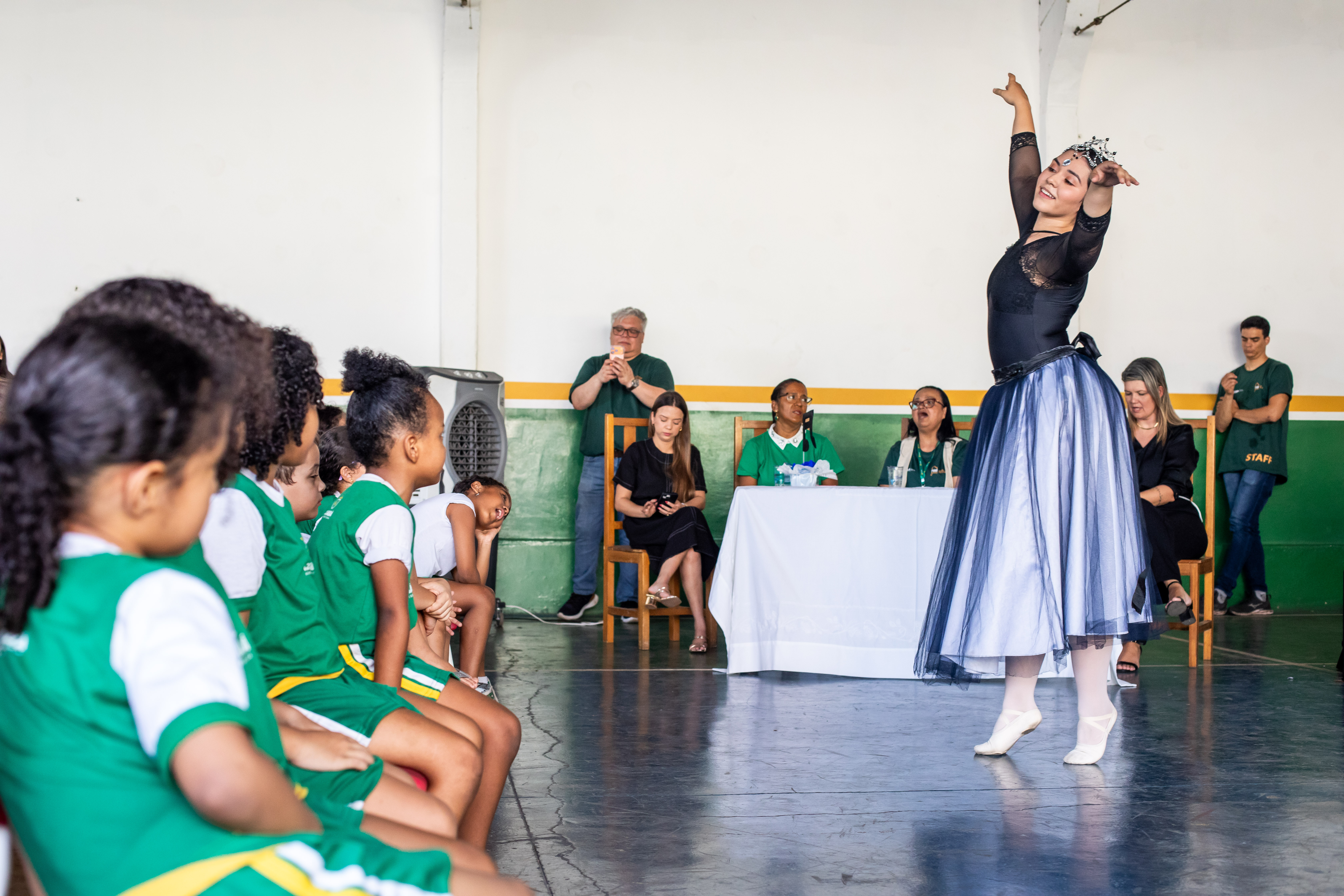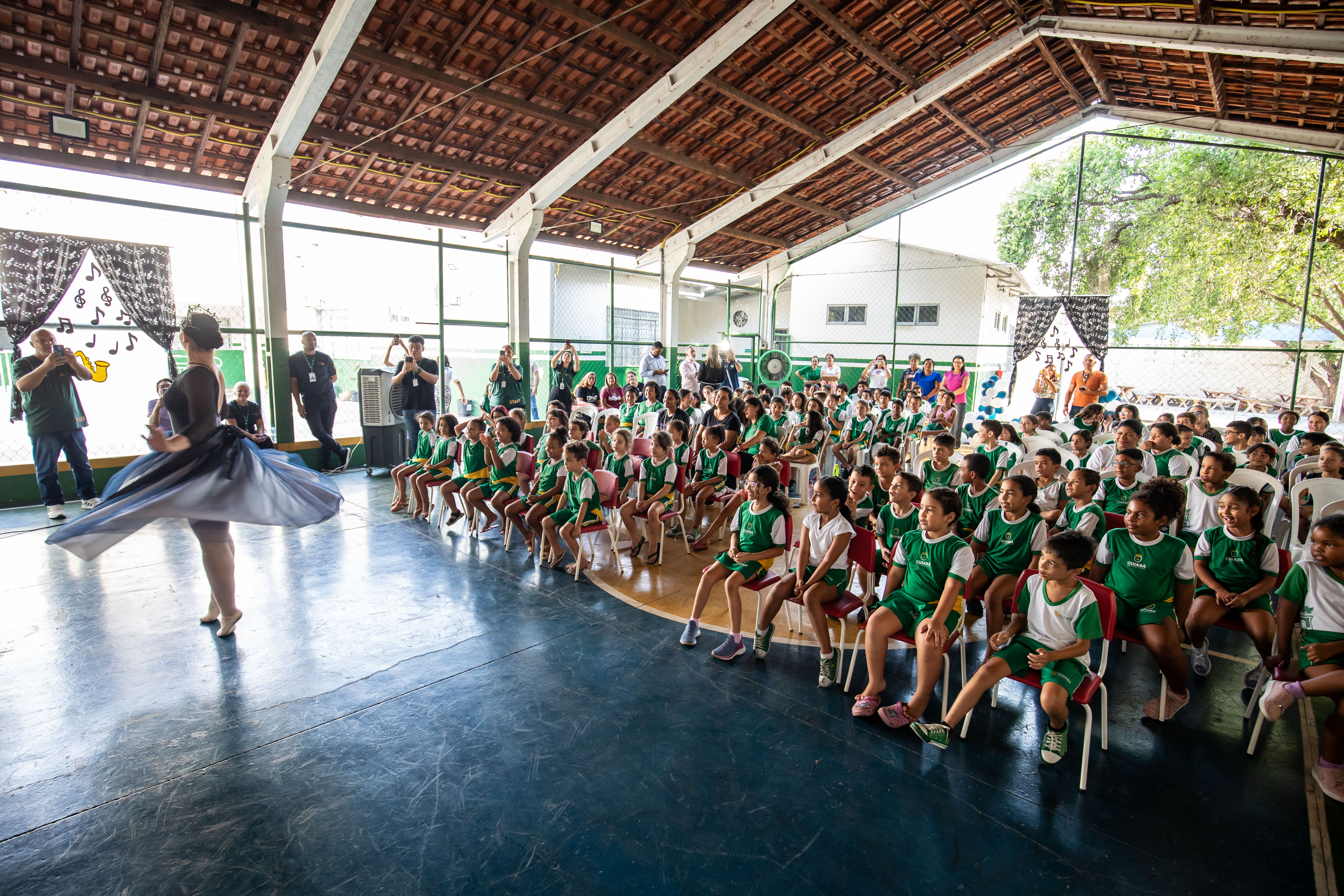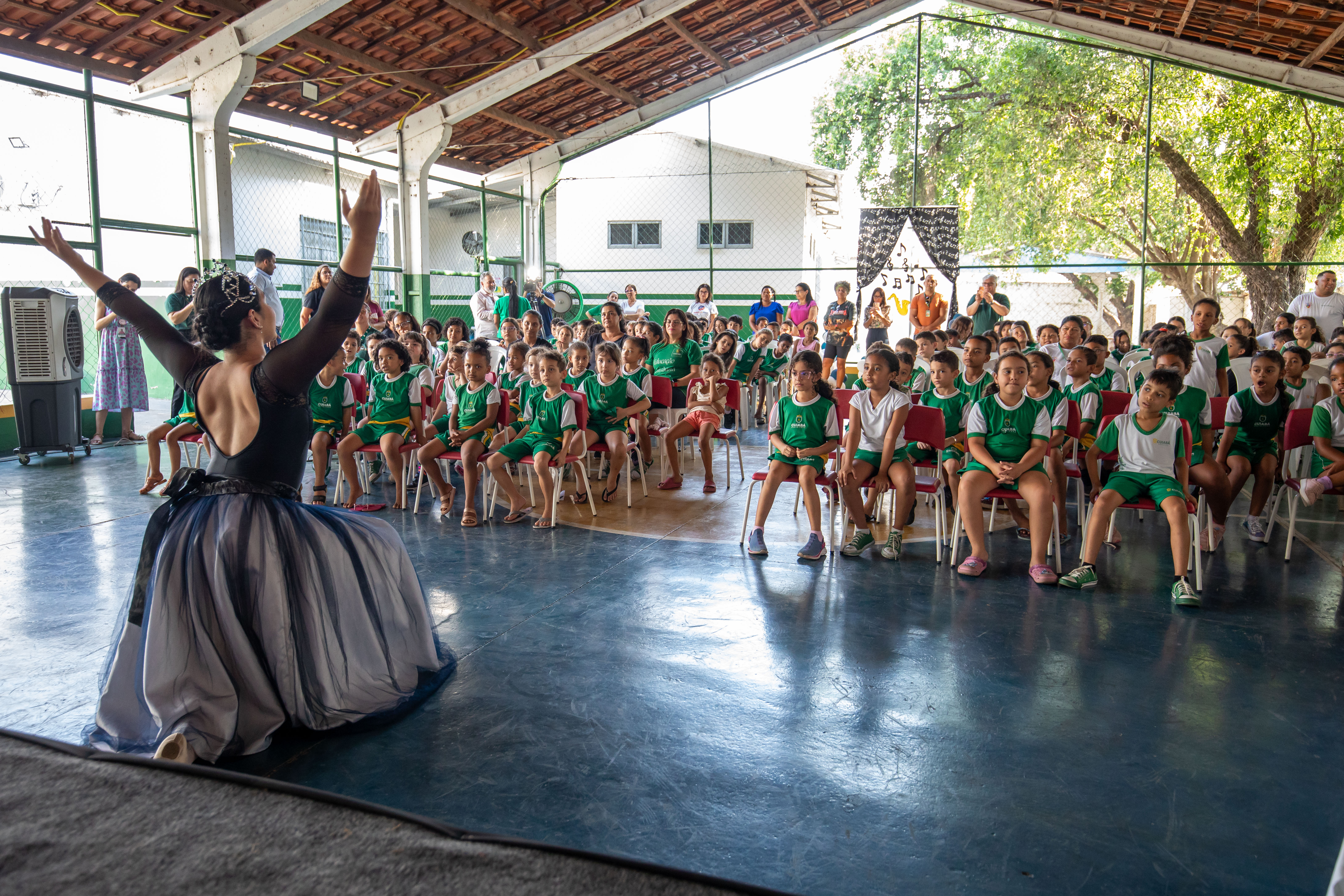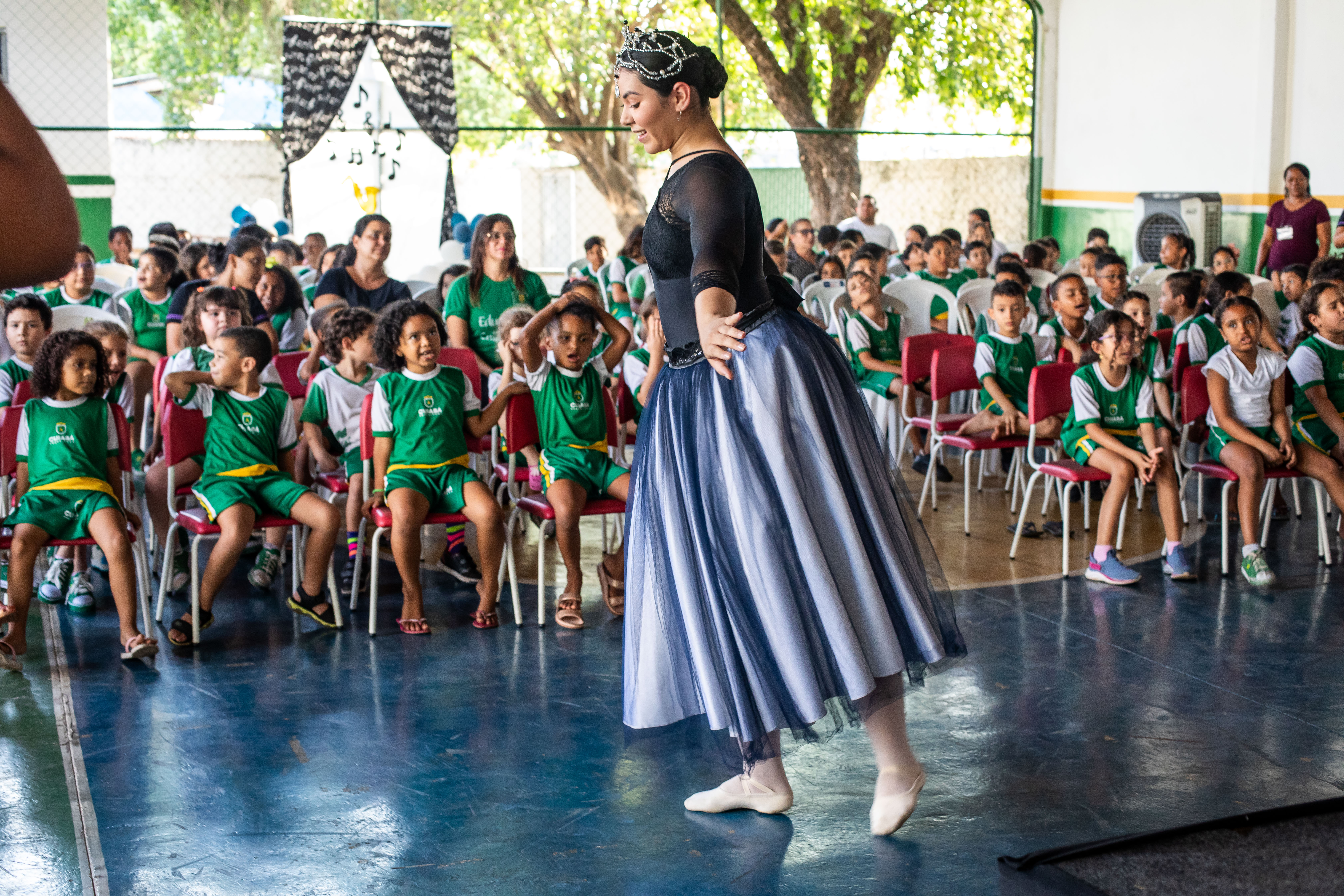A foto ilustra uma bailarina dançando numa quadra esportiva de piso azul. No local, estão crianças sentadas em cadeiras, todas devidamente vestidas com uniforme oficial da Prefeitura de Cuiabá, prestando atenção na exibição da arte.