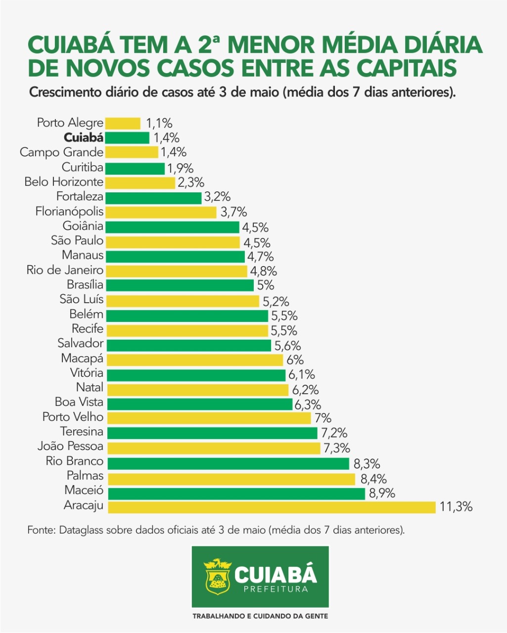 Cuiabá é hoje a segunda capital com a menor média diária de novos casos, de acordo com um estudo divulgado pela empresa de ciência de dados de saúde Dataglass. Segundo o levantamento, que levou em consideração o crescimento de casos diários até dia 03 de maio, Cuiabá teve um aumento de 1,4% nos casos por dia nos últimos 7 dias, enquanto a cidade que teve o maior índice teve um crescimento de 11,3% nos casos durante o mesmo período. Ao comparar o número de casos por cem mil habitantes, Cuiabá figura no levantamento, com 23,5 casos.