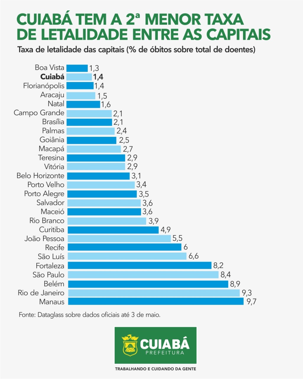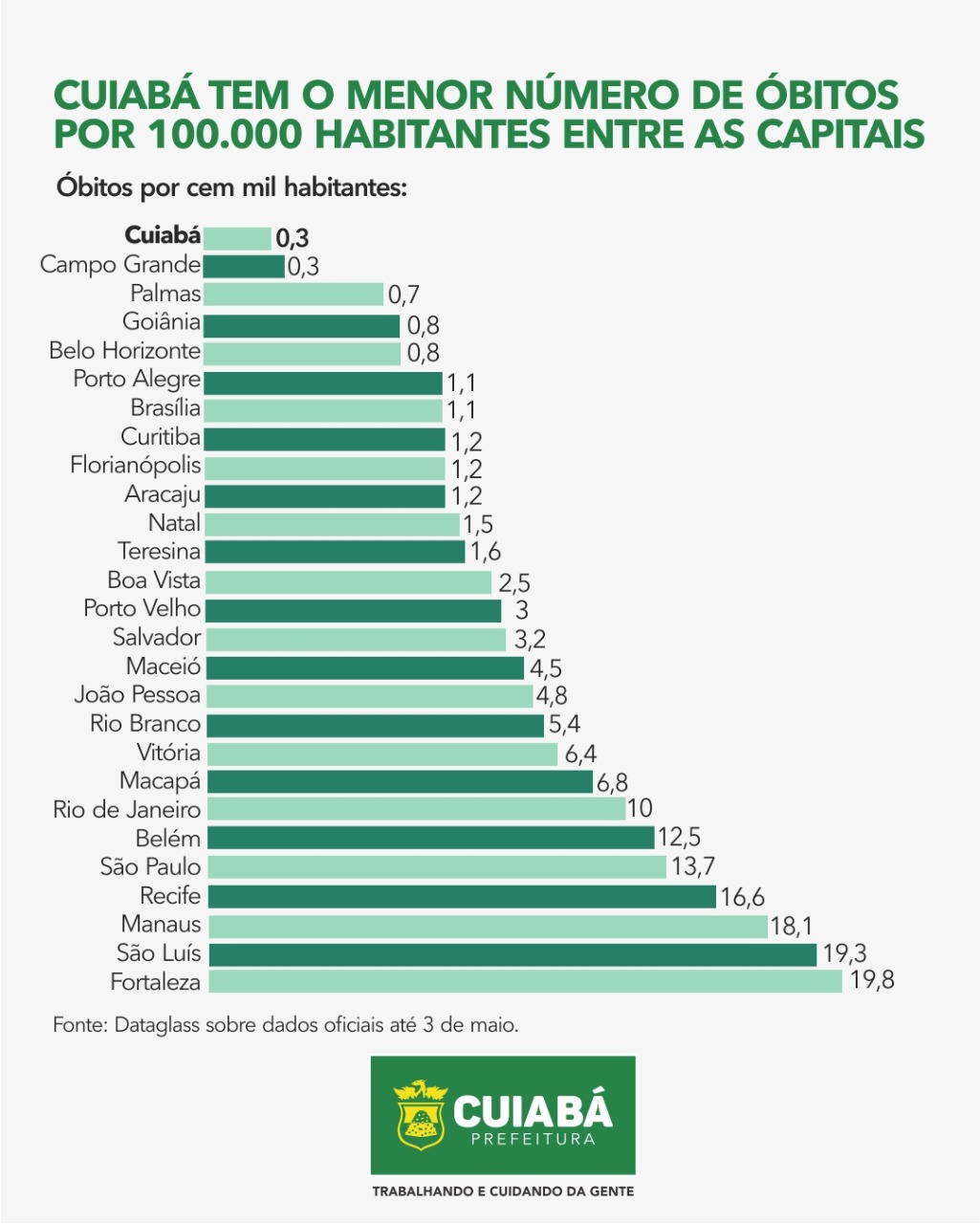 A proporção de óbitos sobre o total de doentes também está bem abaixo das cidades com maior número de mortes. Cuiabá aparece com 1,4%, enquanto a cidade mais afetada tem uma proporção de 9,7%. Se for levado em conta o número de óbitos por 100 mil habitantes, Cuiabá figura em última posição entre as capitais, com 0,3 mortes a cada 100 mil habitantes.