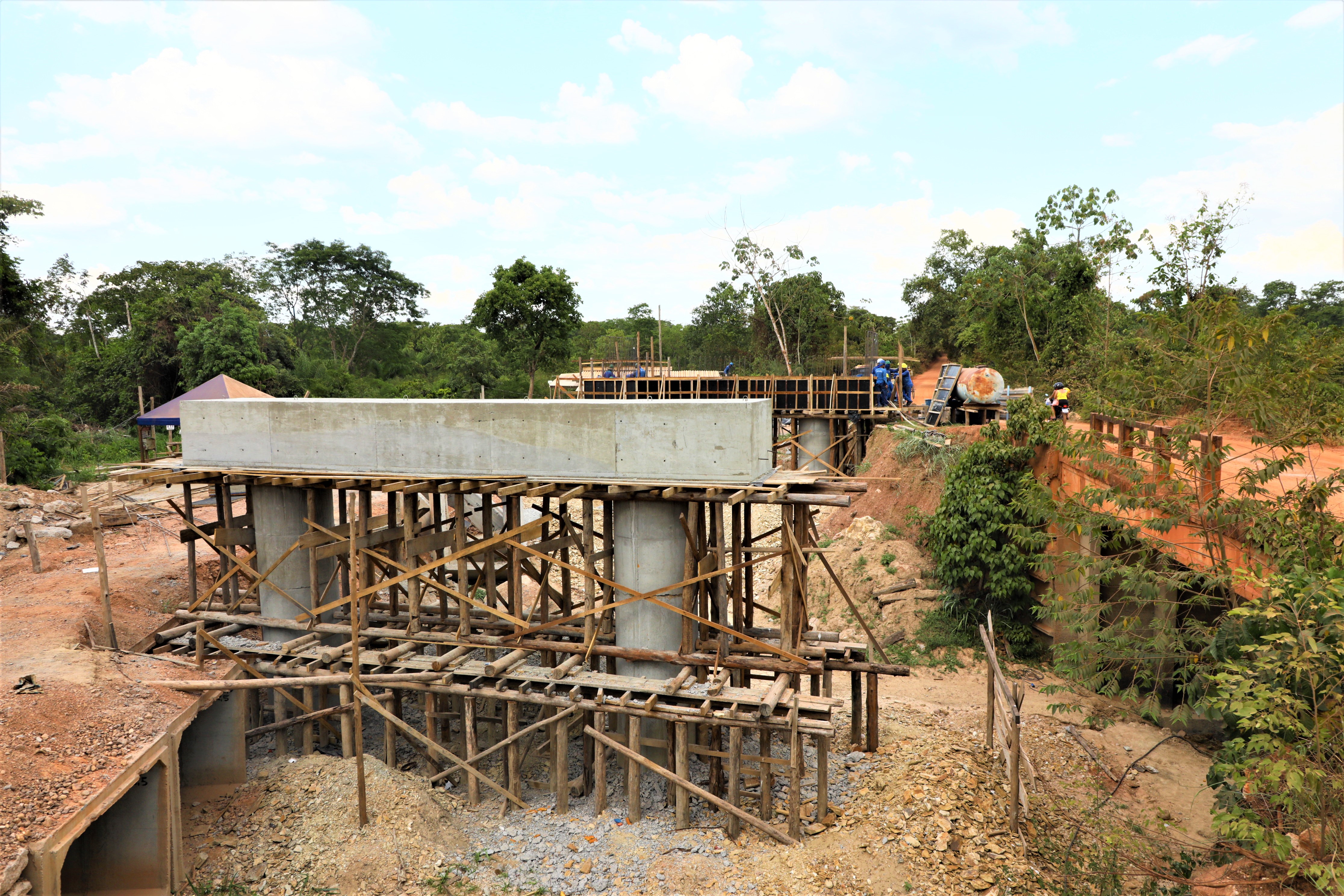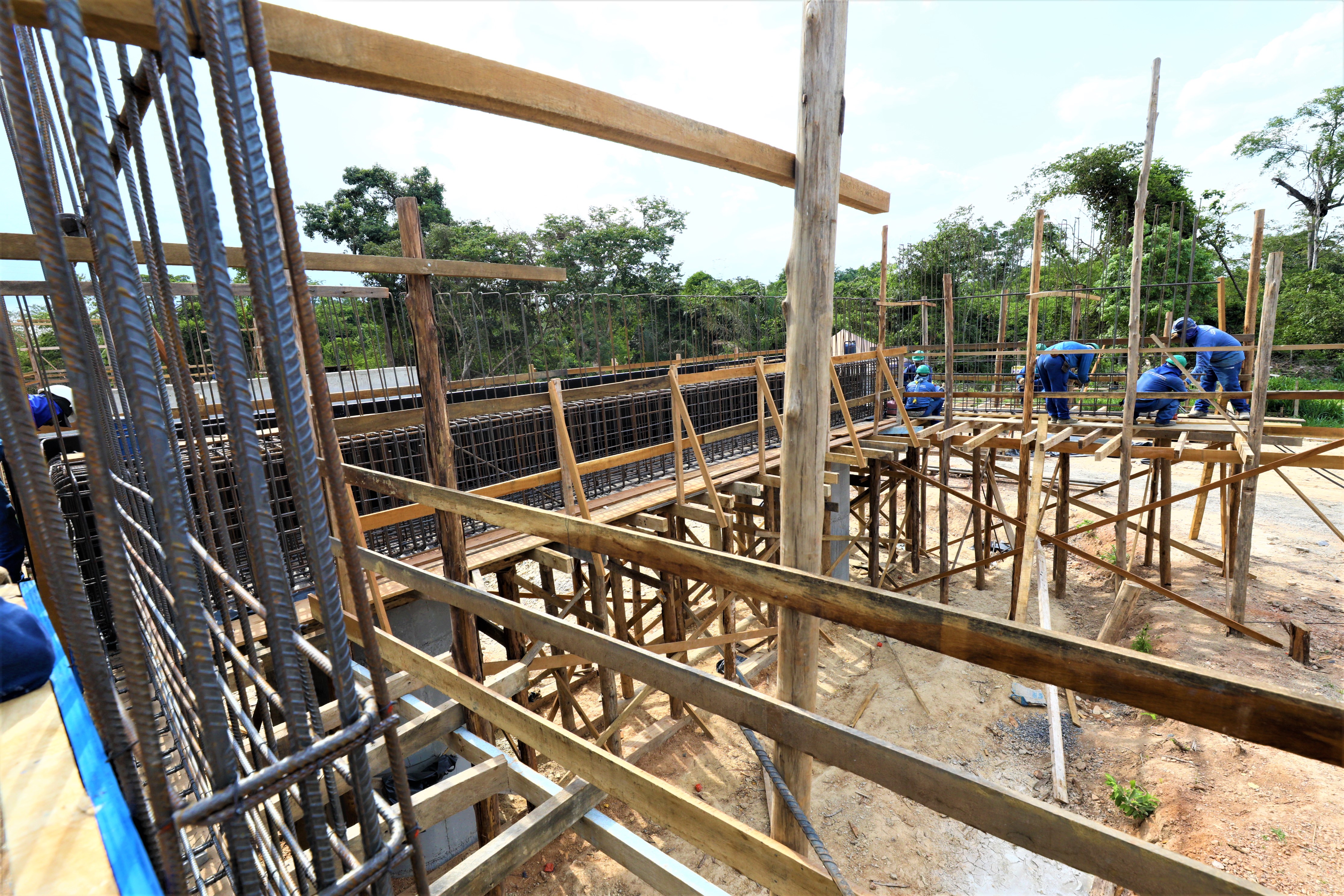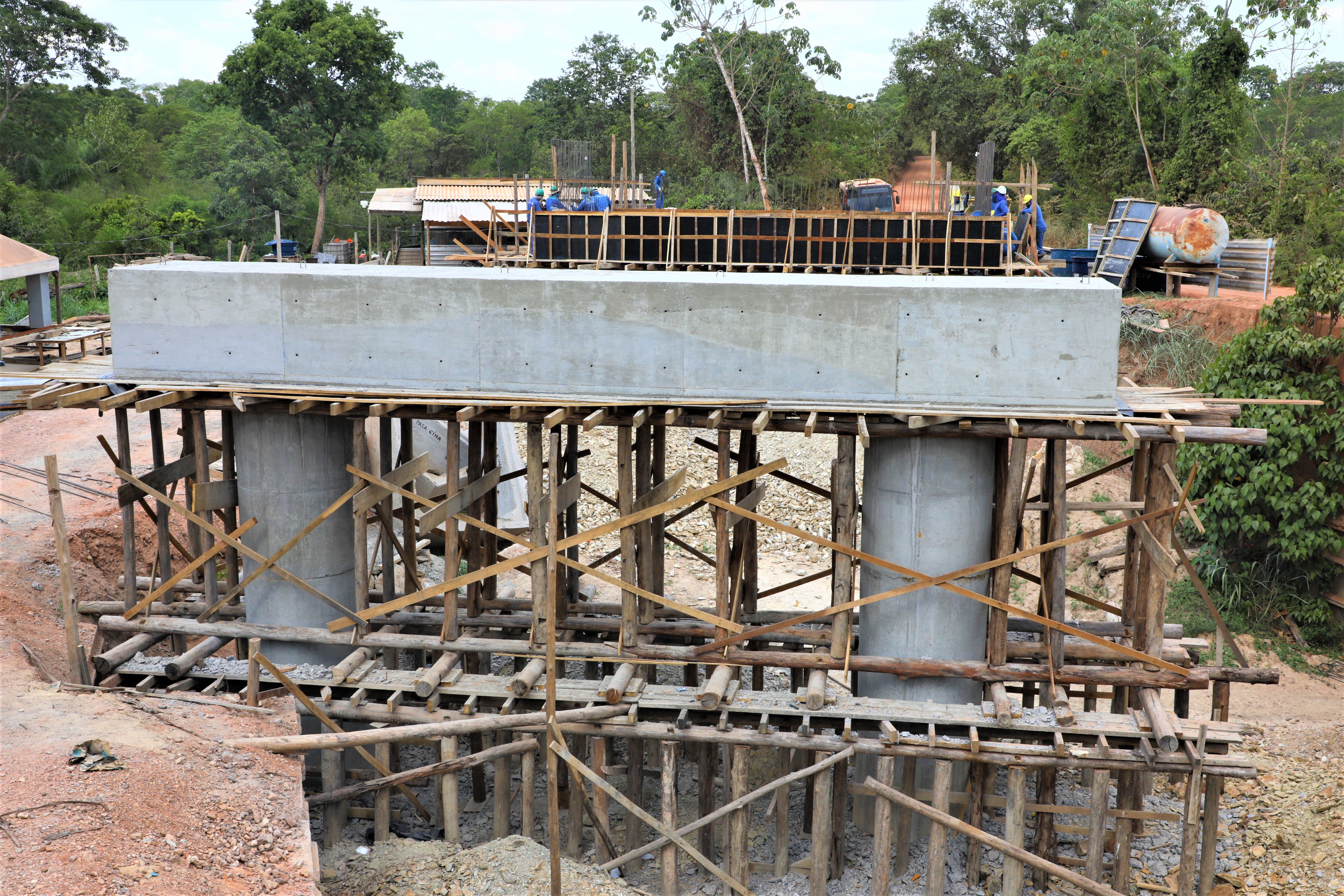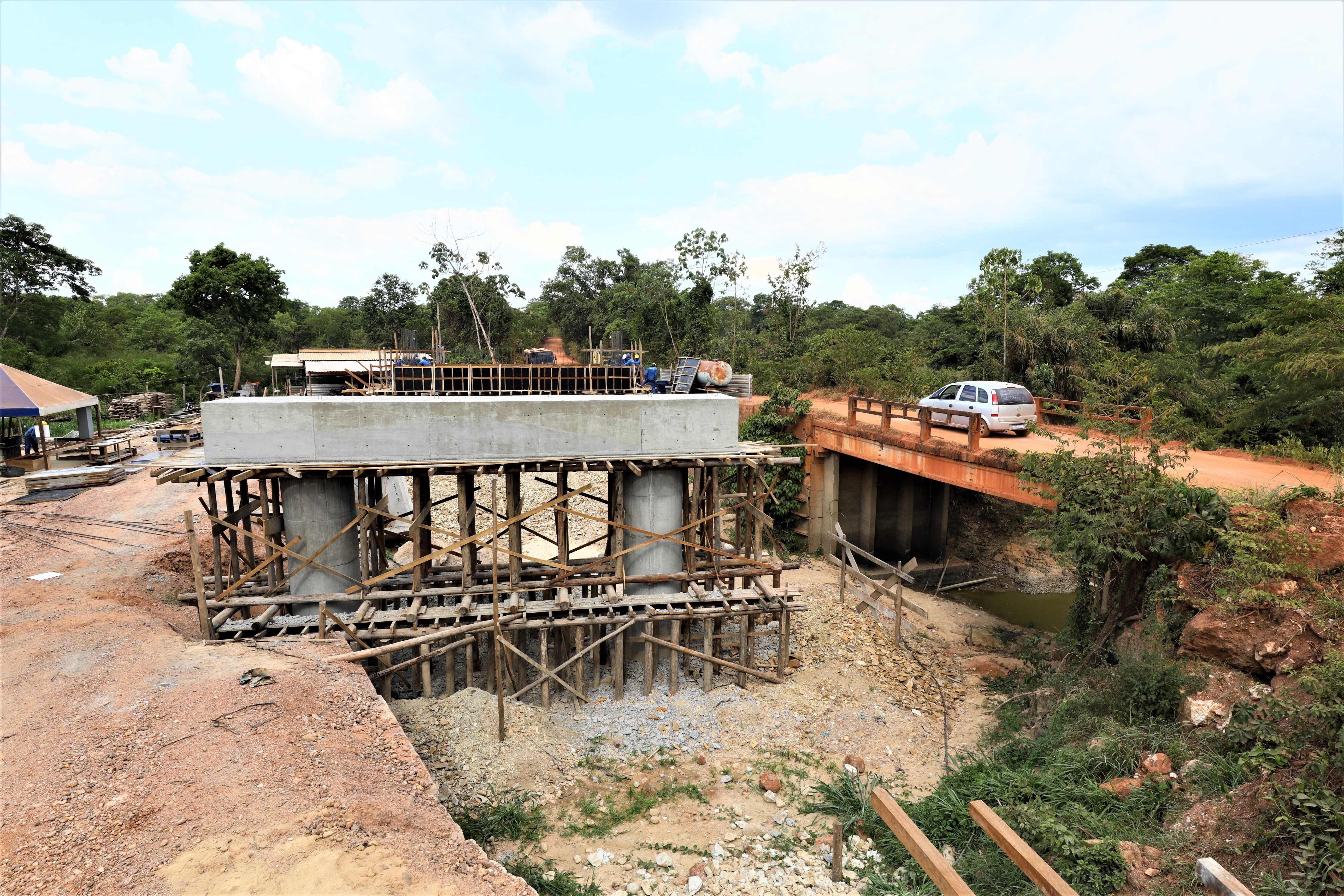 A nova ponte de concreto que está sendo construída pela gestão Emanuel Pinheiro sobre o Rio Aricazinho, localizado na Estrada do Rio dos Couros, zona rural da capital, alcançou a etapa de implantação dos pilares em suas margens.