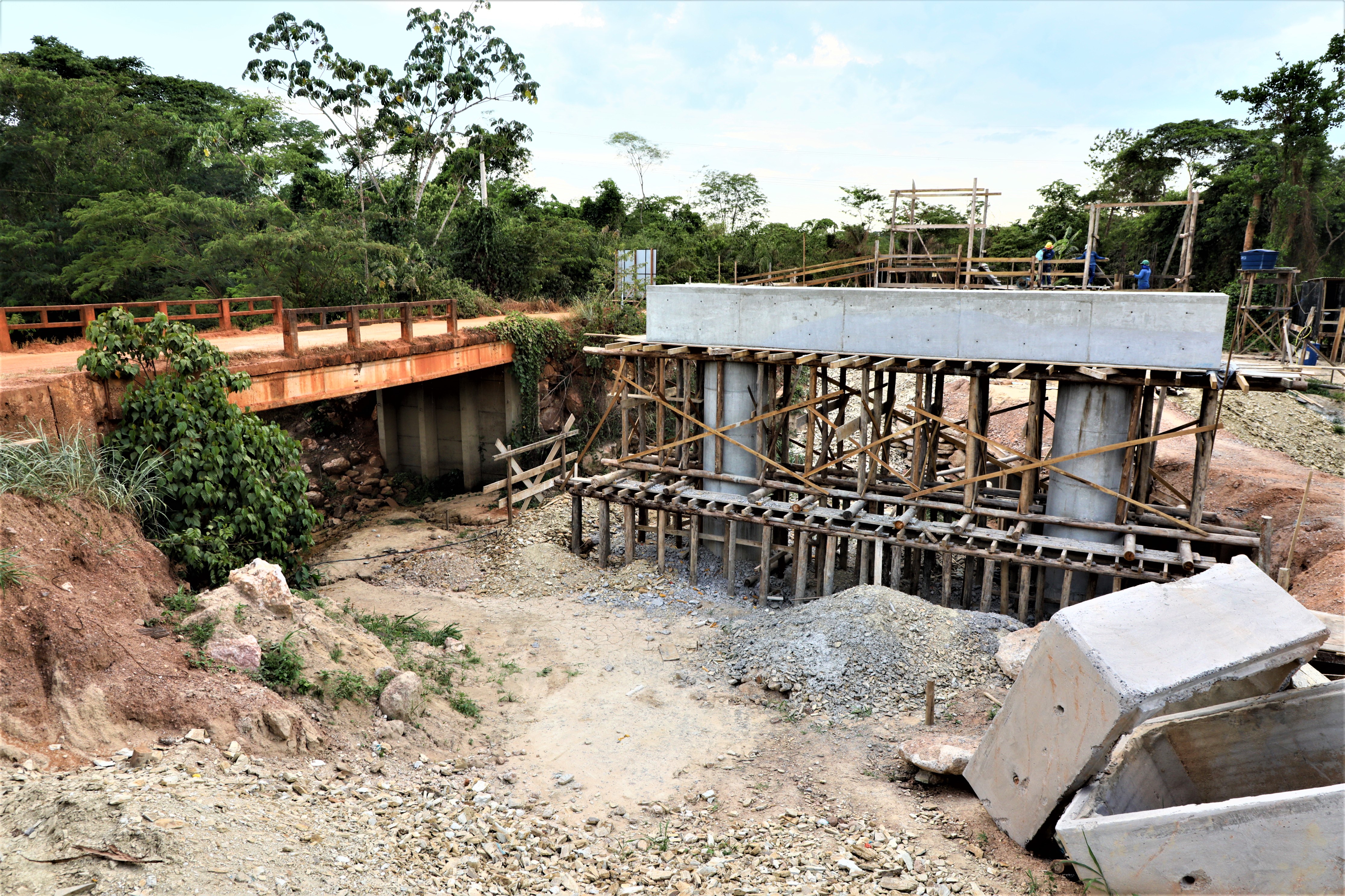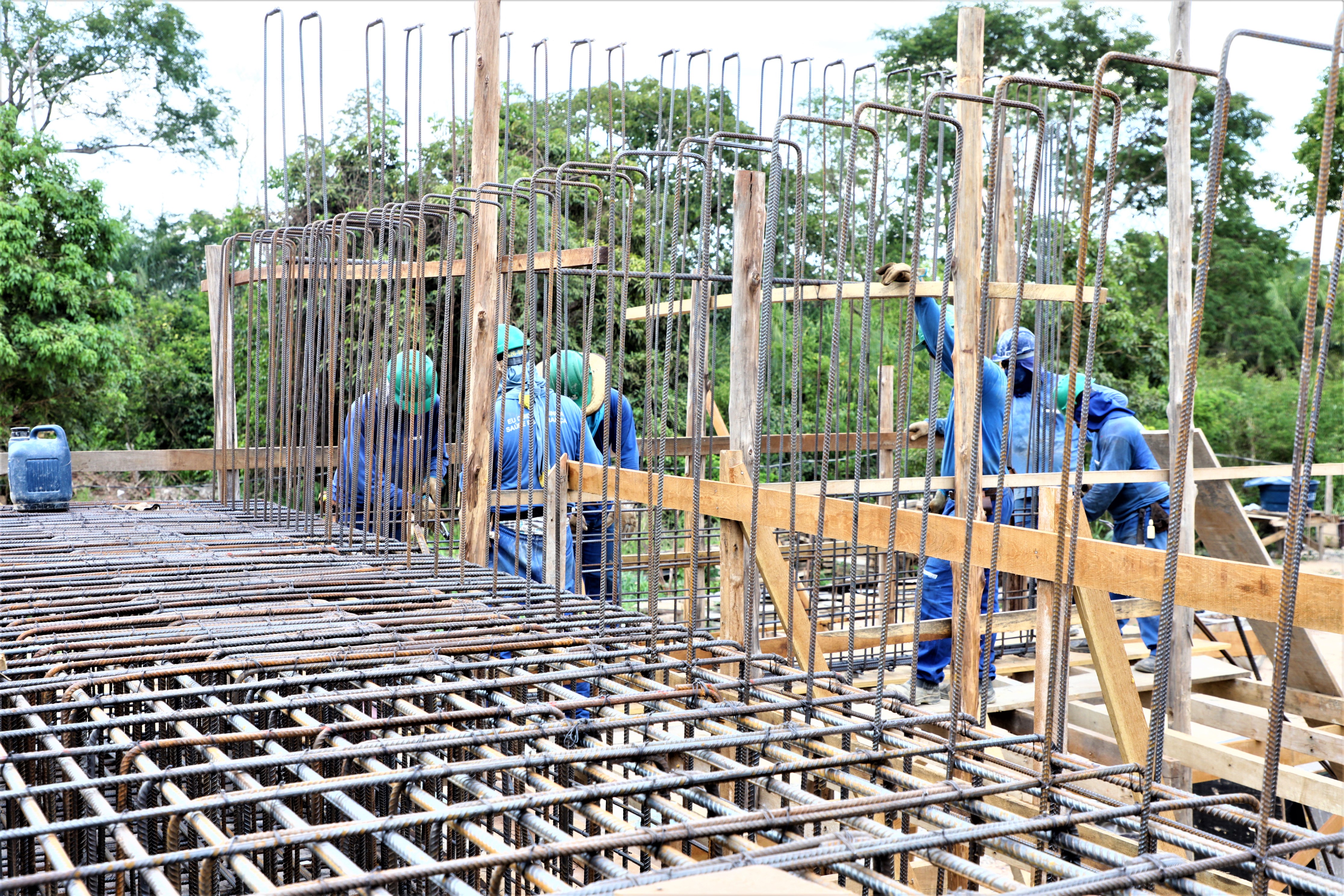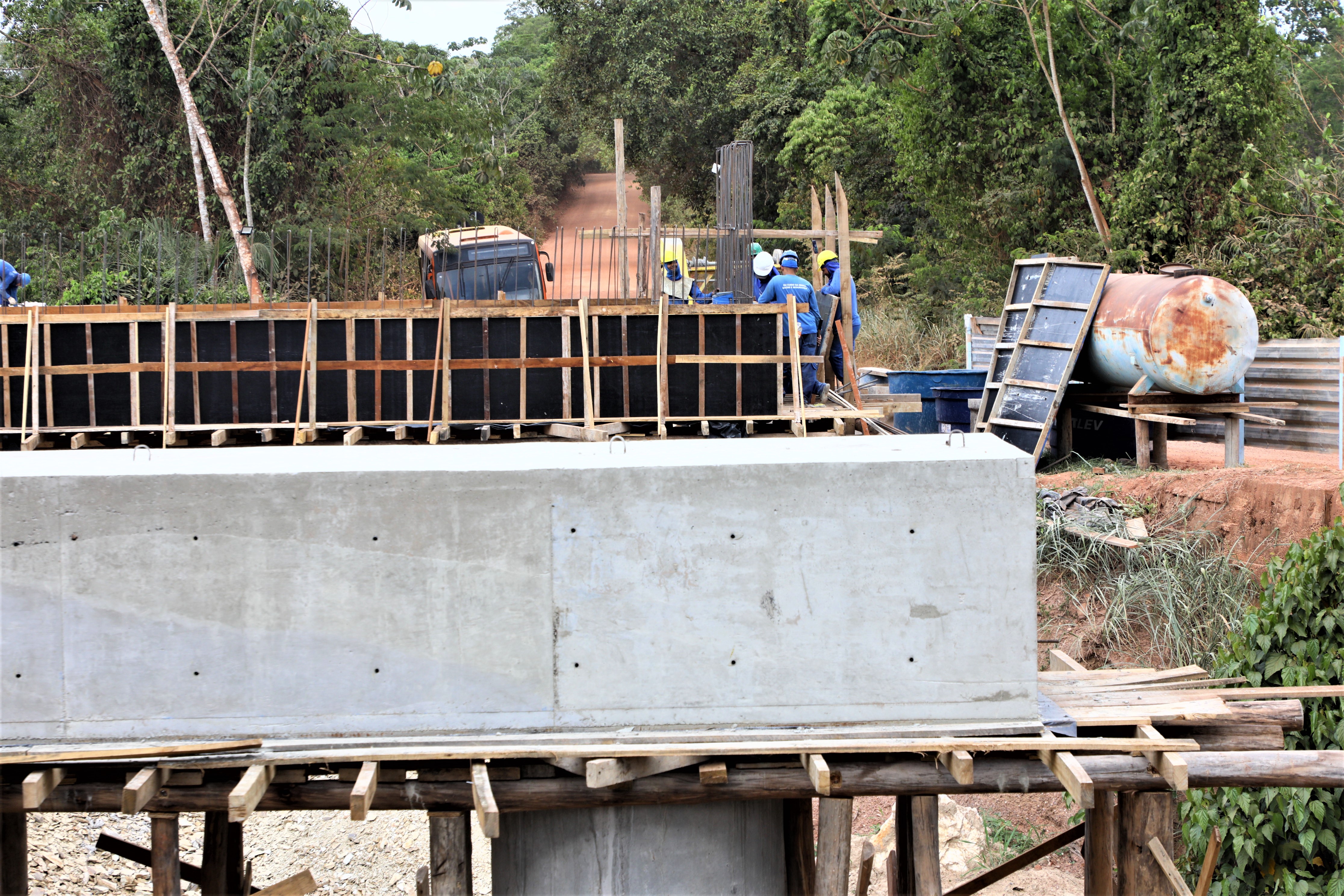 A nova ponte de concreto que está sendo construída pela gestão Emanuel Pinheiro sobre o Rio Aricazinho, localizado na Estrada do Rio dos Couros, zona rural da capital, alcançou a etapa de implantação dos pilares em suas margens.