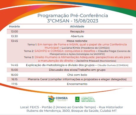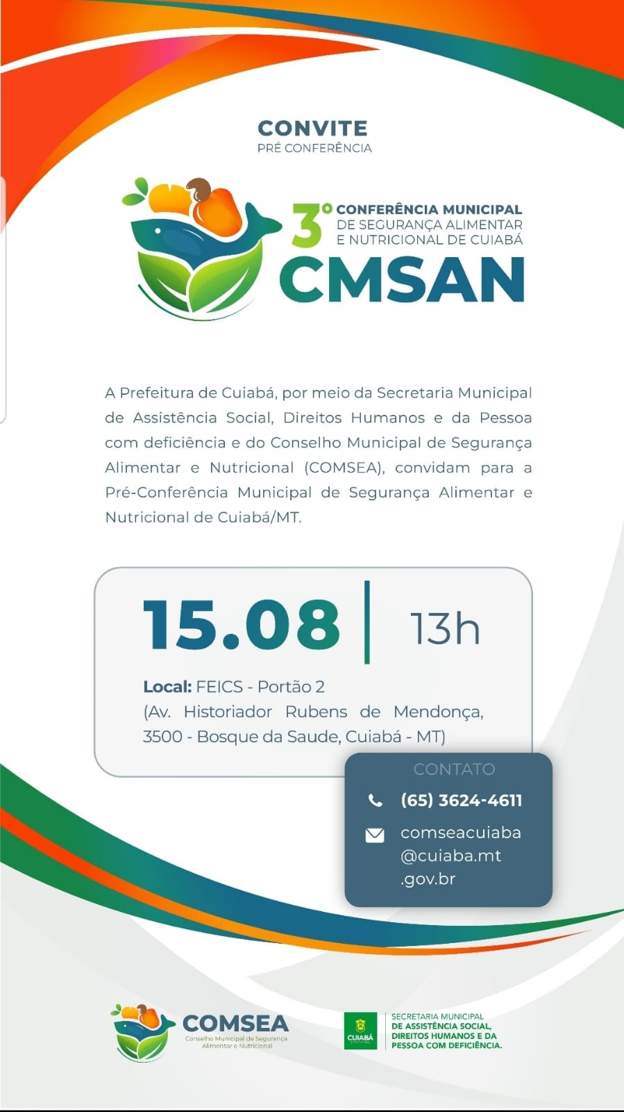 Será realizada nesta terça-feira (15), a partir das 13h, a Conferência Preparatória de Segurança Alimentar e Nutricional. A atividade será desenvolvida no auditório das Faculdades Evangélicas Integradas Cantares de Salomão (FEICS), Portão 2 (Anexo ao Grande Templo). Organizado pela Prefeitura de Cuiabá, por meio da Secretaria Municipal de Assistência Social, Direitos Humanos e da Pessoa com Deficiência, juntamente com o Conselho Municipal de Segurança Alimentar, o encontro reunirá representantes de diversos setores da sociedade para debater e propor ações que contribuam para a garantia do acesso universal a alimentos de qualidade, bem como para a promoção de práticas alimentares saudáveis. A entrada é franca e toda a população de Cuiabá está convidada a participar.