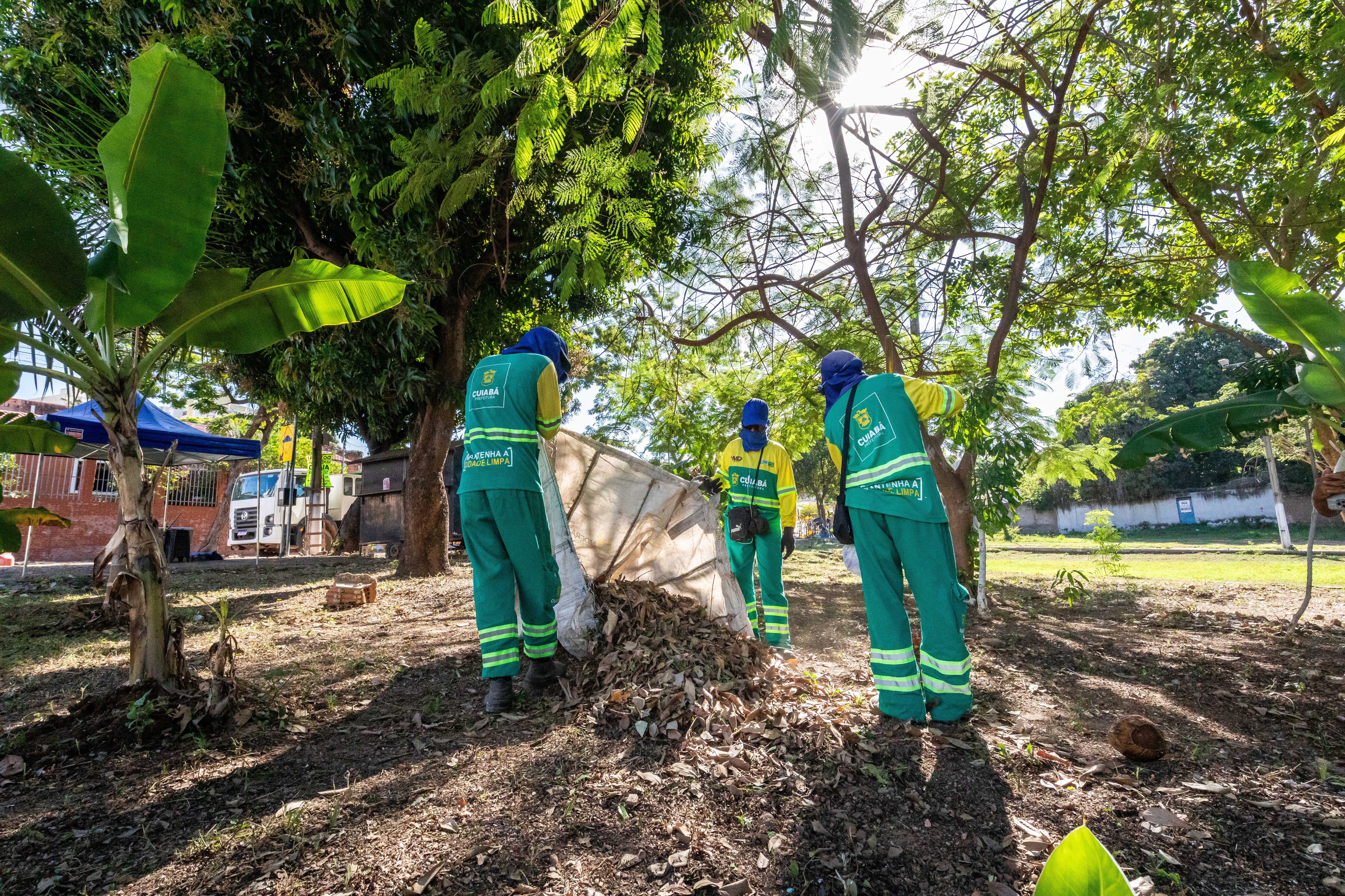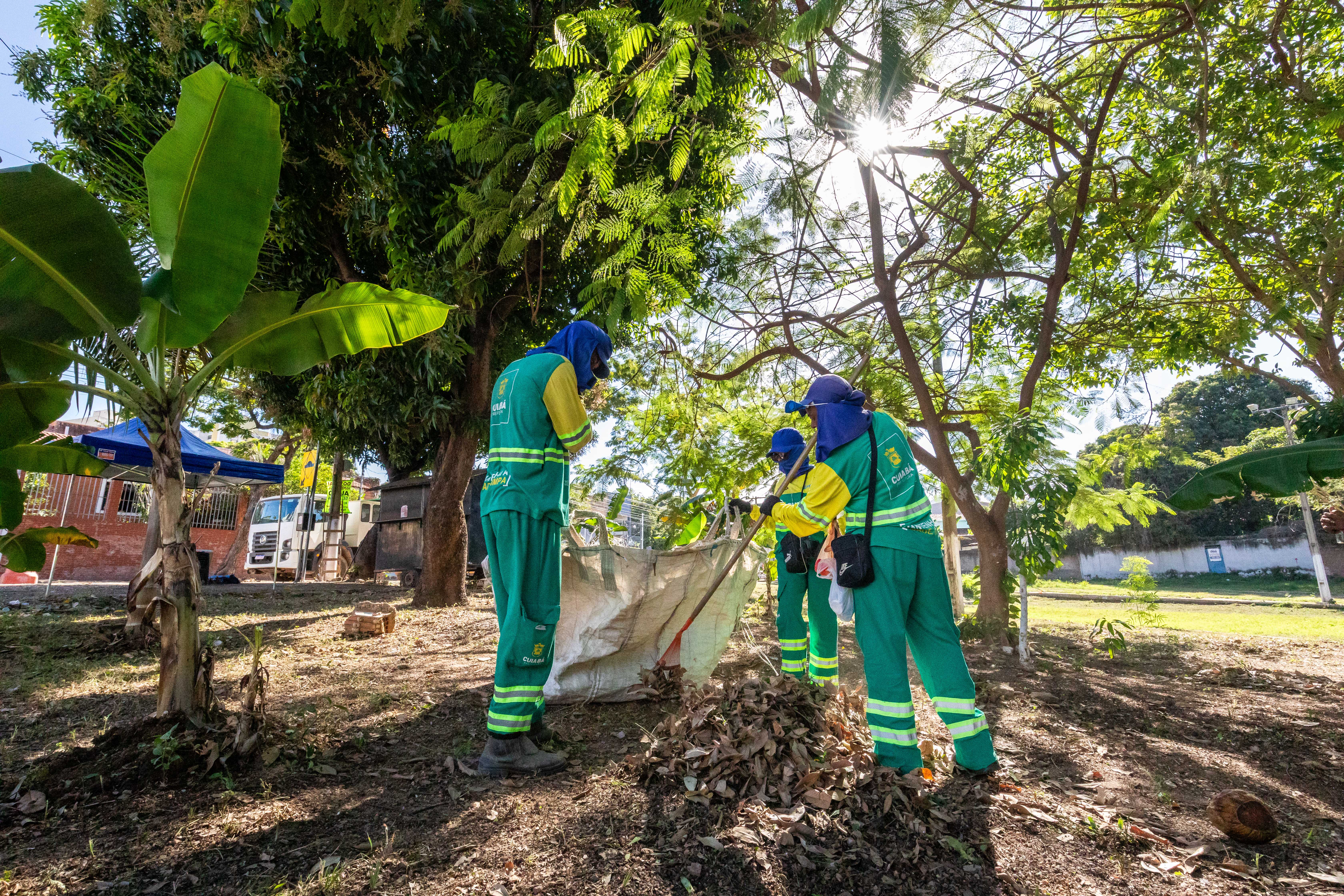 A imagem mostra trabalhadores da Empresa Cuiabana de Zeladoria e Serviços Urbanos – Limpurb realizando serviços de limpeza na praça de lazer do bairro Aráes.