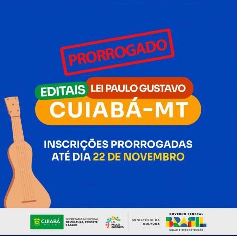 A Prefeitura de Cuiabá, por meio da Secretaria Municipal de Cultura, Esporte e Lazer informa que o prazo para inscrições dos projetos e ações relacionadas à aplicação da Lei Paulo Gustavo em Cuiabá foi prorrogado para o dia 22 de novembro. A alteração da data e demais informações descritas nos editais foram publicadas na edição da Gazeta Municipal desta quinta-feira (16).