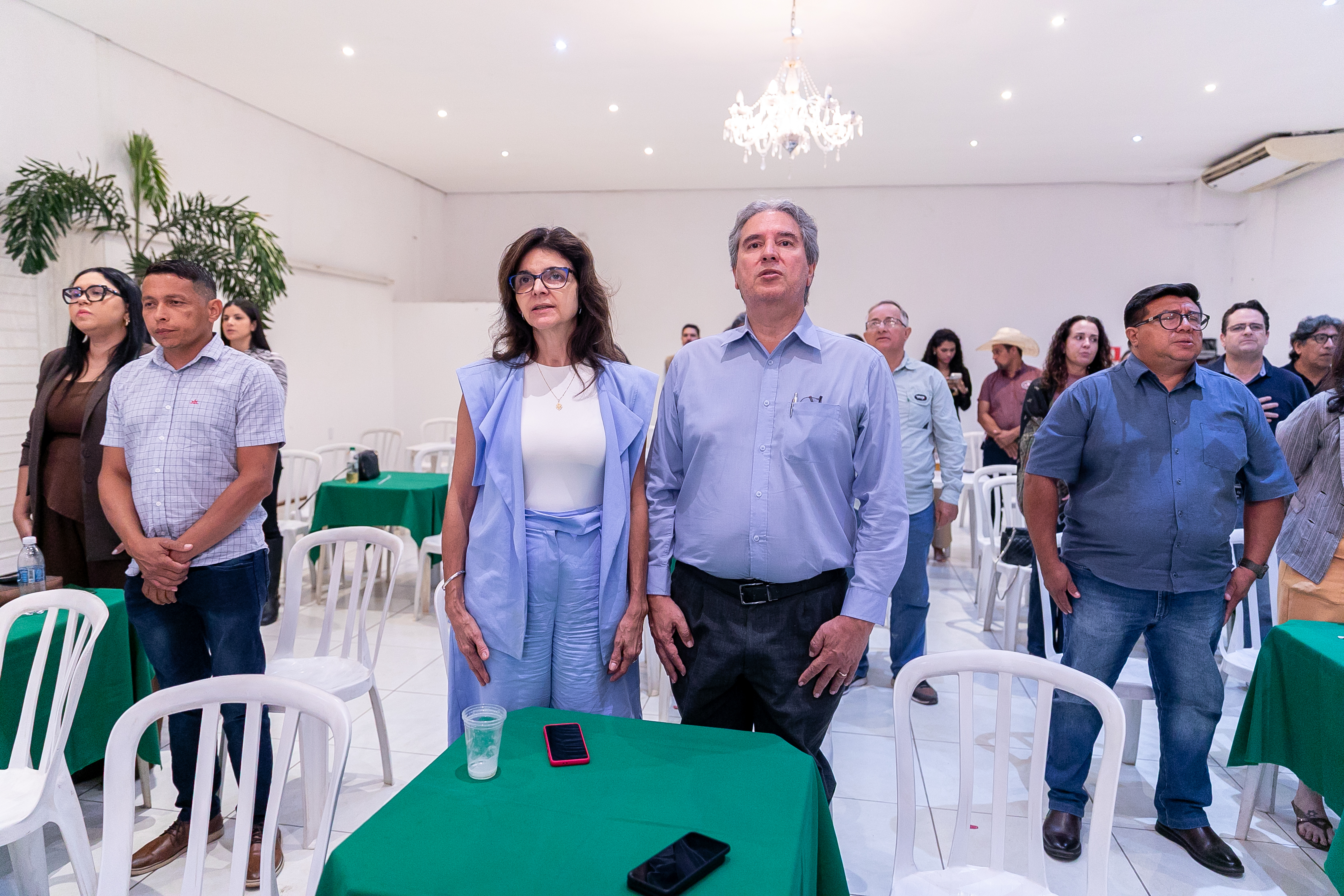A foto que ilustra a matéria mostra o dispositivo de autoridades sentadas e a prefeita em exercício, coronel Vânia Rosa, em pé, no momento em que fazia uso da palavra durante a abertura do evento.