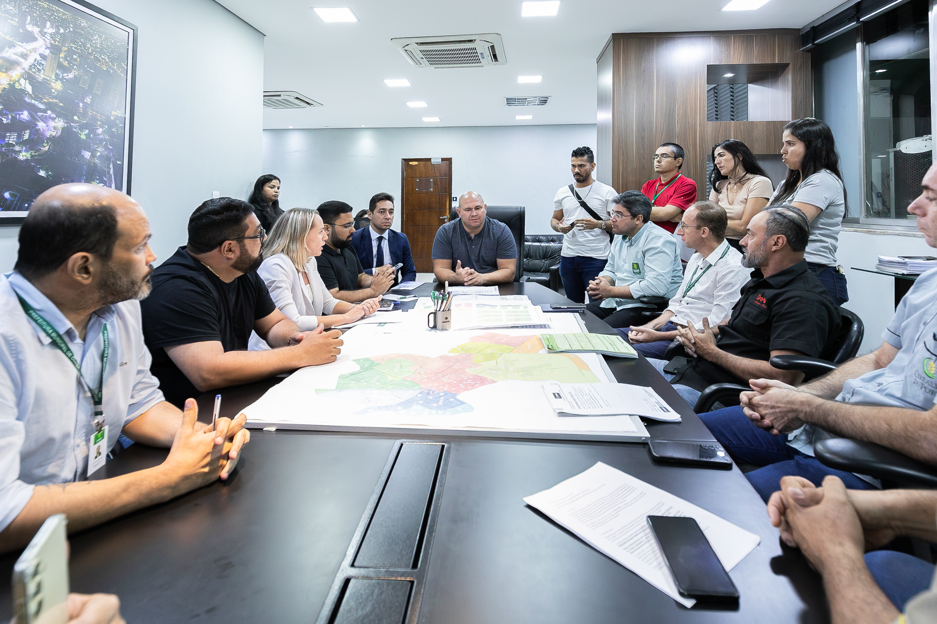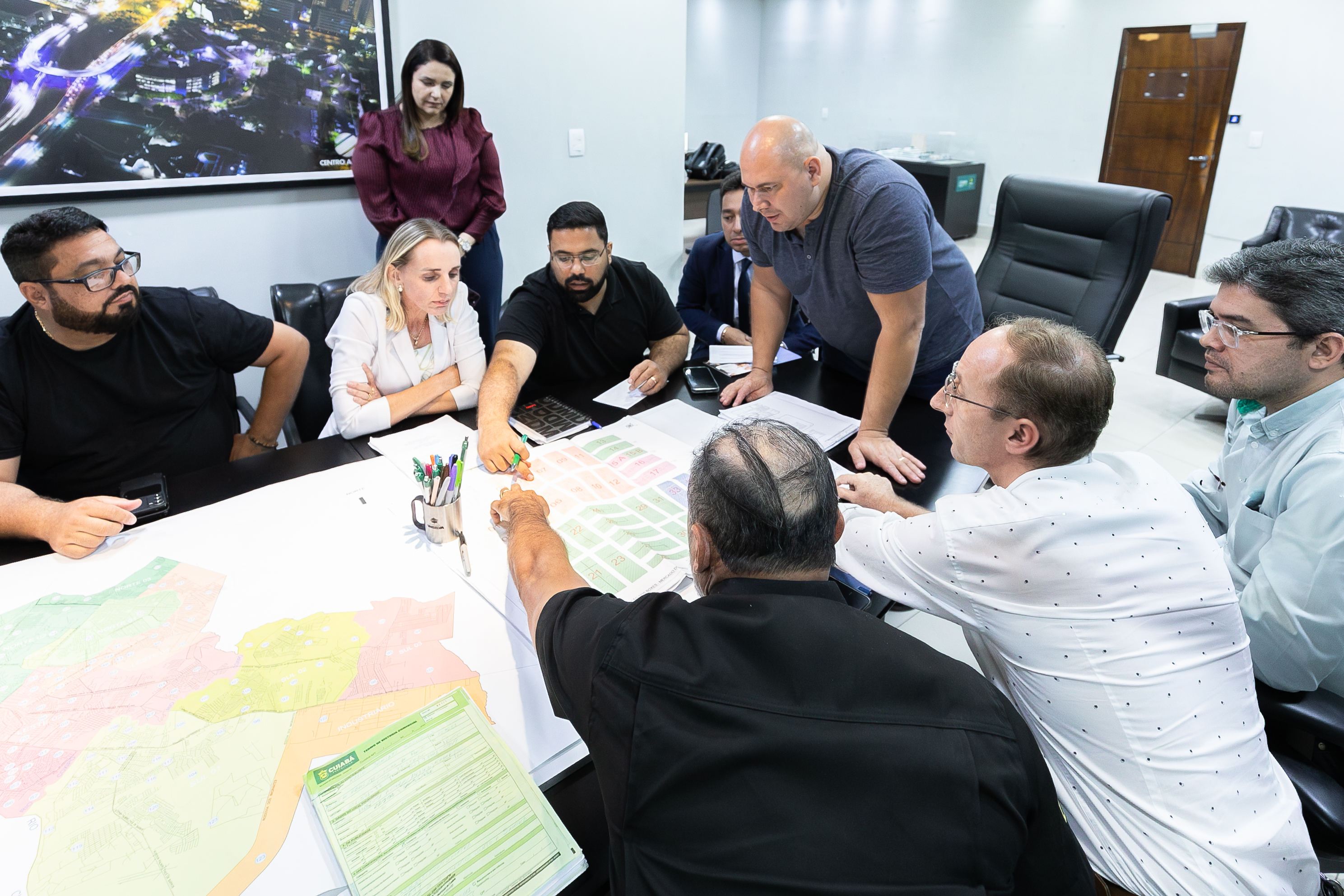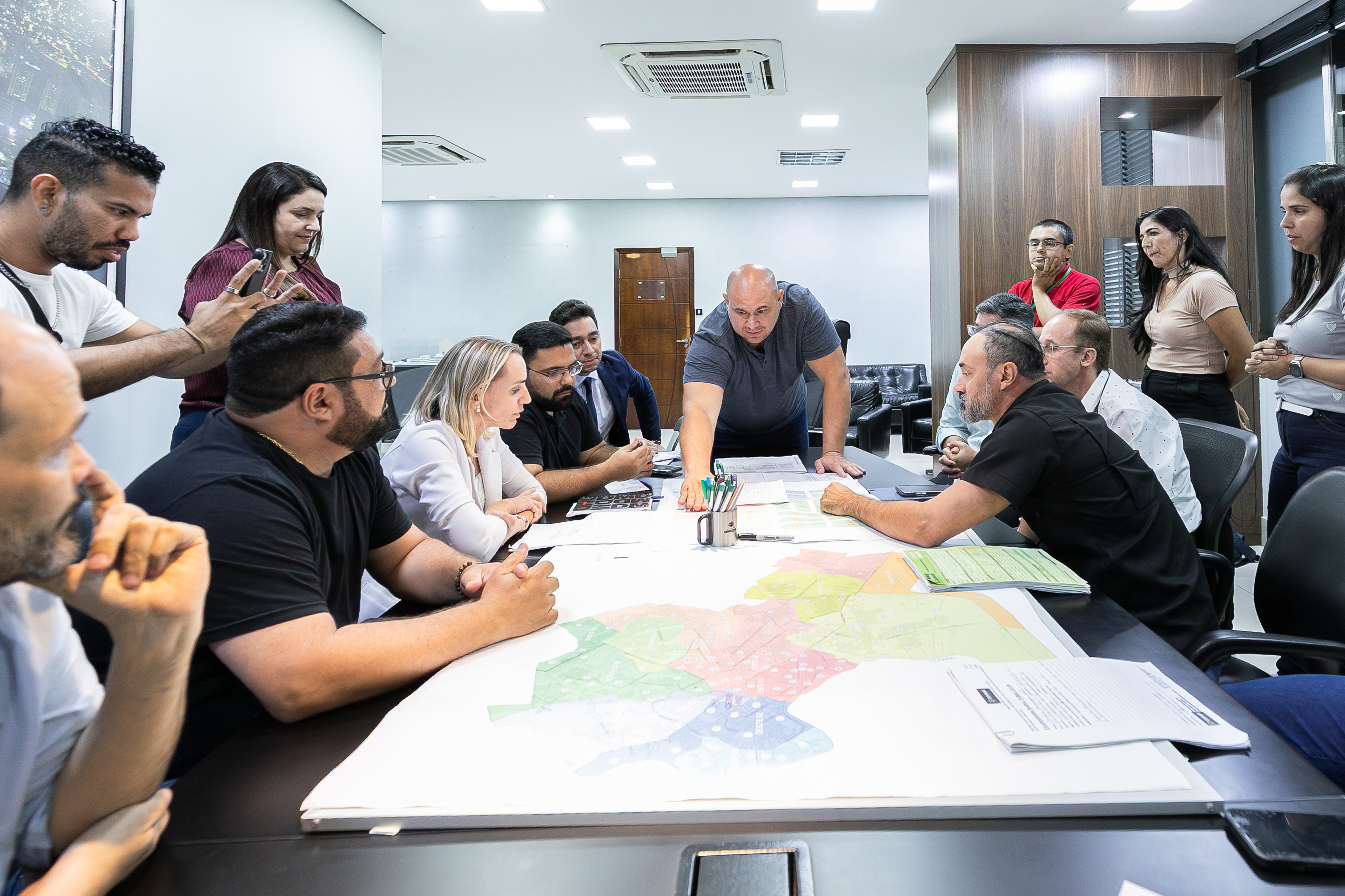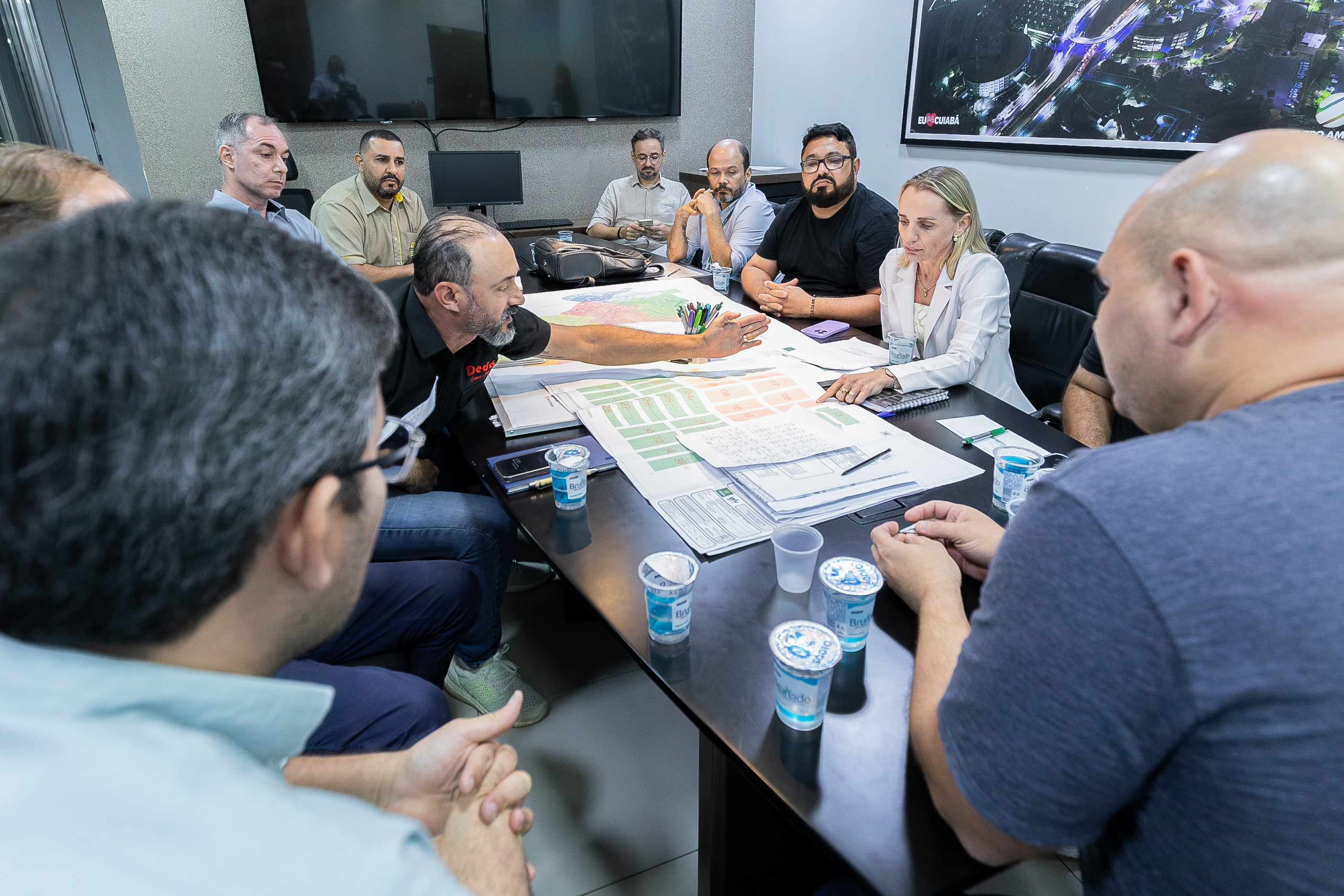 A imagem mostra o prefeito Abilio Brunini na frente da mesa de reunião olhando um mapa do Mercado do Porto. Ela usa cinza e preto. Ao redor da mesa também se encontra a vereadora Katiuscia Manteli usando branco, os secretários de Agricultura, Felipe Corrêa – usando camisa verde - e de Turismo, Fernando Medeiros, camiseta preta. Também estão ao redor os permissionários e servidores da Prefeitura de Cuiabá.