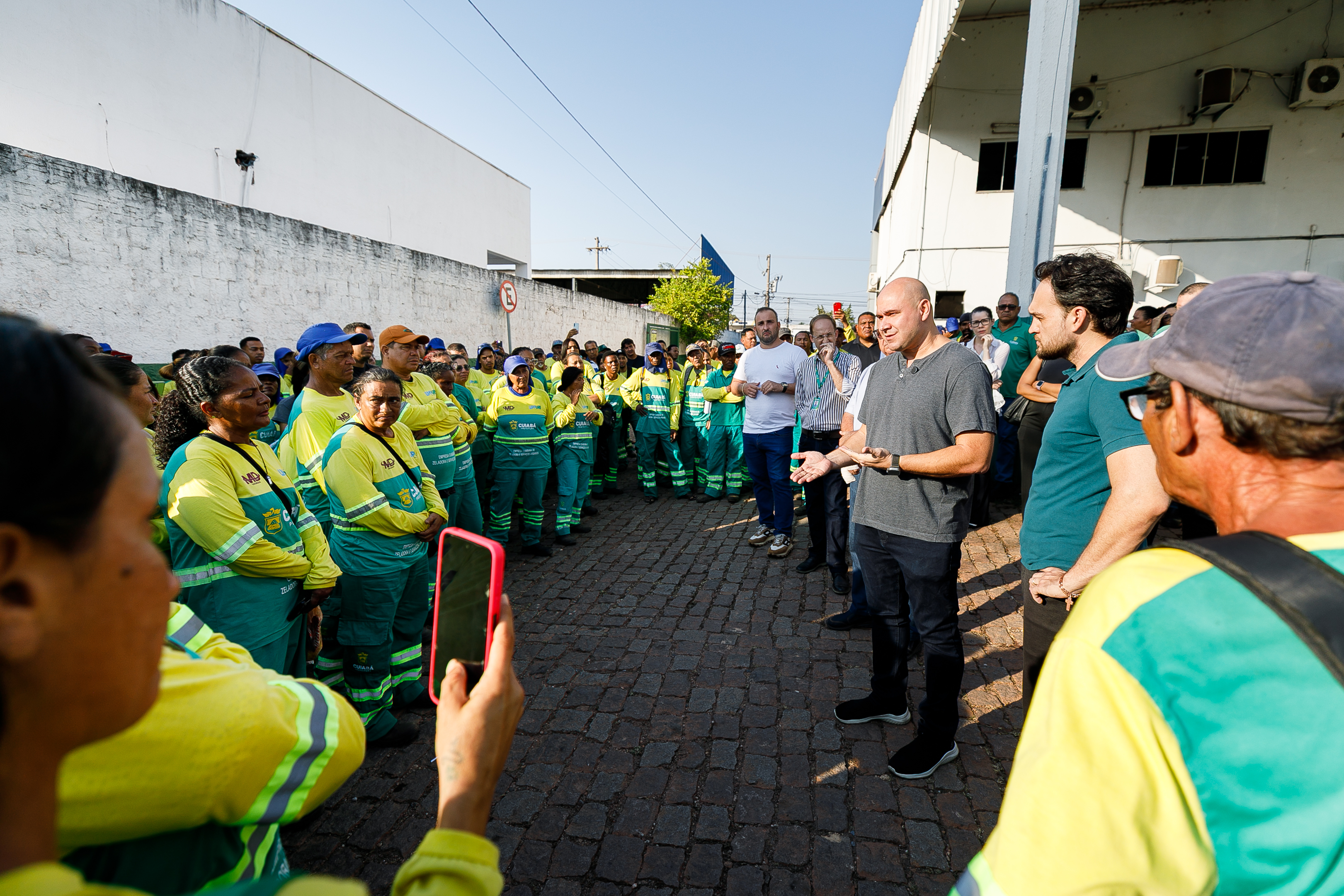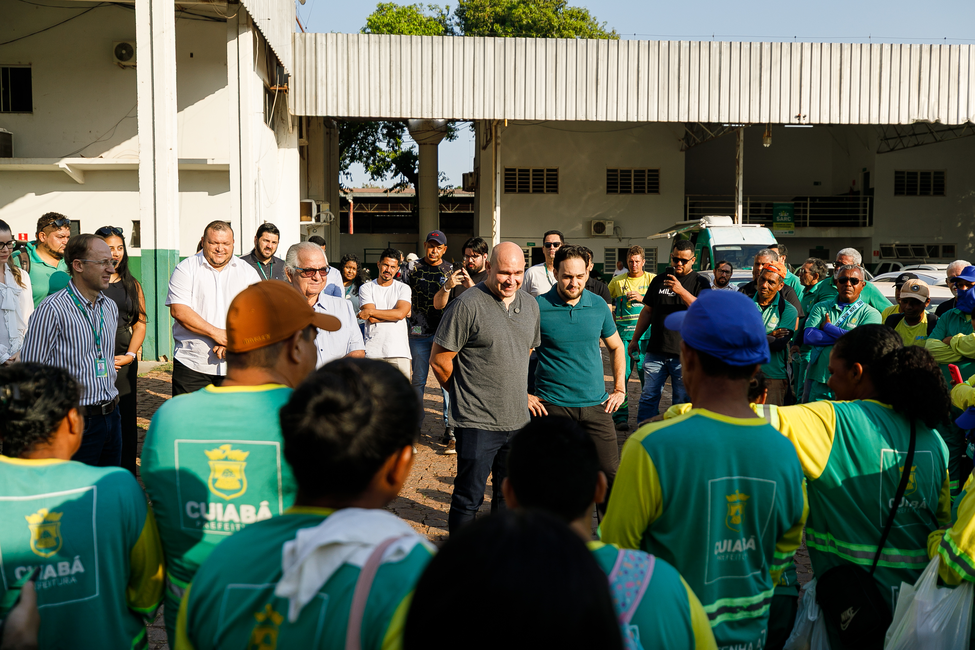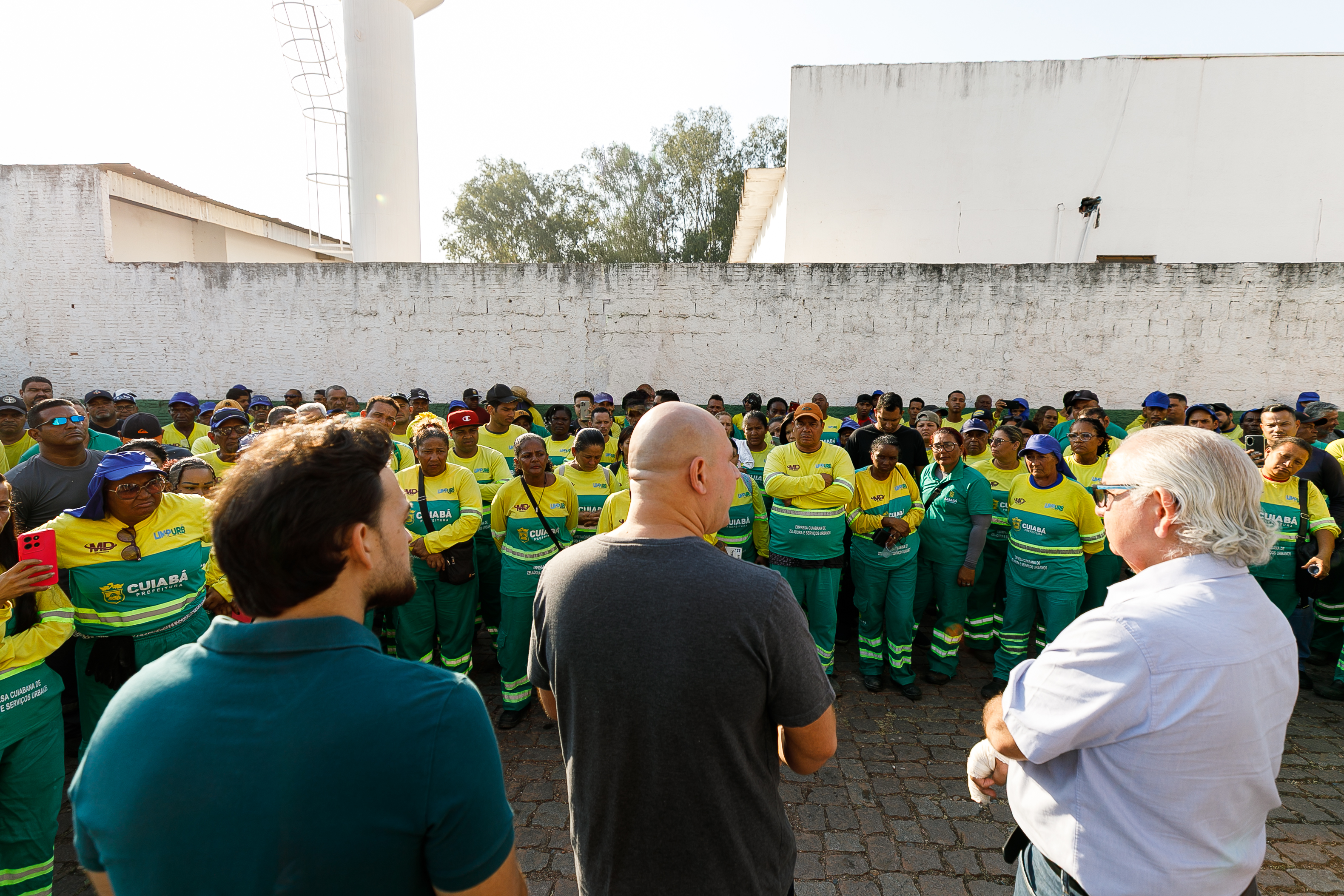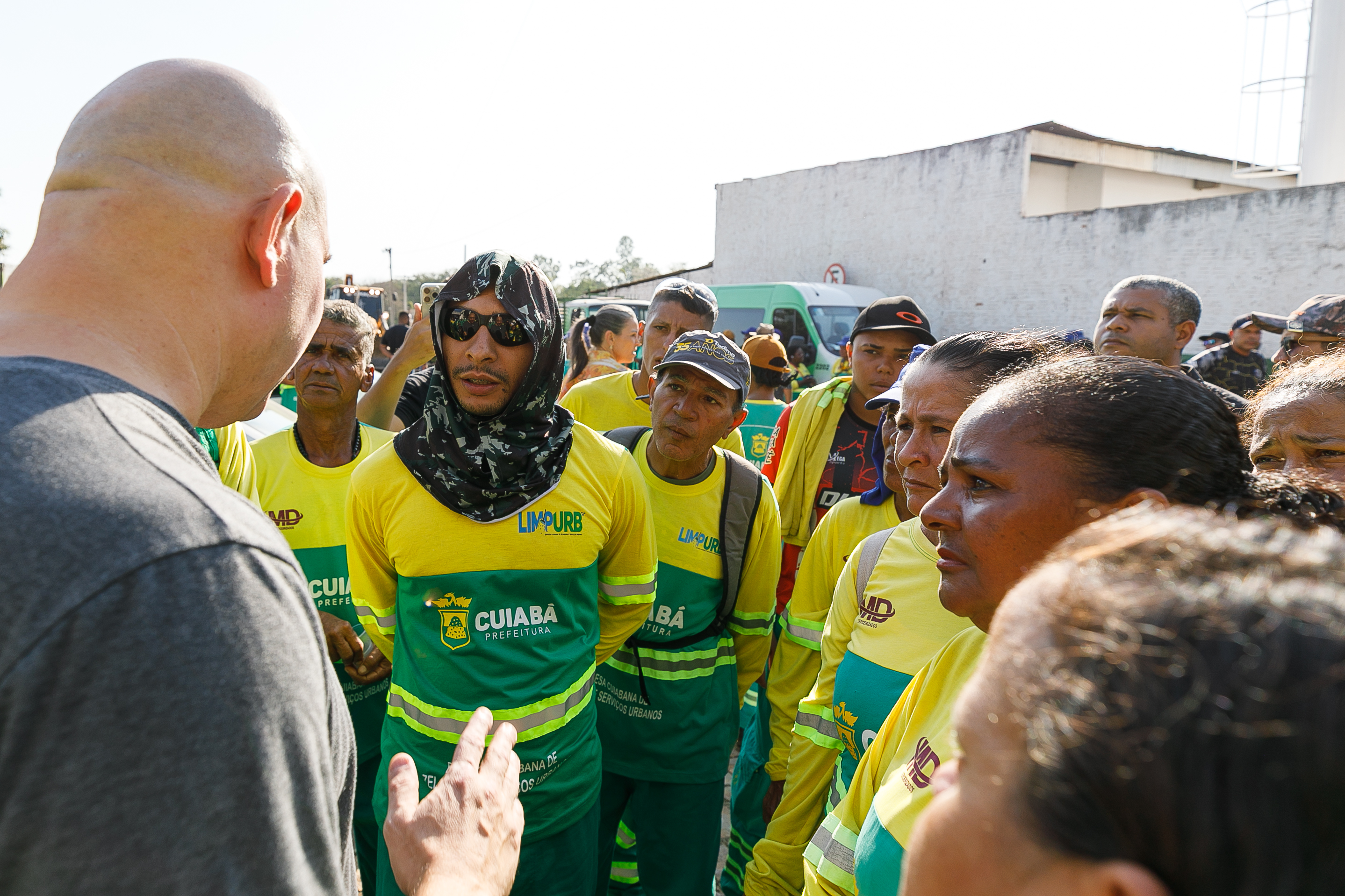 A imagem mostra o prefeito Abilio Brunini em diálogo com os colaboradores da Empresa Cuiabana de Zeladoria e Serviços Urbanos - Limpurb.