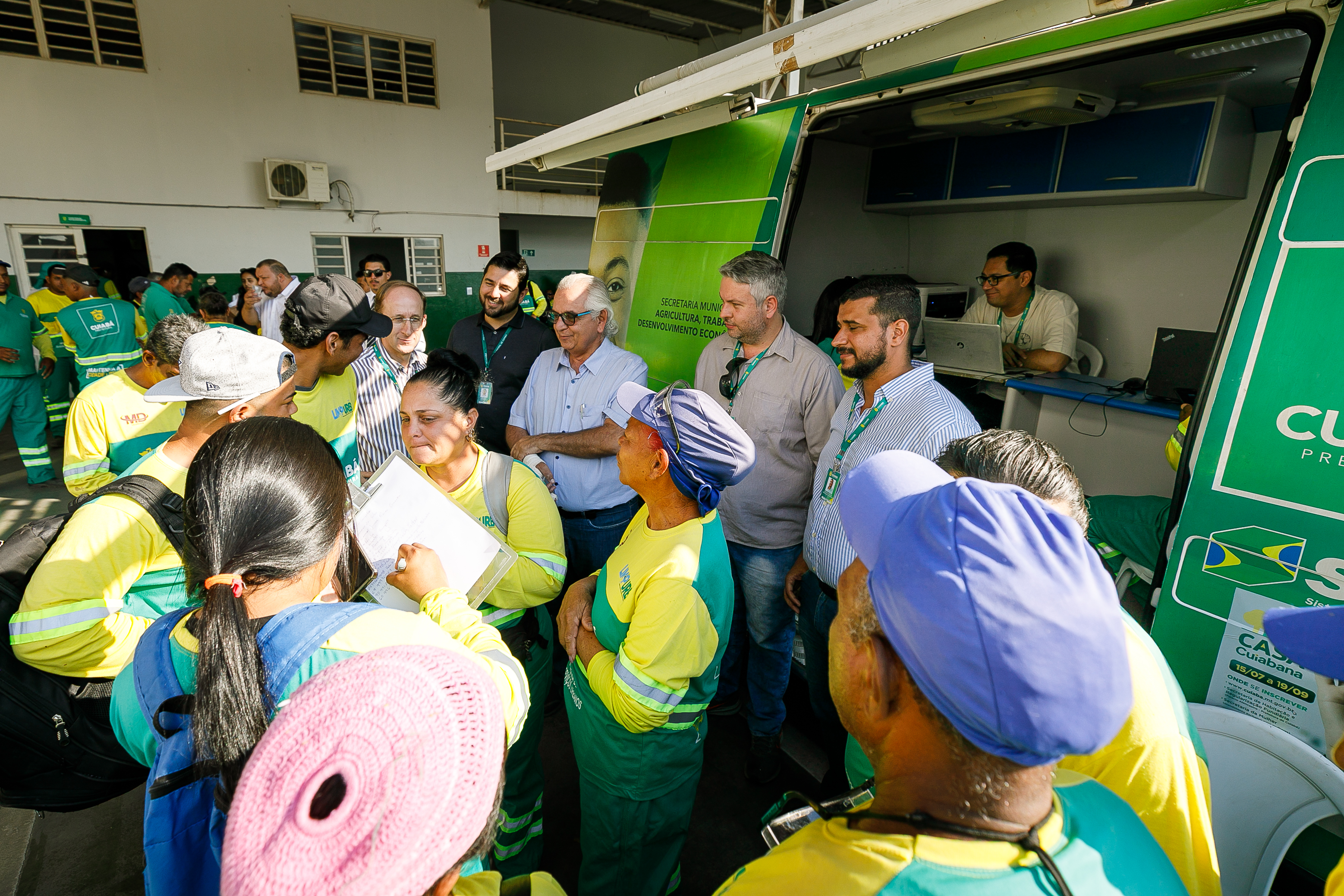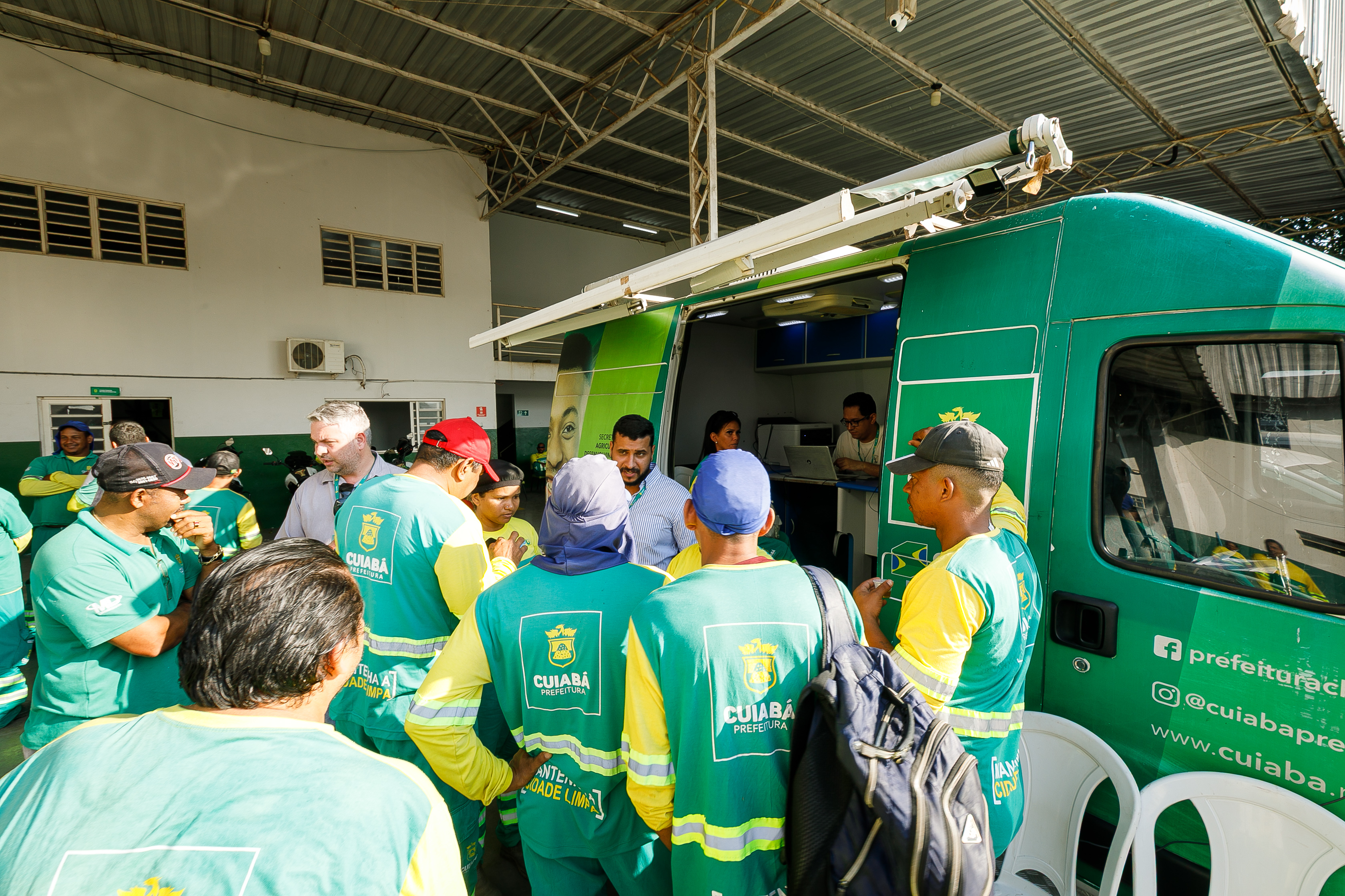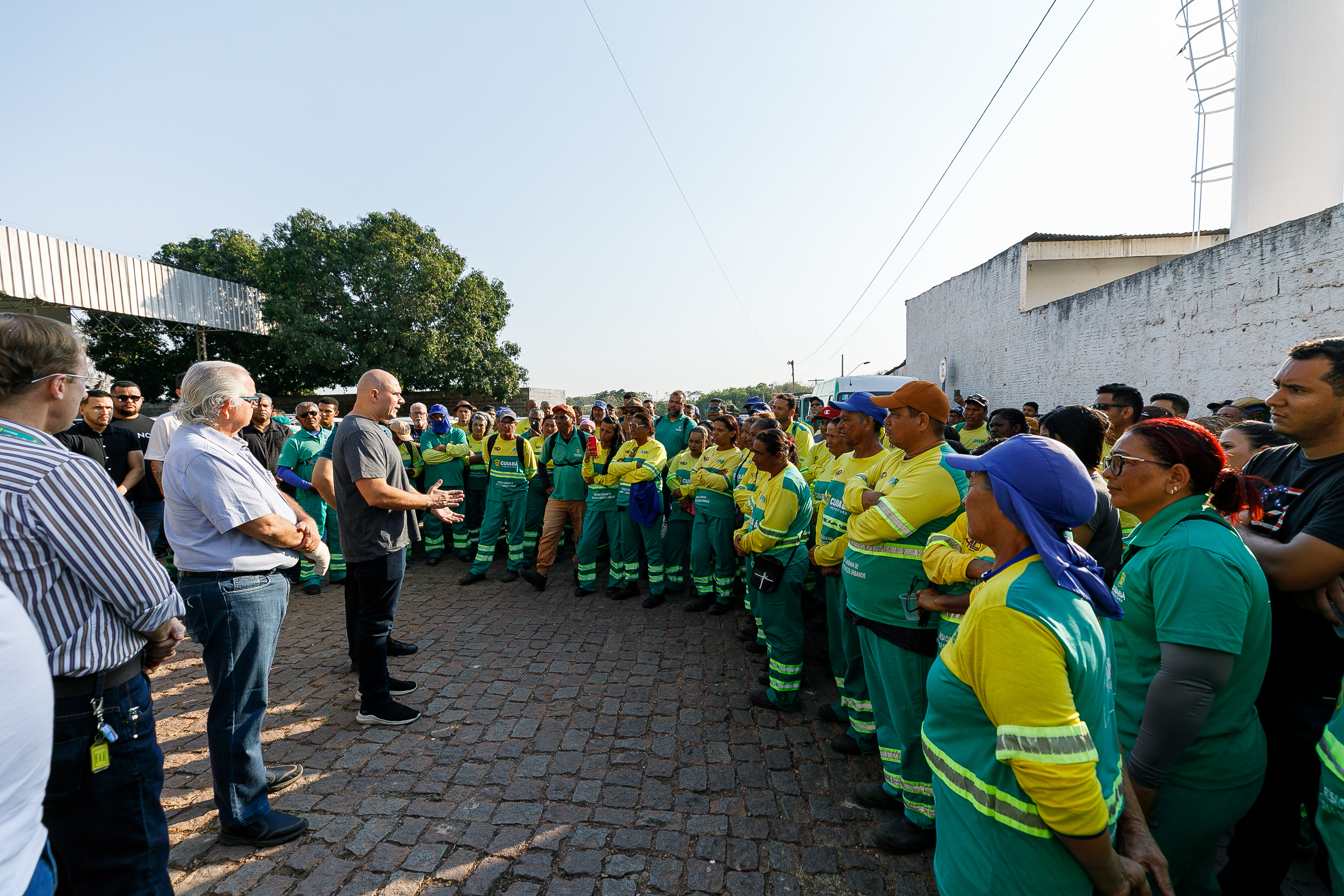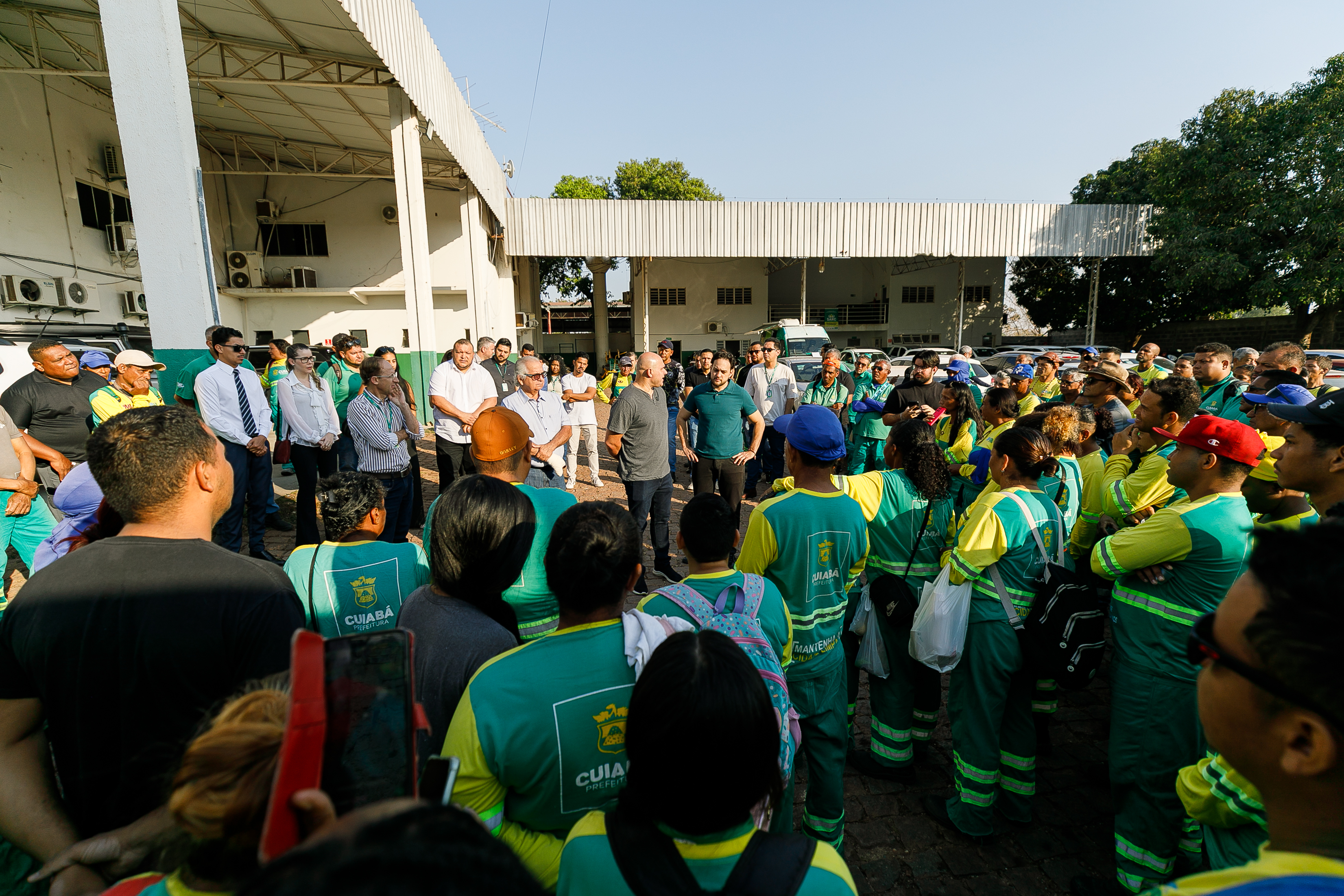 A imagem mostra o prefeito Abilio Brunini em diálogo com os colaboradores da Empresa Cuiabana de Zeladoria e Serviços Urbanos - Limpurb.