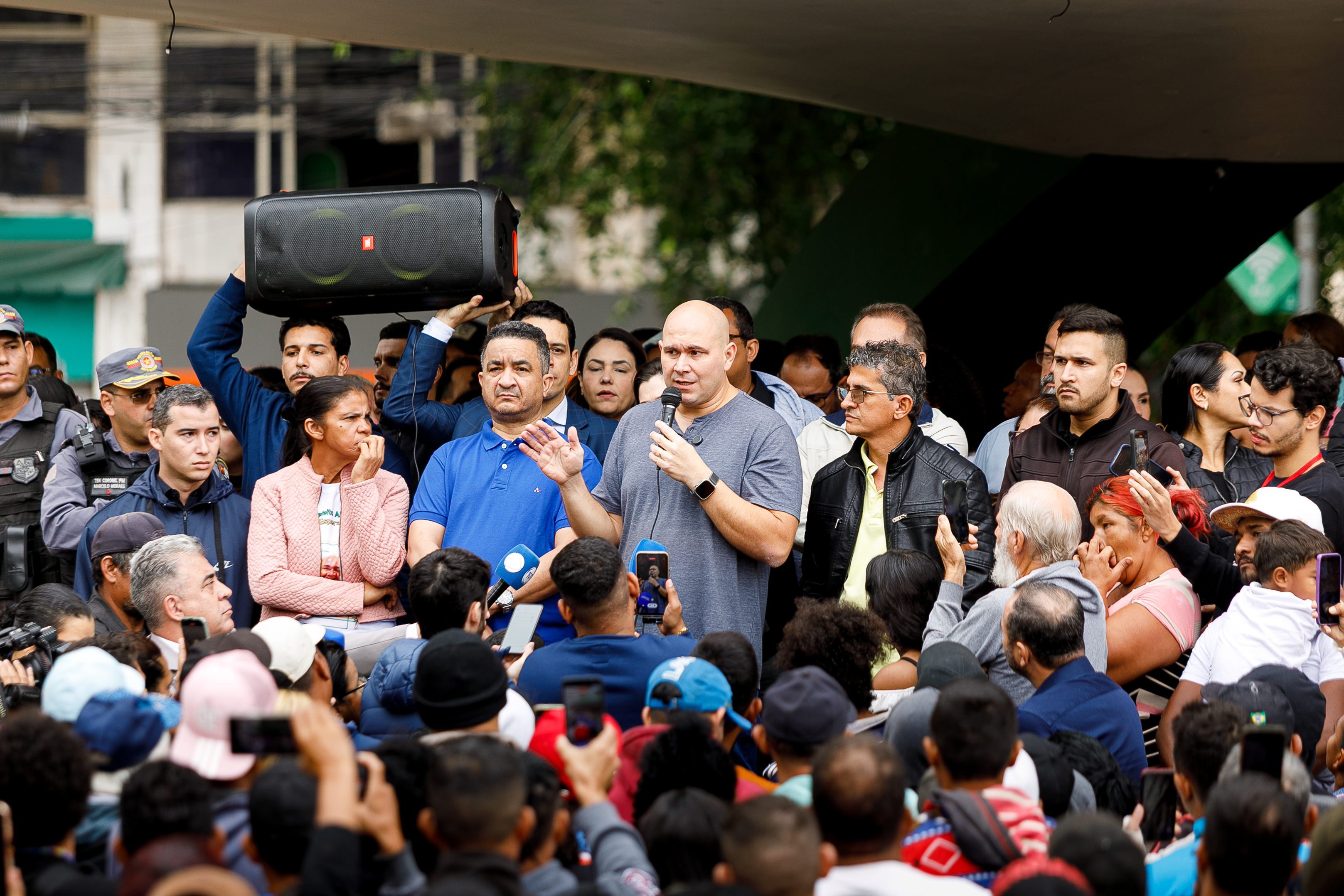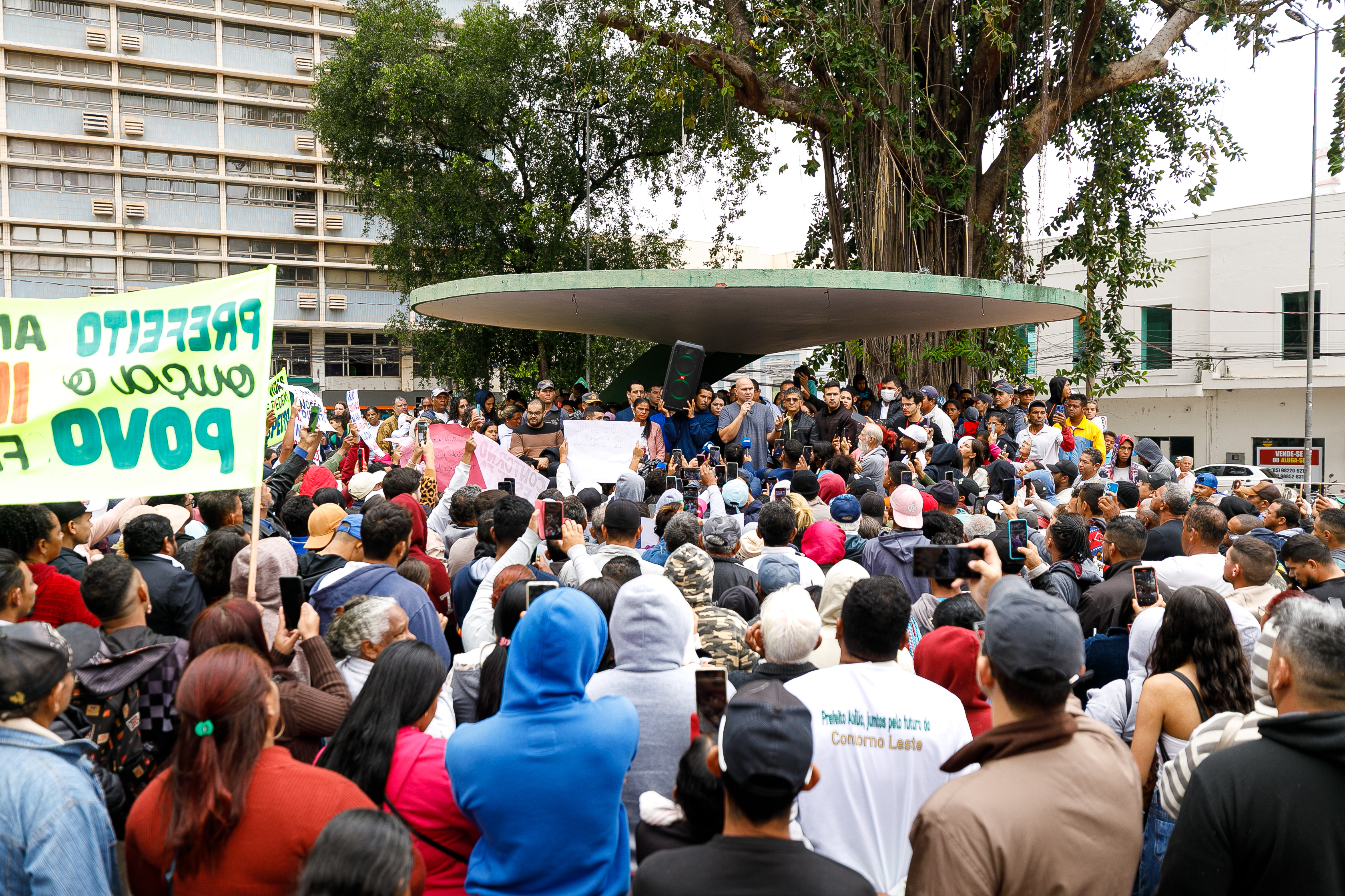 Na imagem principal, o prefeito está com um microfone, em pé ao lado direito, falando com os moradores da região do Contorno Leste.