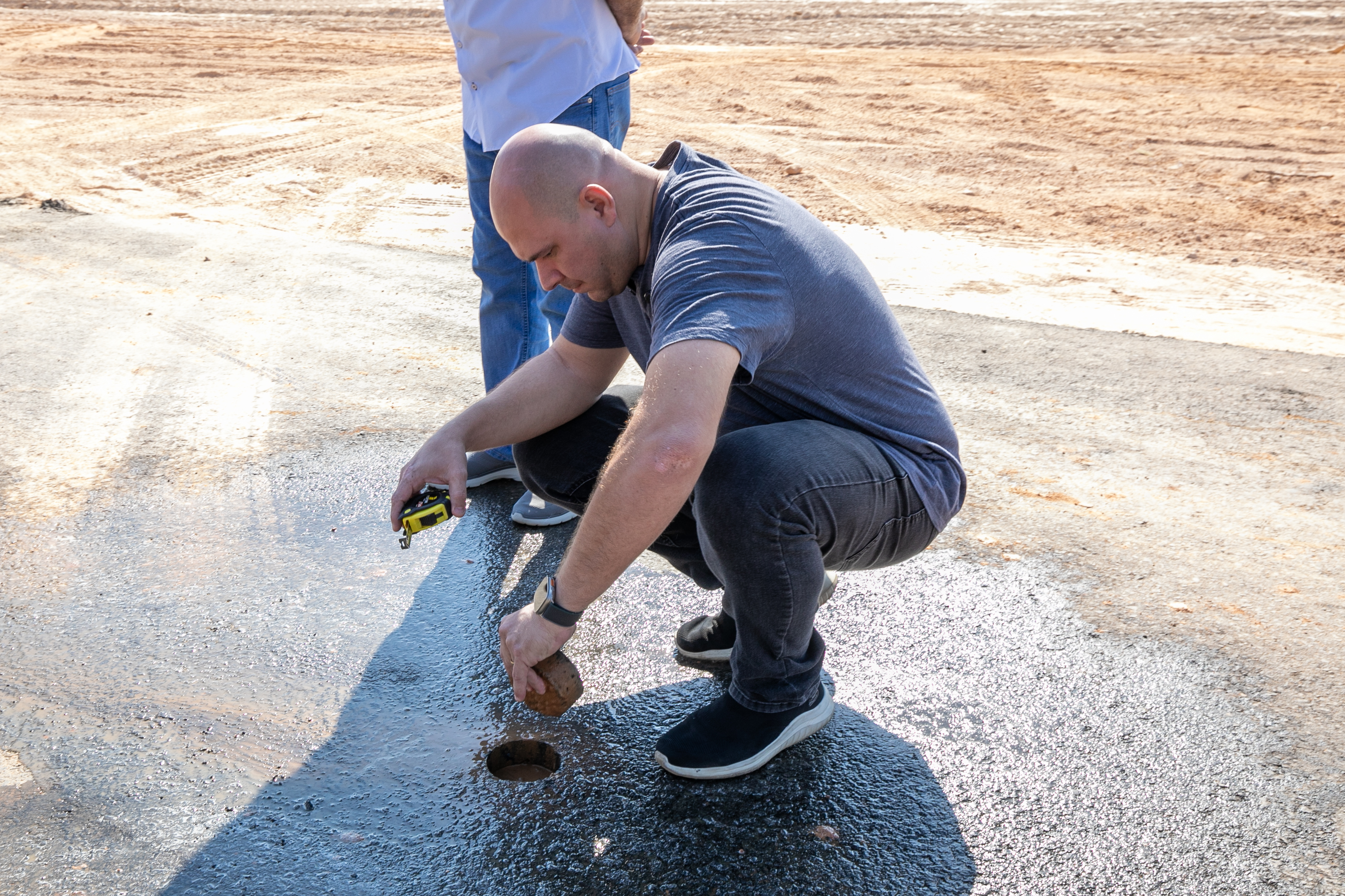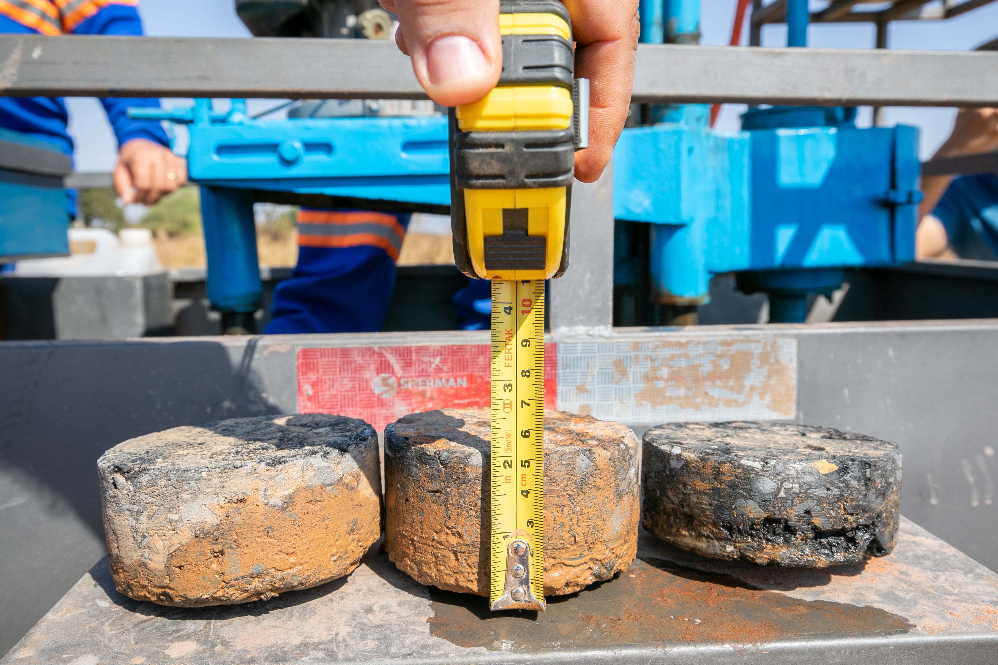 Abilio acompanhou os testes para verificar se a pavimentação está dentro dos padrões exigidos pela norma, que permite uma variação de até 5% na espessura prevista de 5 cm. Ele fez observações técnicas quanto à qualidade da capa asfáltica.