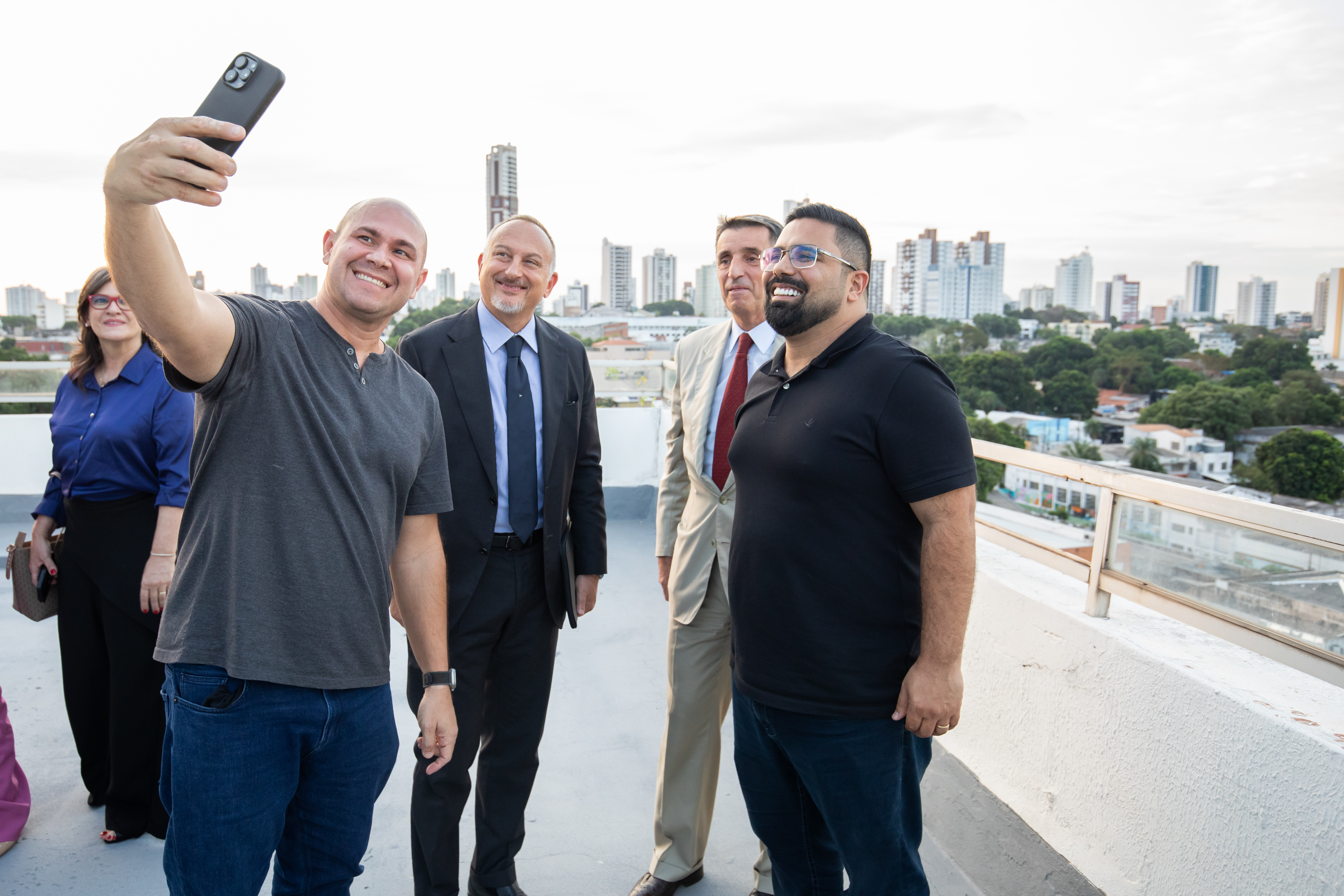 Na imagem principal o prefeito posou para uma foto com os embaixadores da Itália e todos os convidados da agenda. A imagem foi tirada no oitavo andar do Palacio Alencastro com vista para o por do sol.