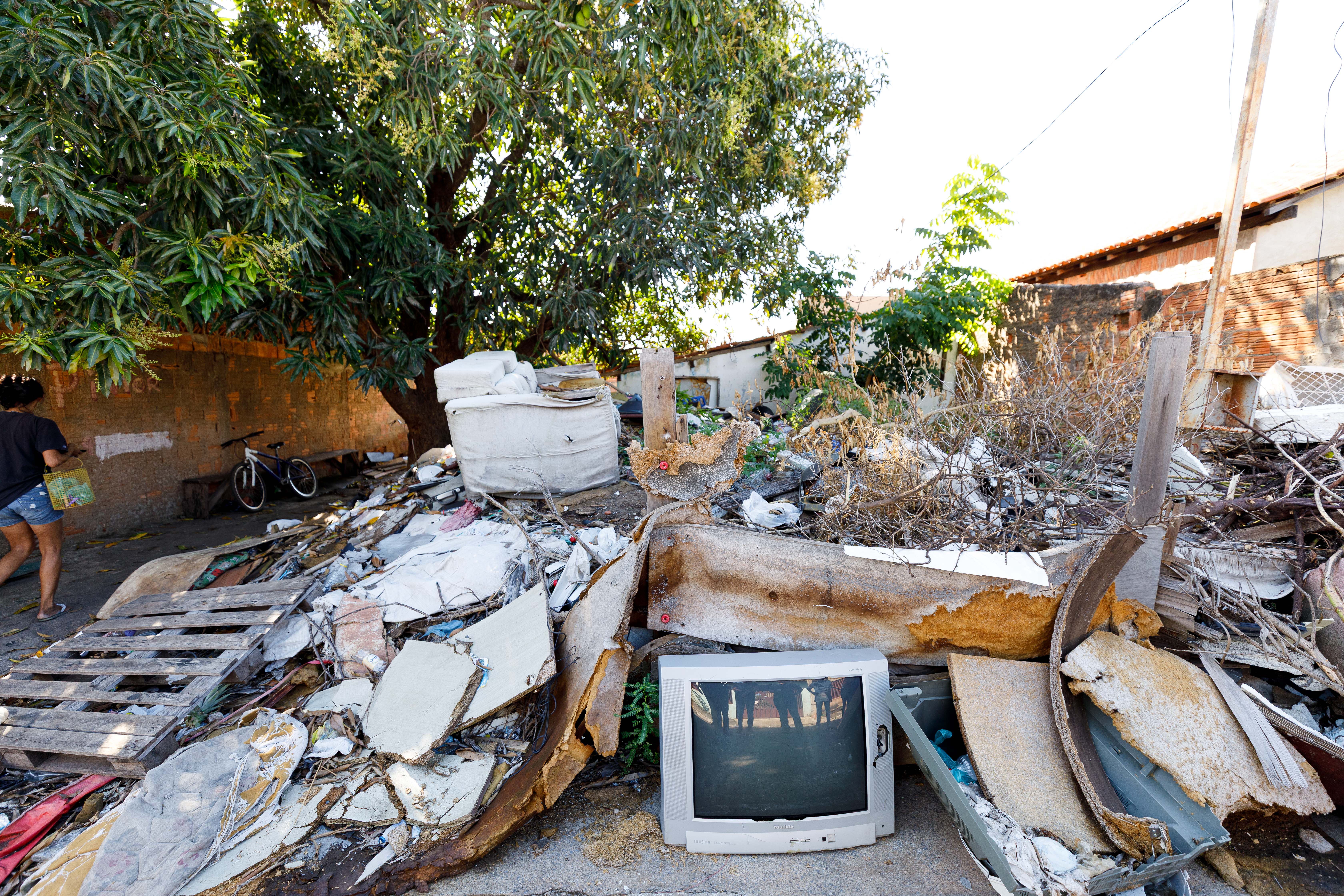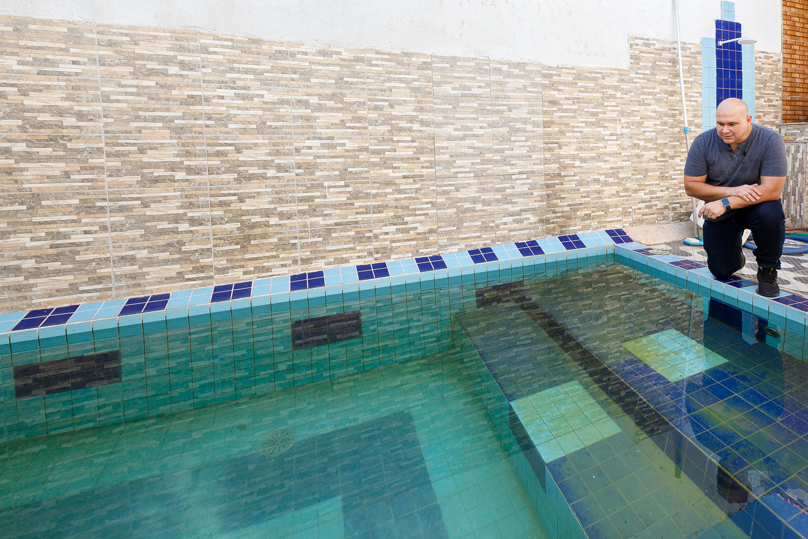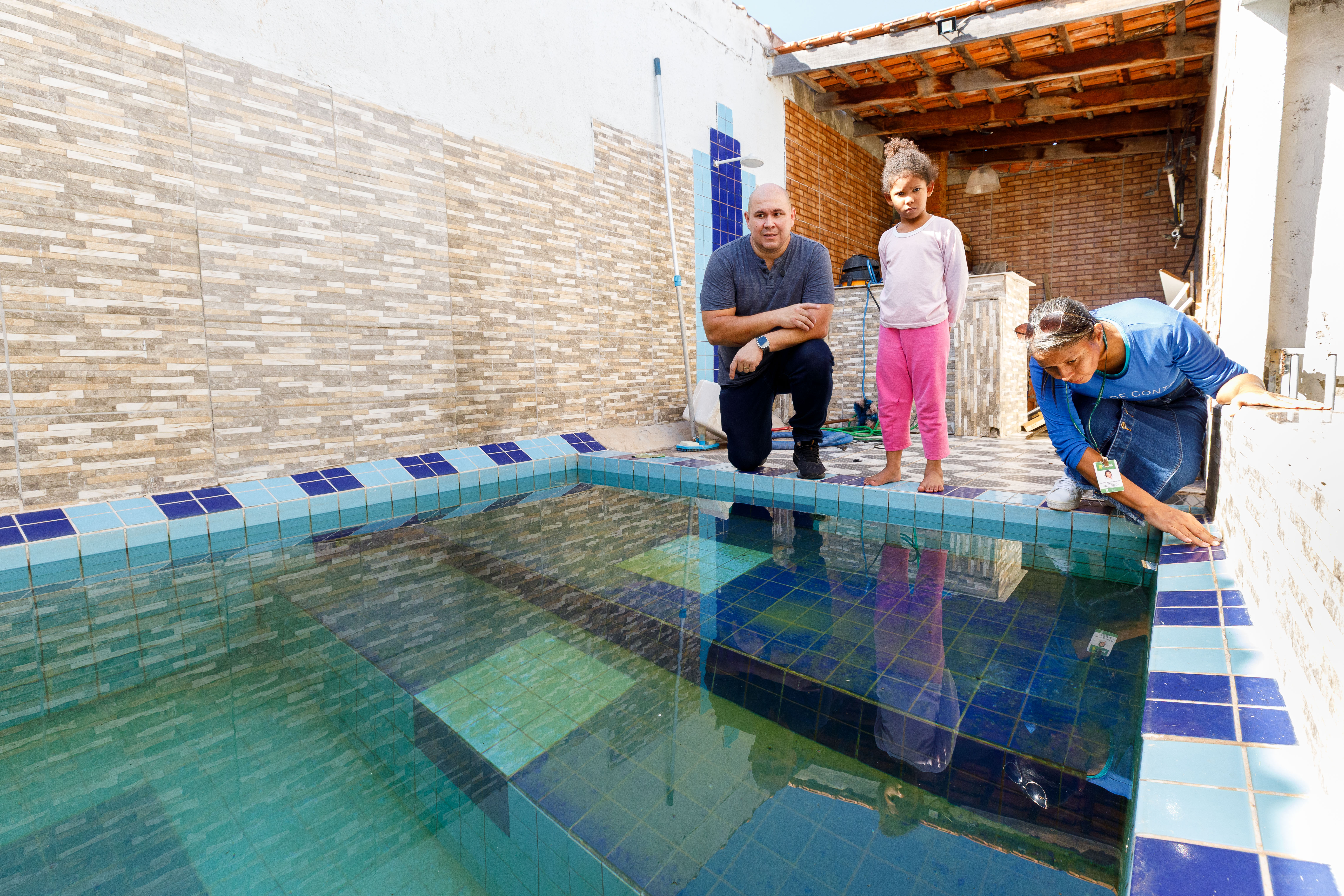 A foto mostra o prefeito Abilio, de camisa cinza, ao lado de uma moradora em um quintal do bairro Pedra 90. Eles olham uma bacia com água parada.