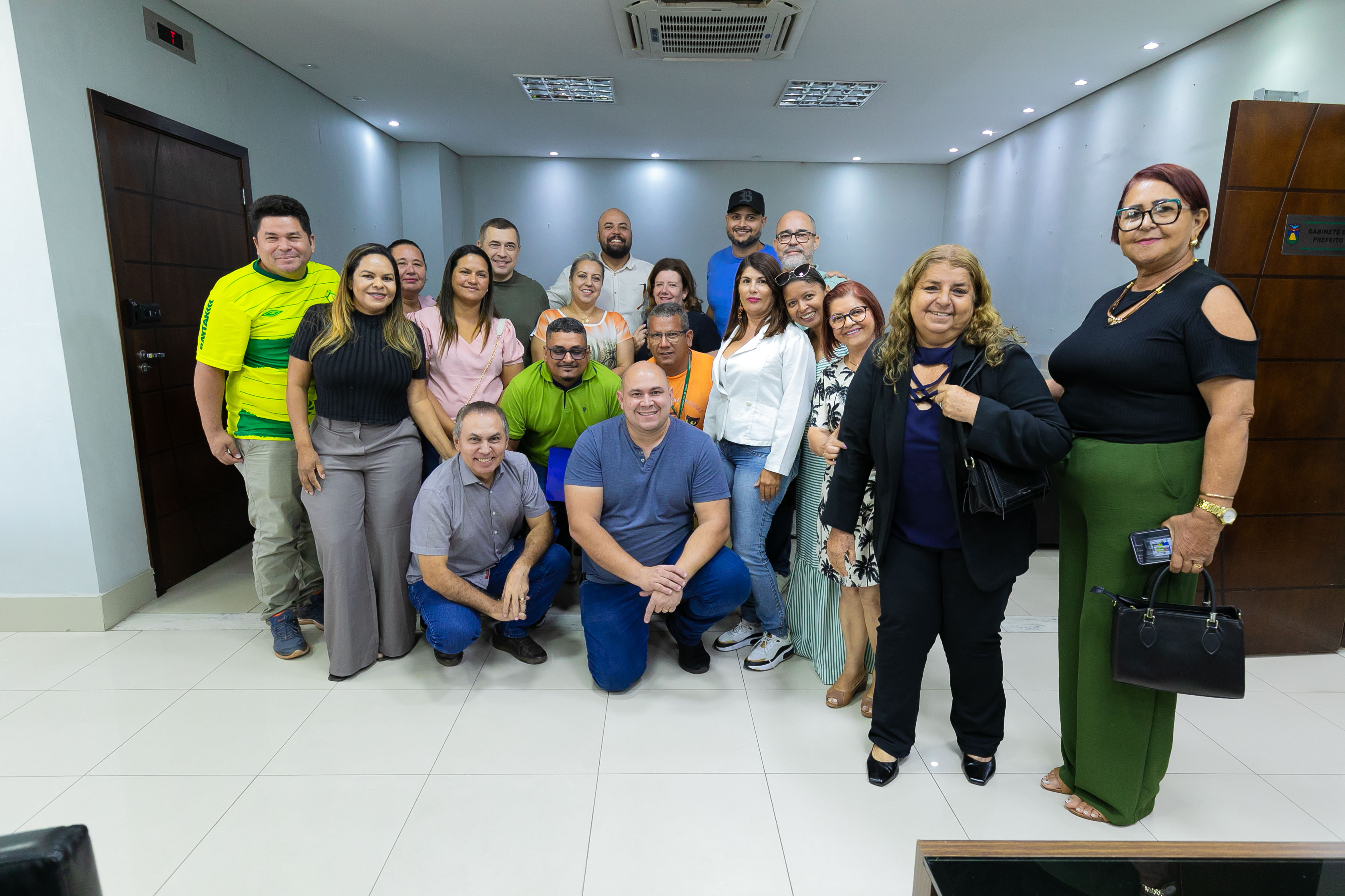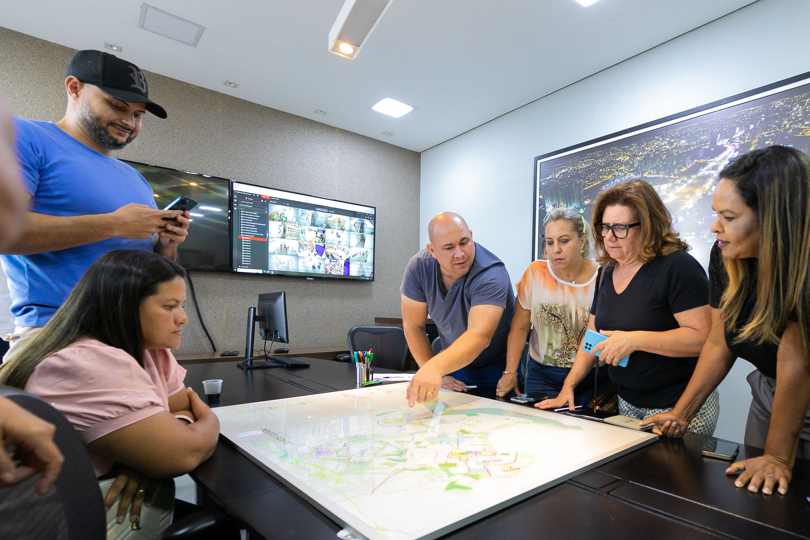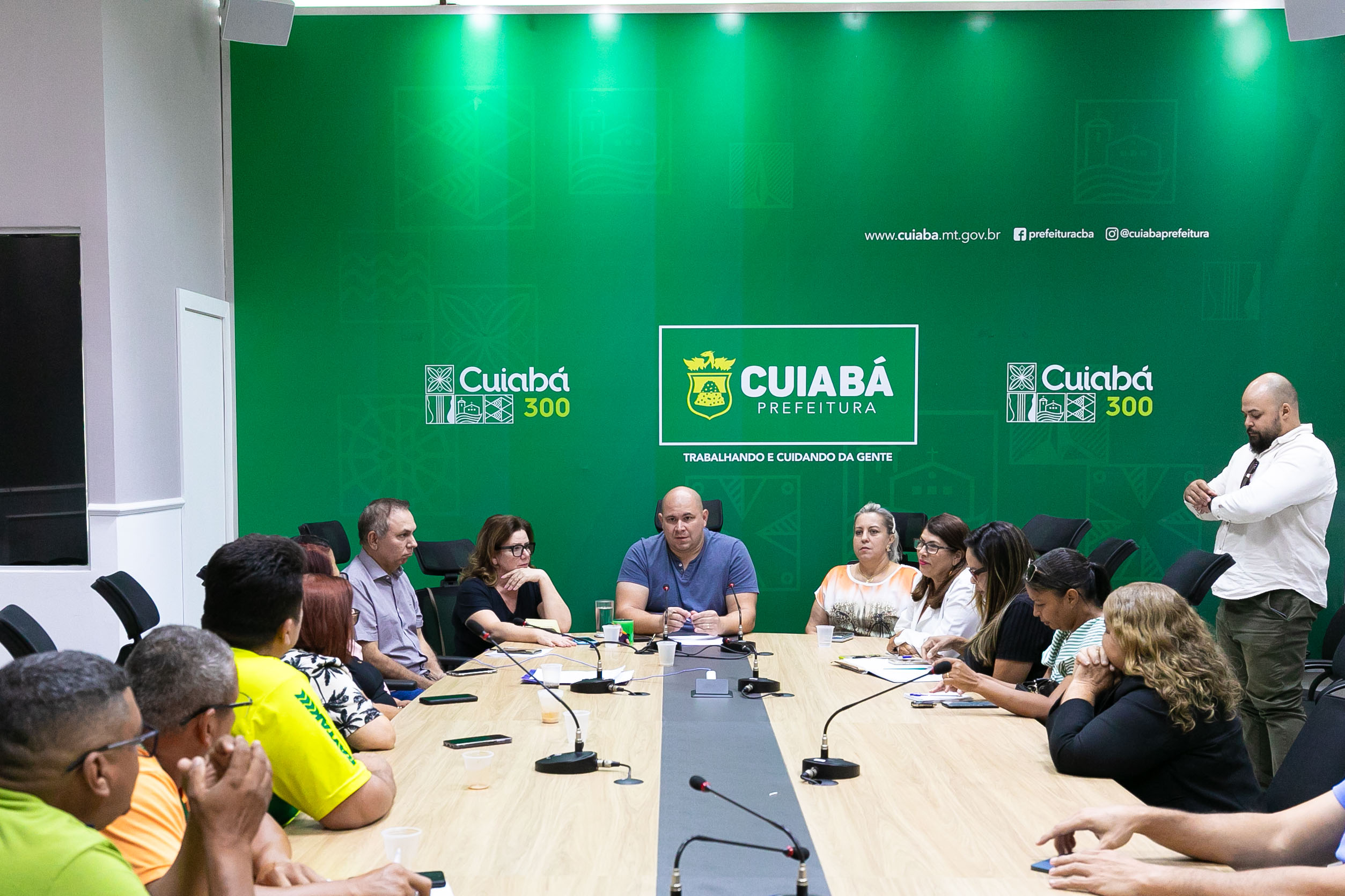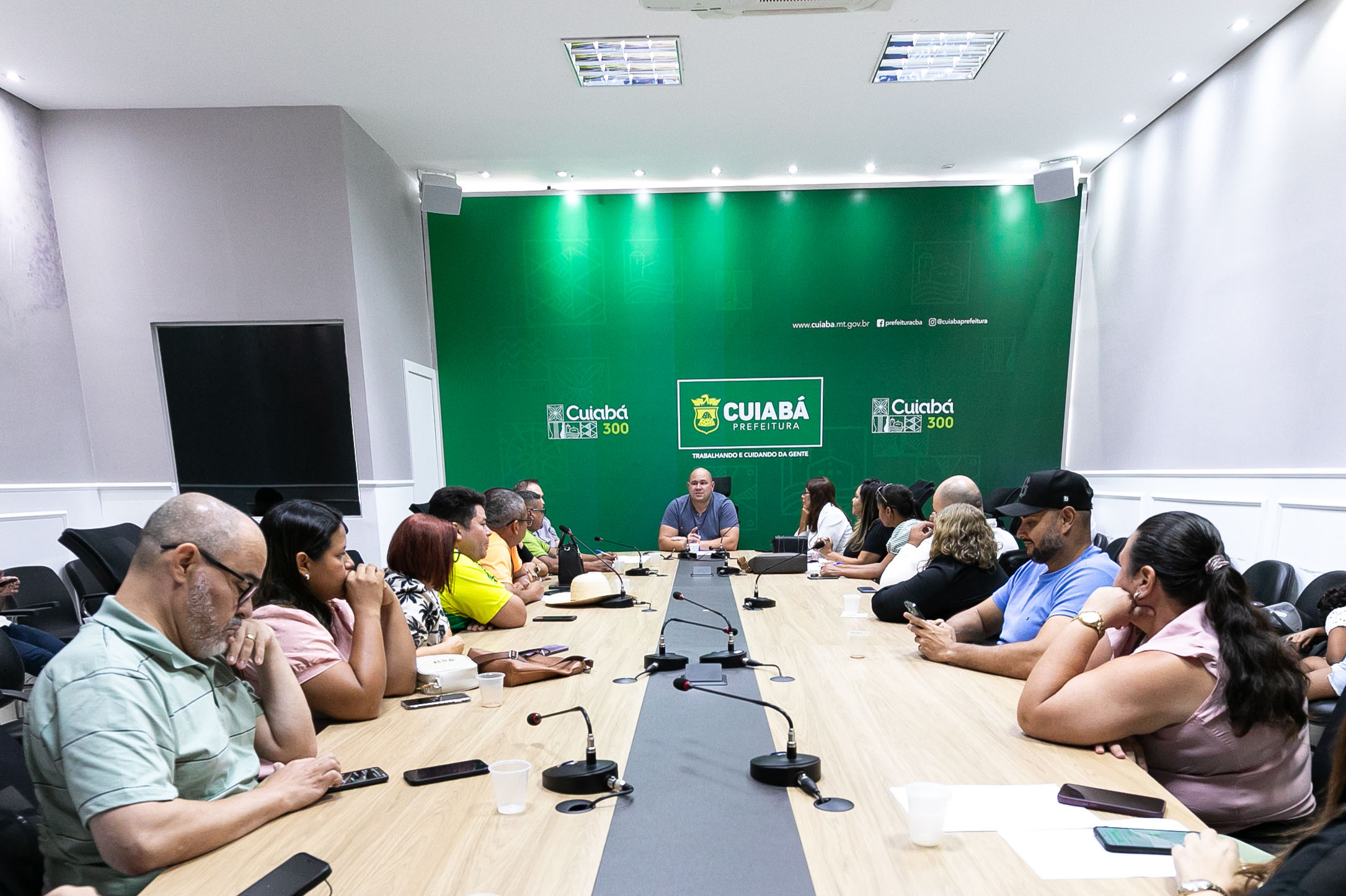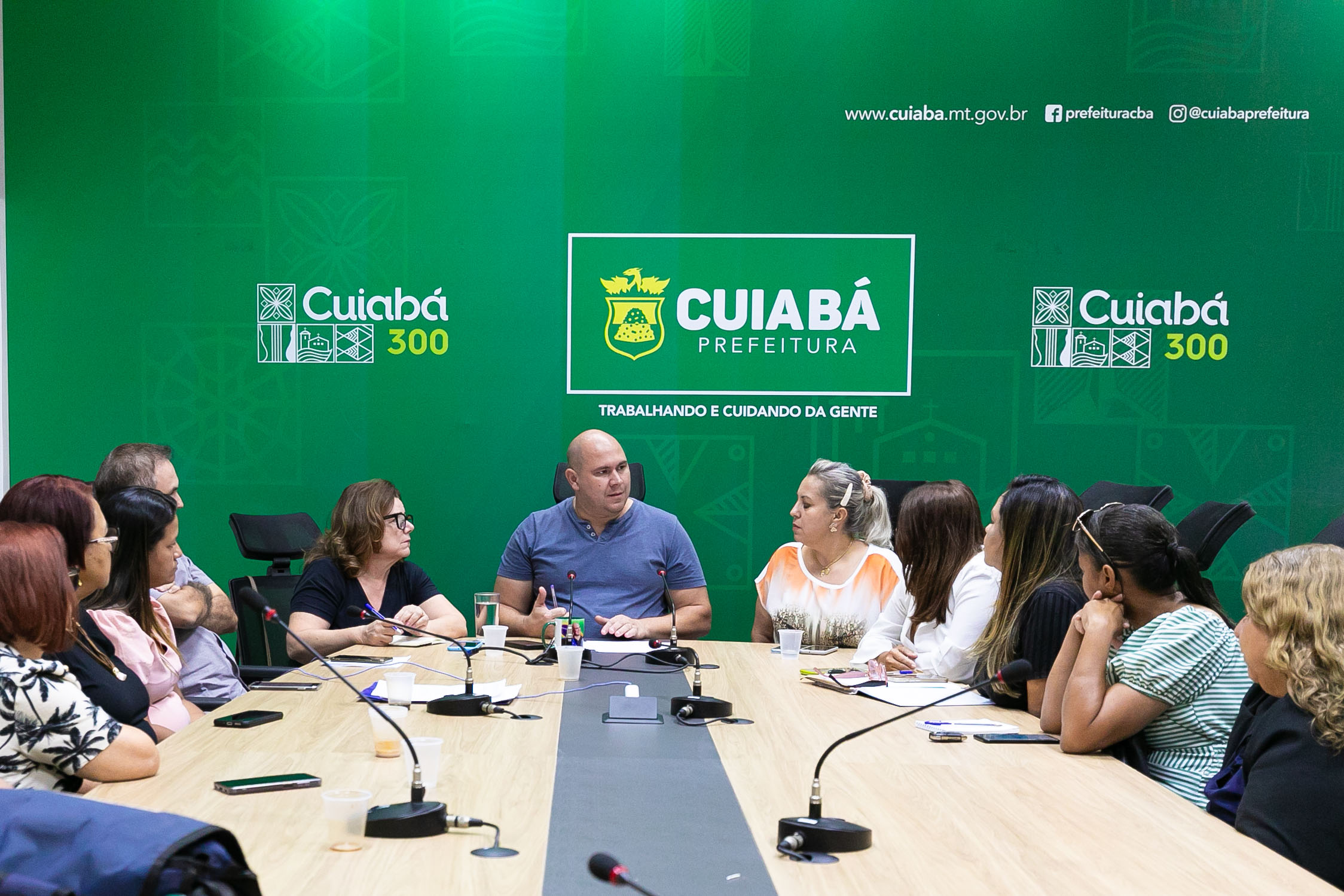 A imagem mostra um ambiente amplo, tipo uma sala para reuniões, com mesa comprida e várias sentadas ao redor. Ao fundo da sala um painel verde com a identificação do local, sendo na Prefeitura de Cuiabá. Liderando a equipe está um homem, na ponta da mesa, que é o prefeito de Cuiabá, Abilio Brunini.