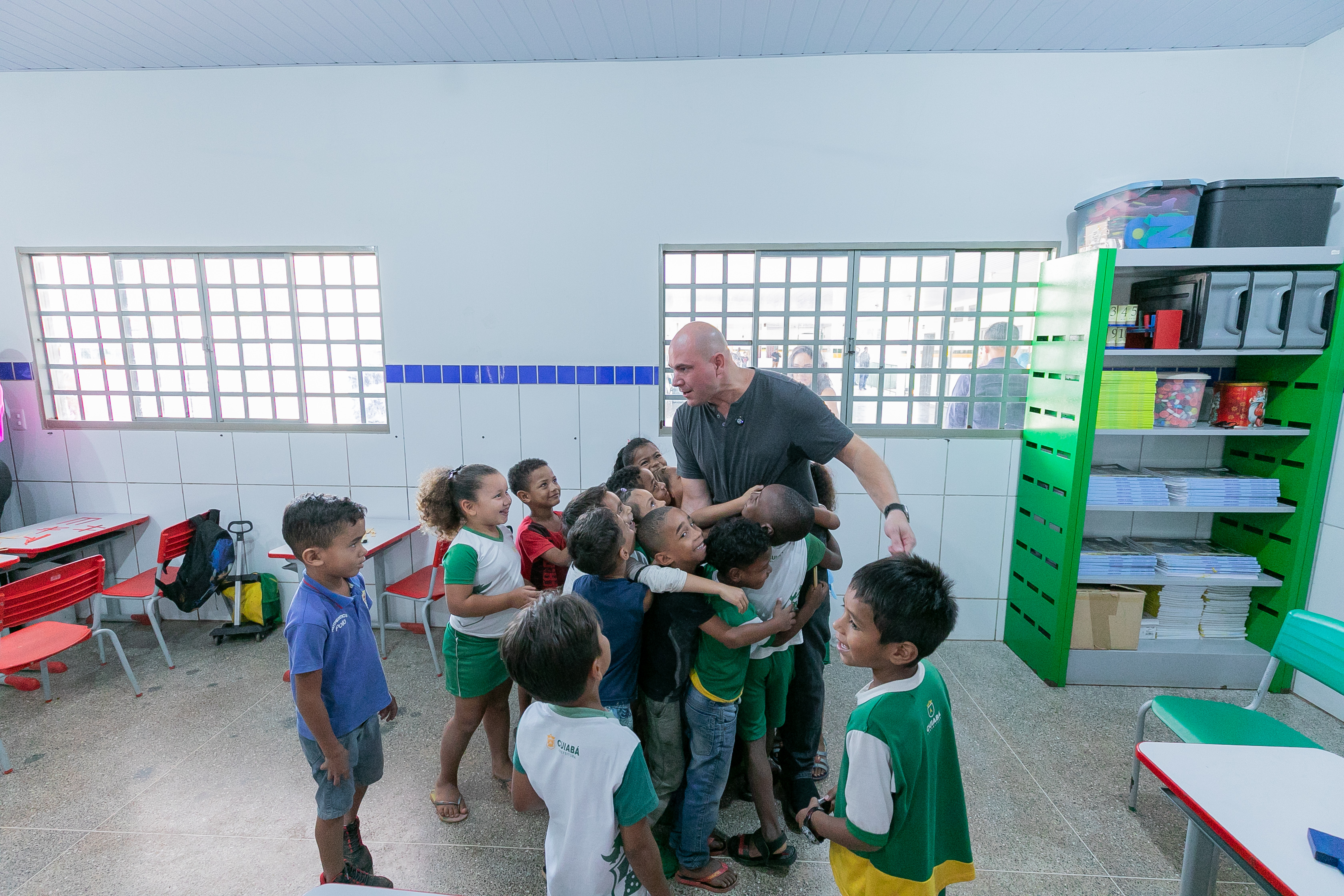 A foto ilustra o prefeito Abilio Brunini vestido de camisa cinza e ajoelhado numa posição de foto. Ele está cercado de crianças que exibem a capa de livros.