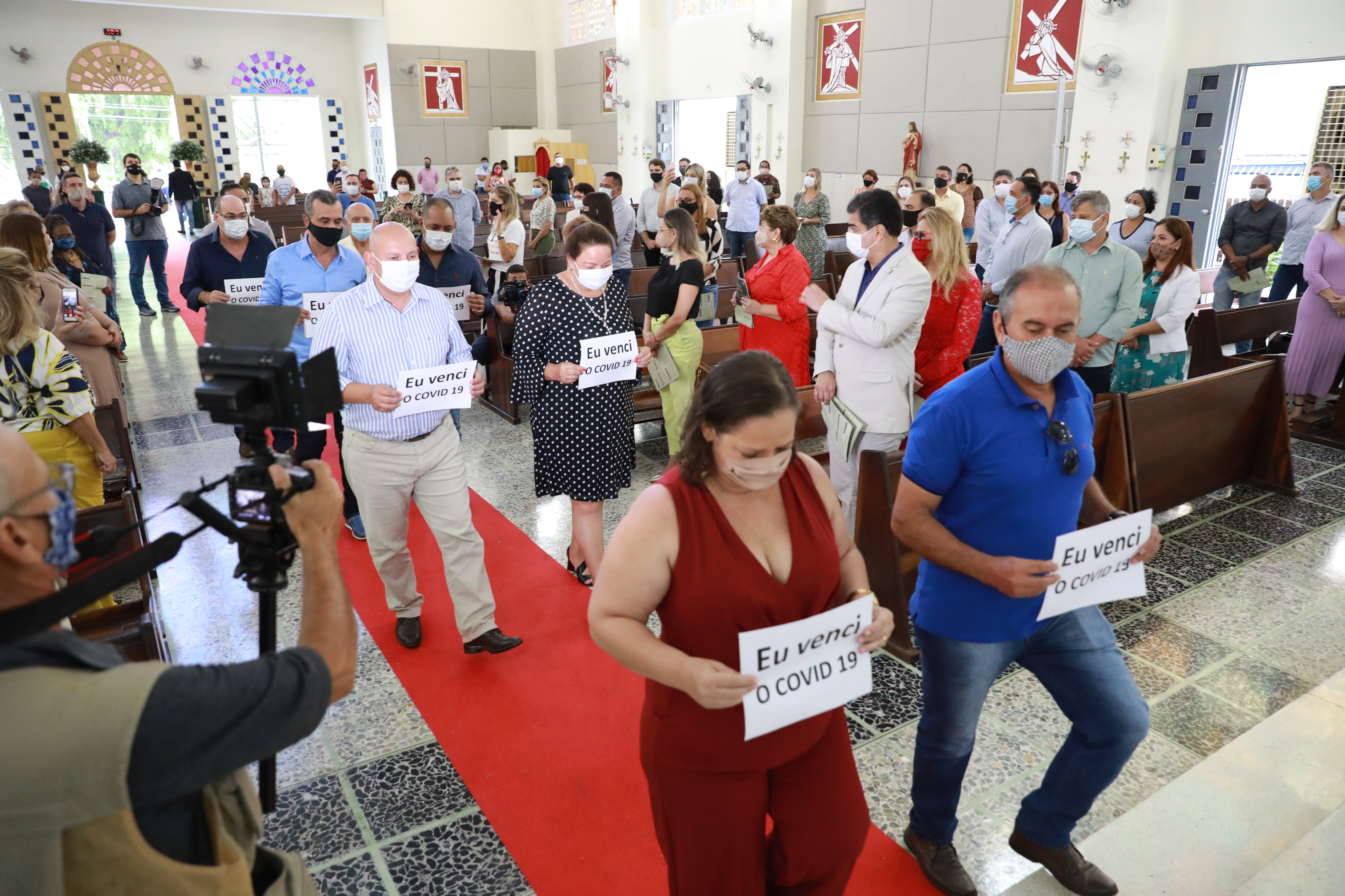 A Missa da Esperança foi marcada pela emoção, quando os secretários Juarez Samaniego, Antenor Figueiredo, Ivone Souza, os vereadores Renivaldo Nascimento, Marcos Veloso, Ricardo Saad e Juca do Guaraná, entraram na Catedral carregando placas com a frase: “Eu venci a Covid-19”.