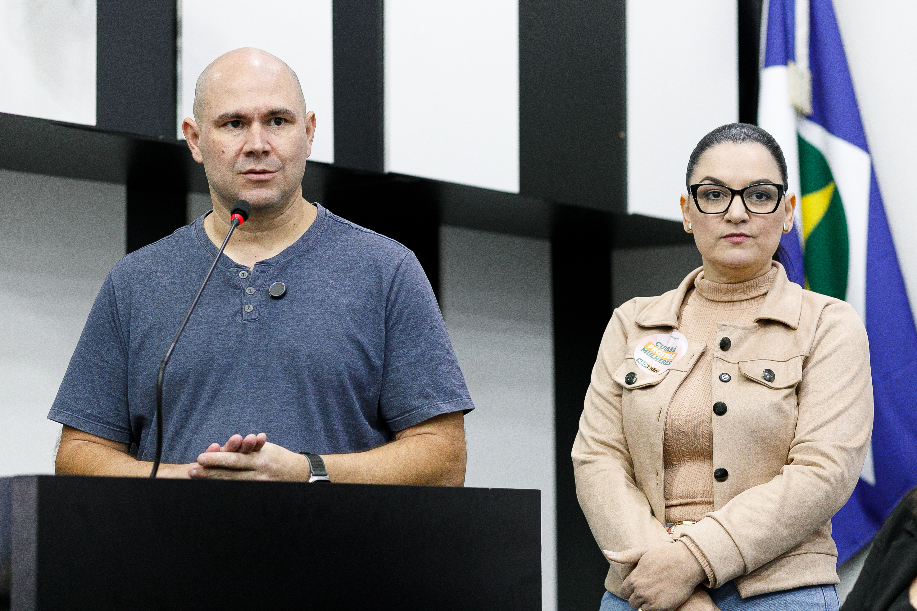 A foto que ilustra a matéria mostra o prefeito de Cuiabá, Abilio Brunini, e a primeira-dama e vereadora Samanta Iris na tribuna da Câmara de Cuiabá durante a audiência pública. As secretárias municipais Hadassah Suzannah (Mulher) e Juliana Palhares (Ordem Pública), bem como a vereadora e presidente da Câmara, Paula Calil, também aparecem junto ao dispositivo da Mesa.