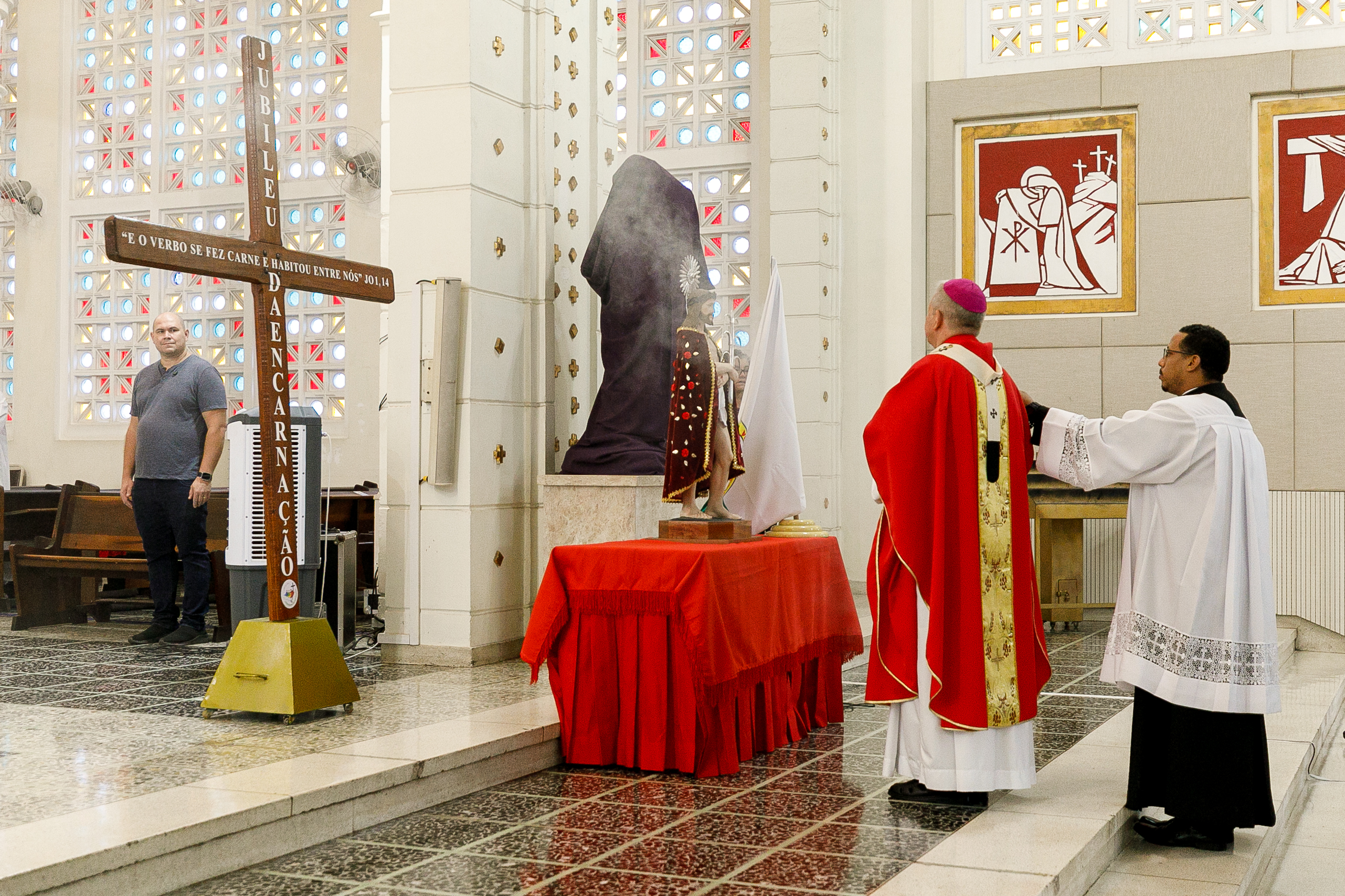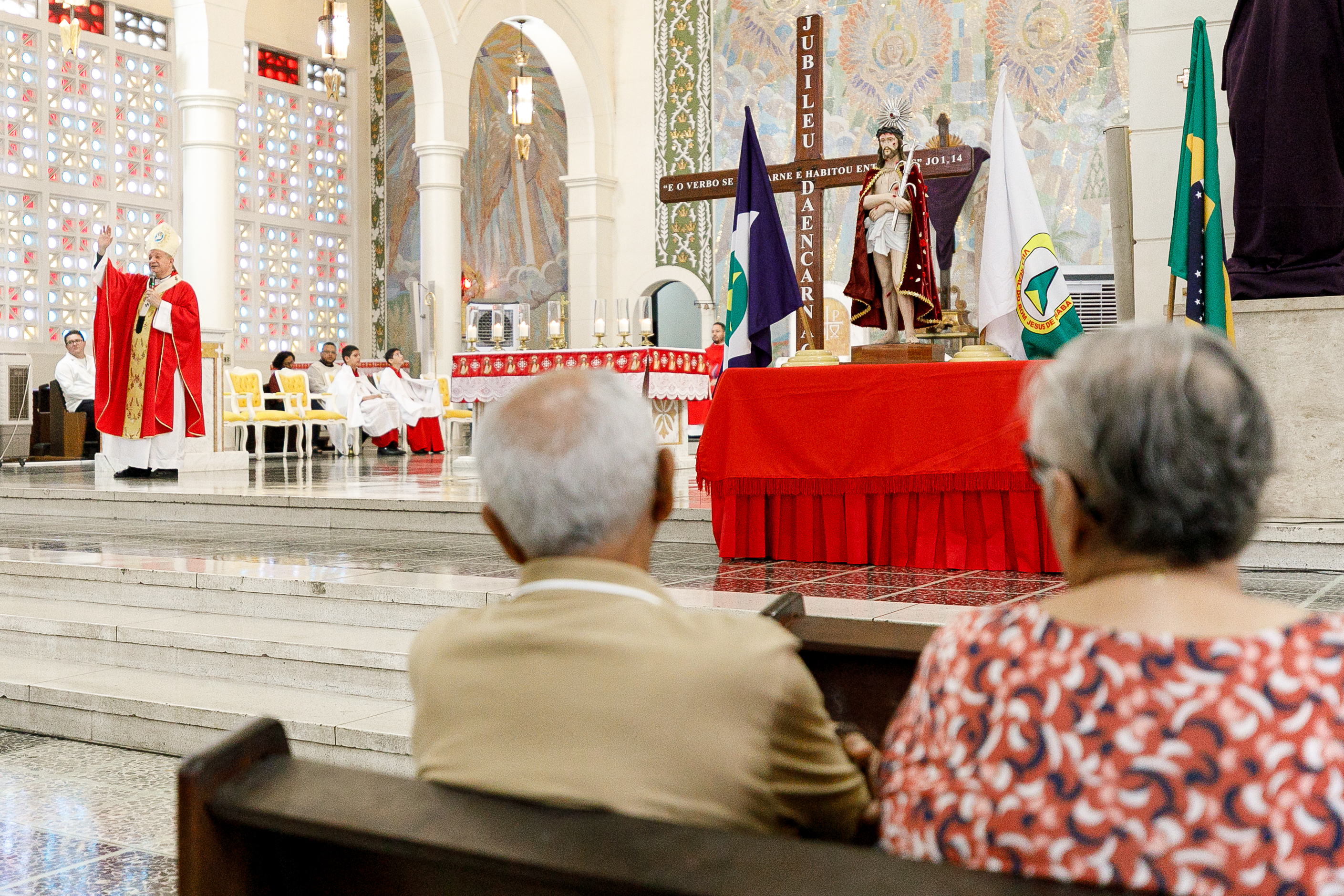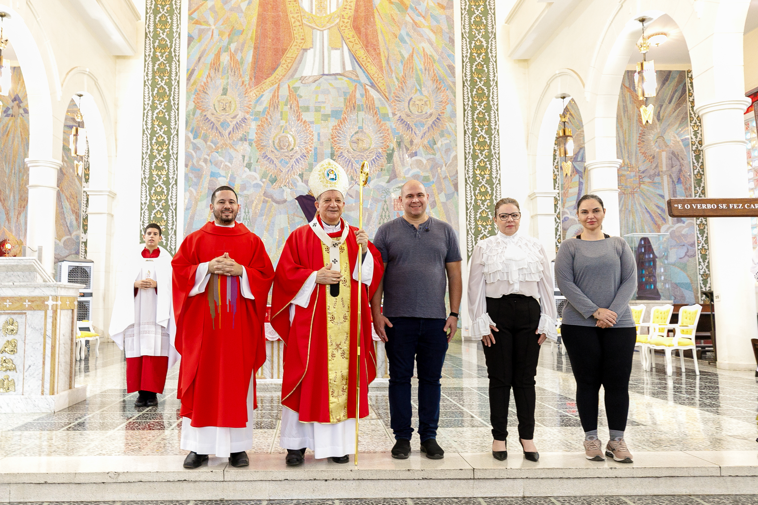 Na imagem principal Abilio, Vânia e Paula estão no altar da igreja Basilia Matriz, no segundo plano altoridades eclesiásticas acompanham a abertura da missa.