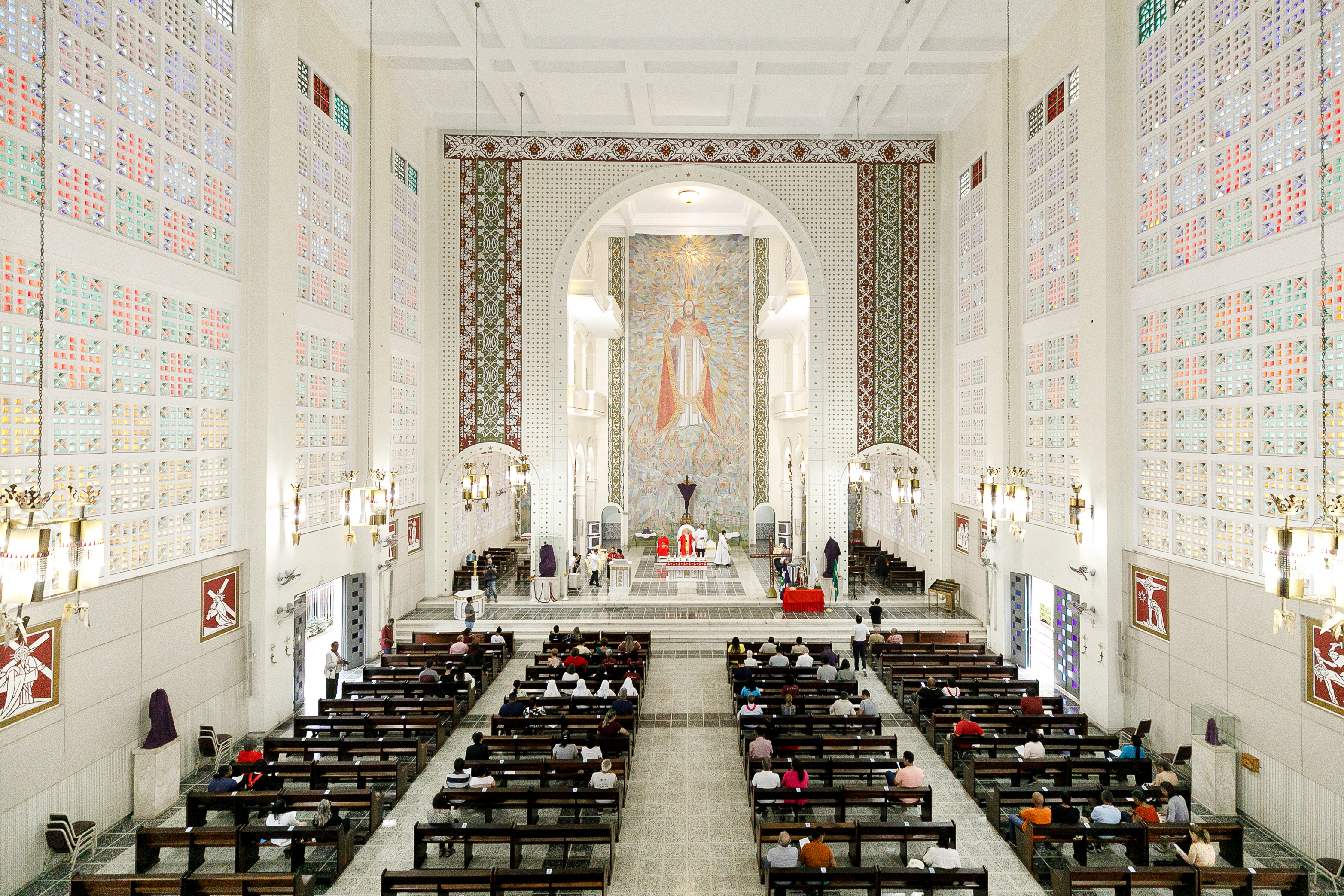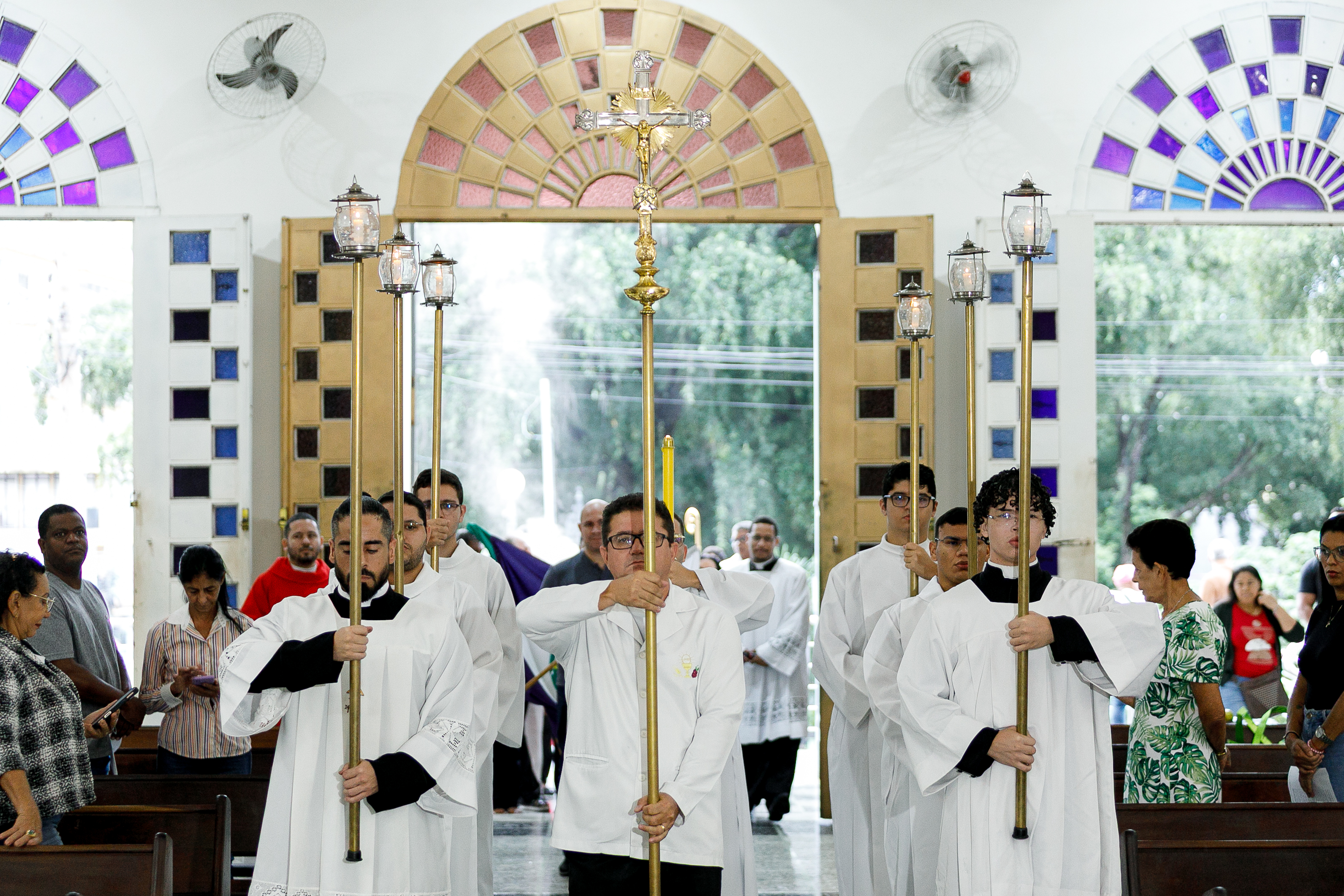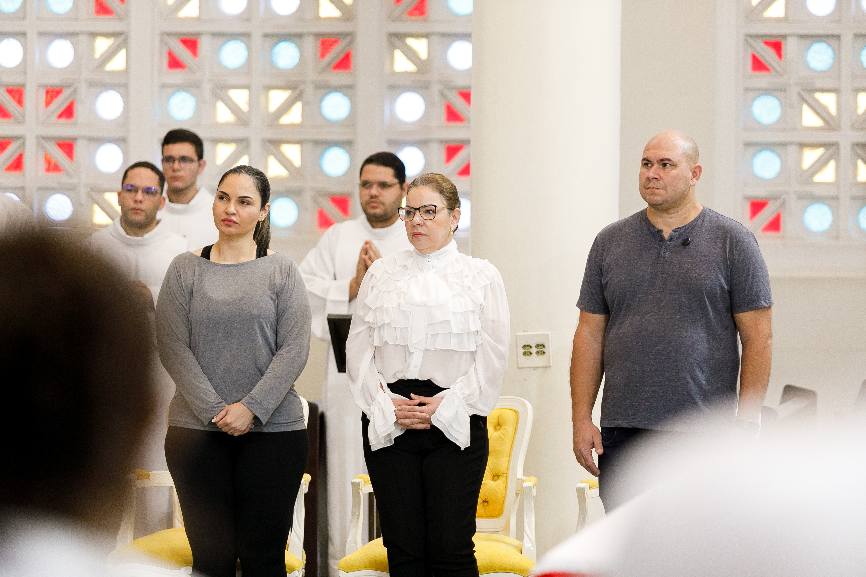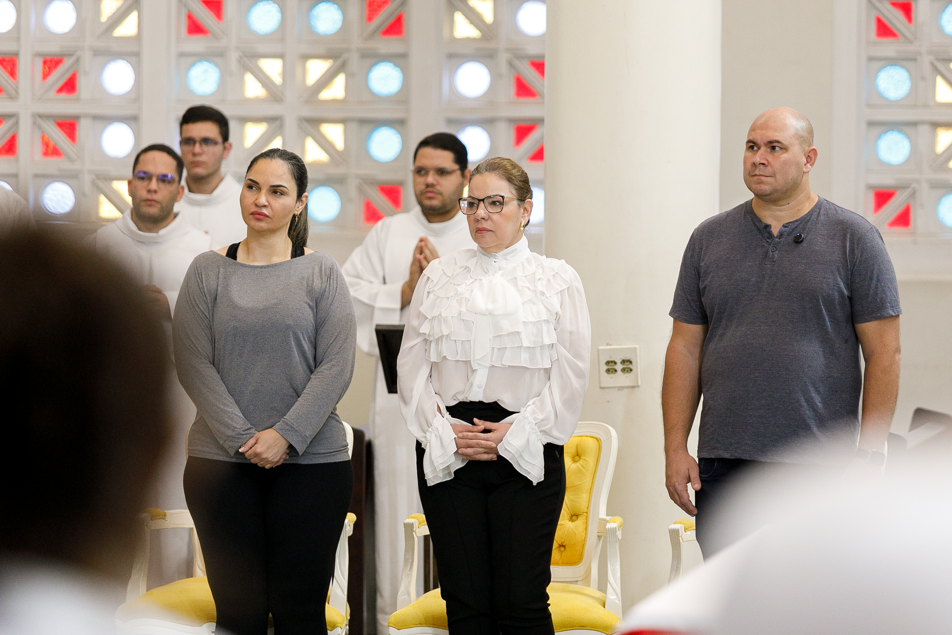 Na imagem principal Abilio, Vânia e Paula estão no altar da igreja Basilia Matriz, no segundo plano altoridades eclesiásticas acompanham a abertura da missa.