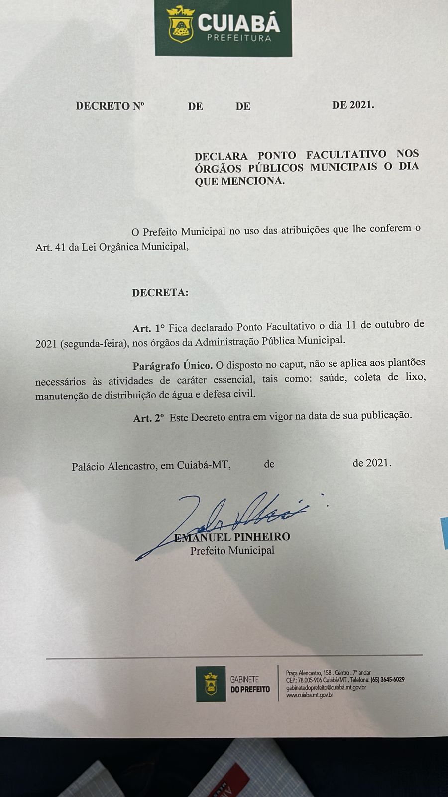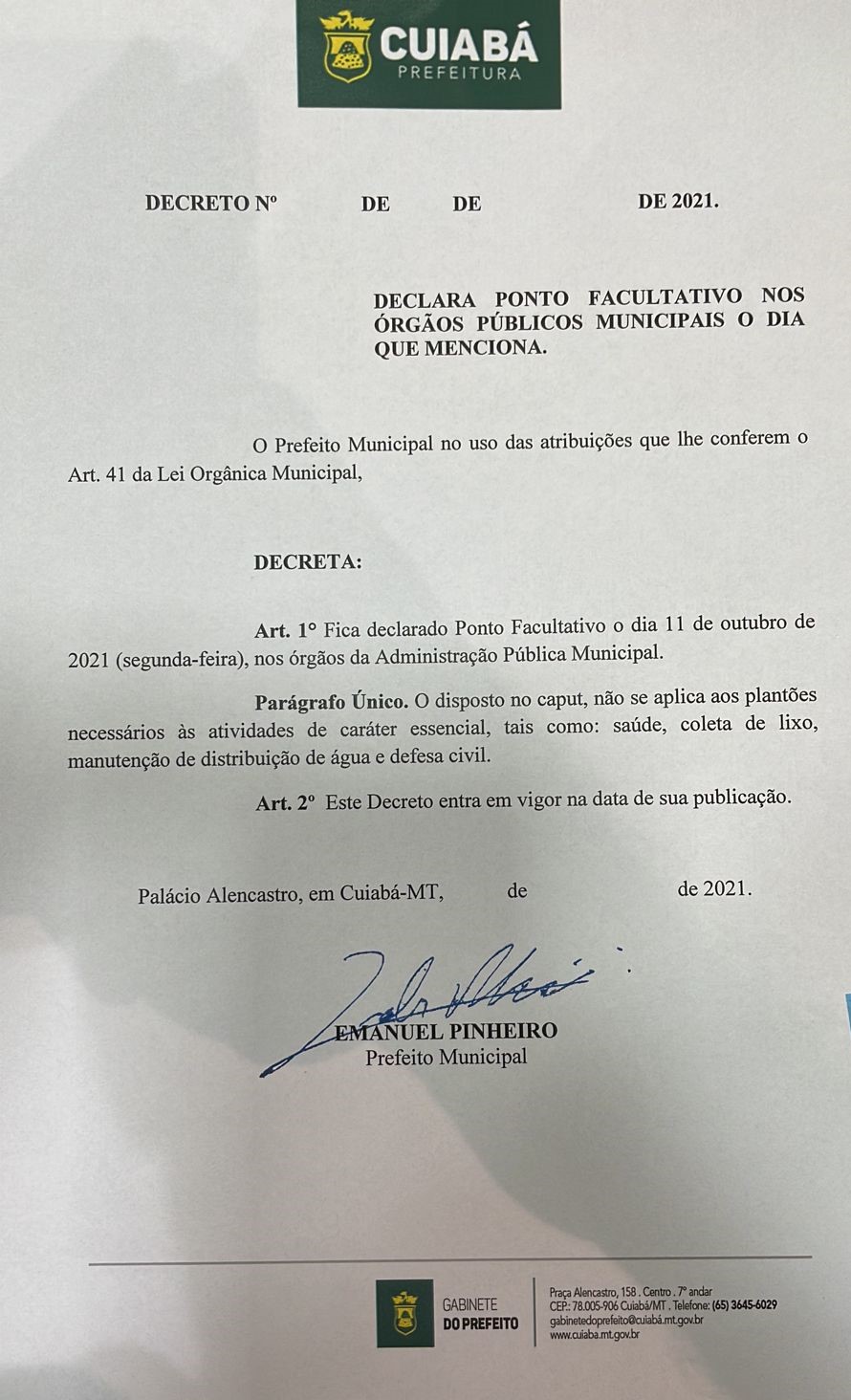 O prefeito de Cuiabá, Emanuel Pinheiro, editou Decreto 8.675/2021 nesta quinta-feira (7), determinando a adoção de ponto facultativo na próxima segunda-feira (11) véspera de feriado religioso em celebração a Nossa Senhora Aparecida (12 de outubro).