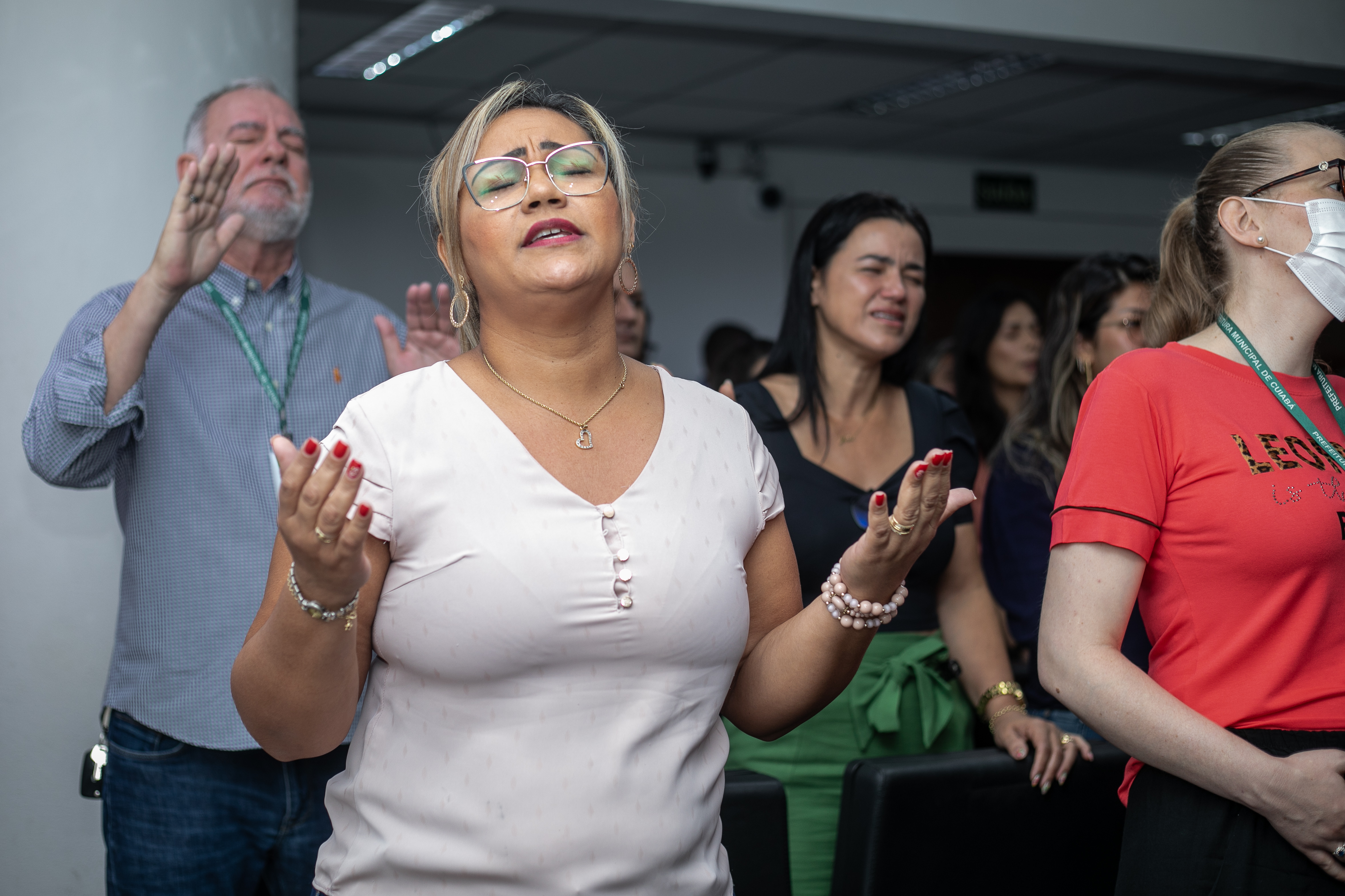 O prefeito de Cuiabá, Emanuel Pinheiro, participou na manhã desta terça-feira (28), com secretários e servidores do Executivo Municipal, de um Culto de Ação de Graças, ministrado pela pastora da Igreja Brados dos Leões, Yasmin Duarte, no auditório do Palácio Alencastro. A mensagem deixada aos colaboradores, no encerramento do segundo mês de 2023 é de que temos que direcionar as nossas vidas aos comandos de Deus.