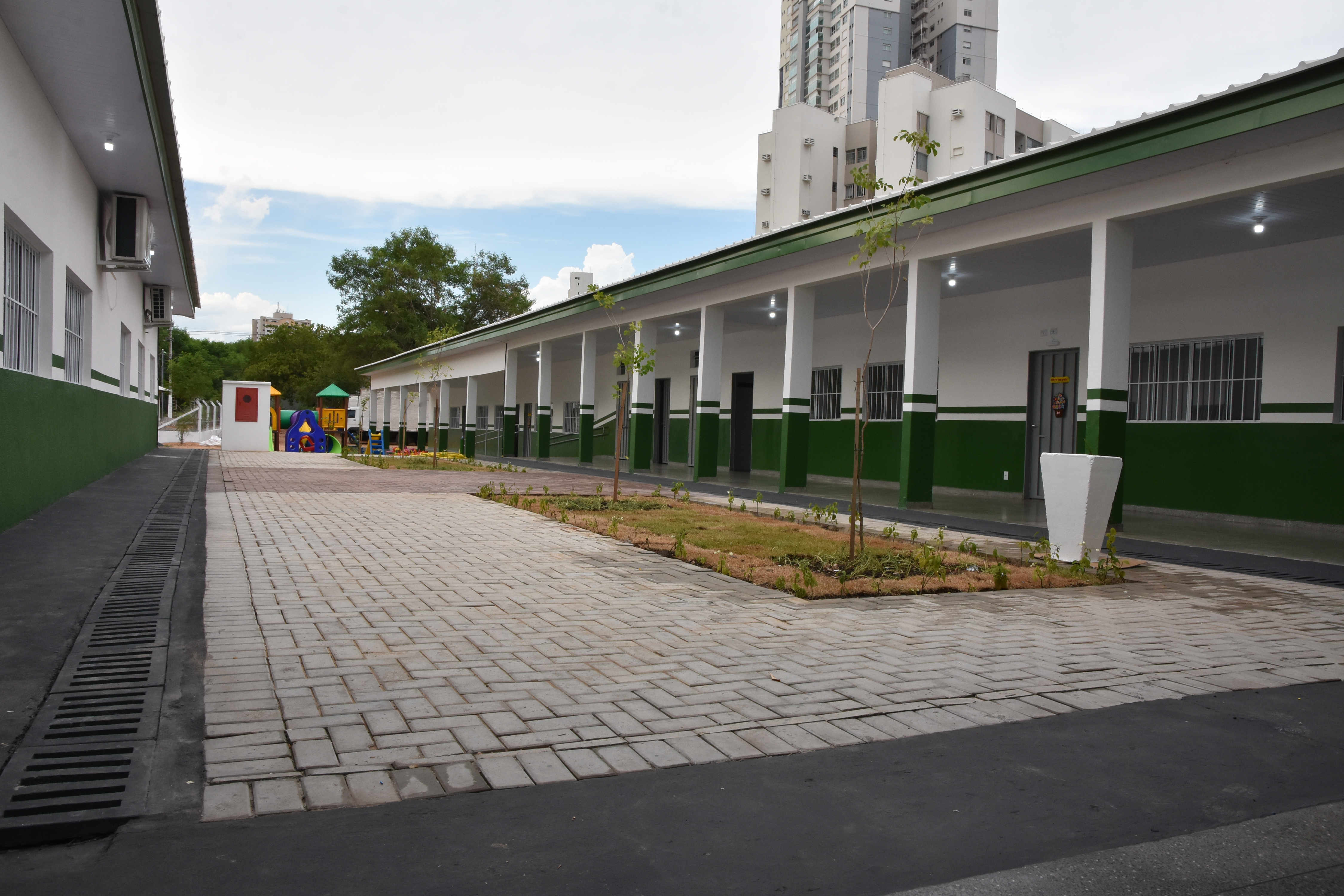 Além de telhas isotérmica, utilizadas em todas as reformas, a escola ganhou gradil metálico tipo nylofor em substituição parcial ao muro antigo e um pórtico desenvolvido exclusivamente para atender a acessibilidade da unidade.