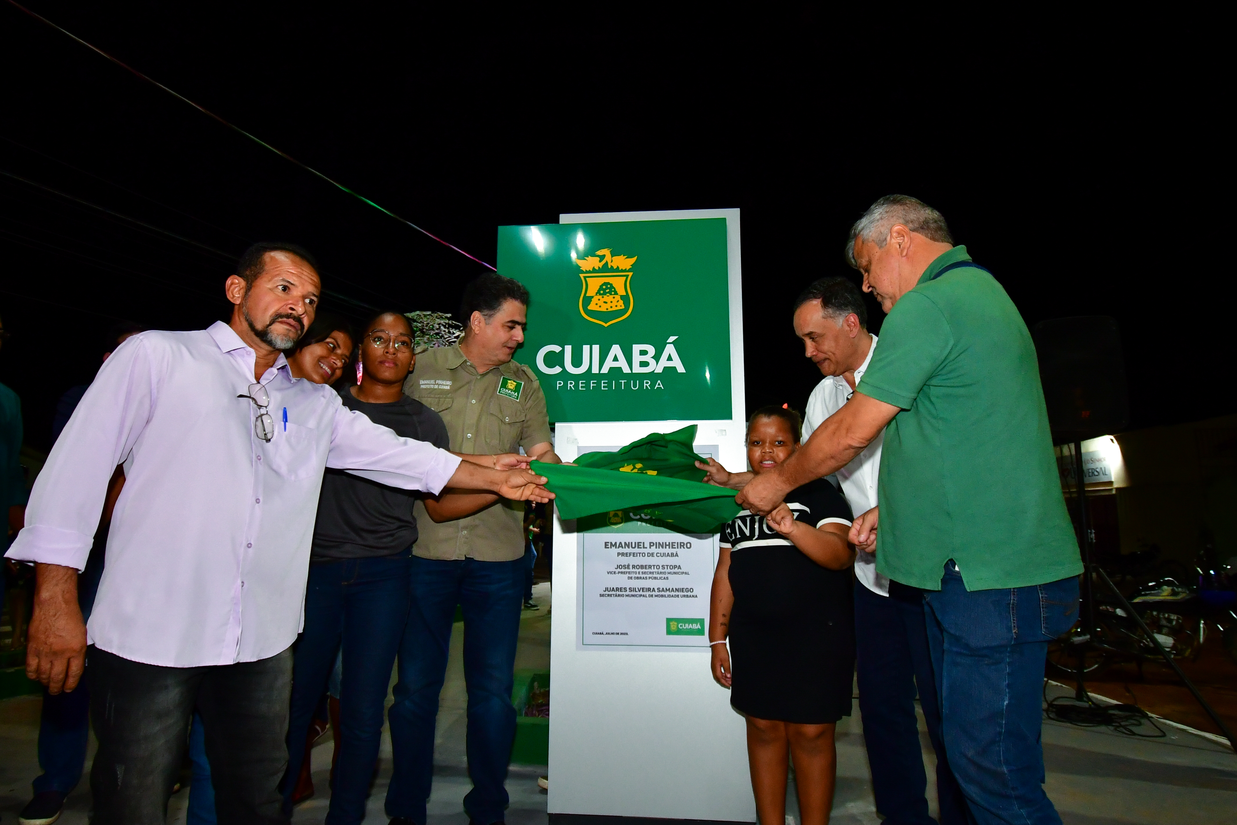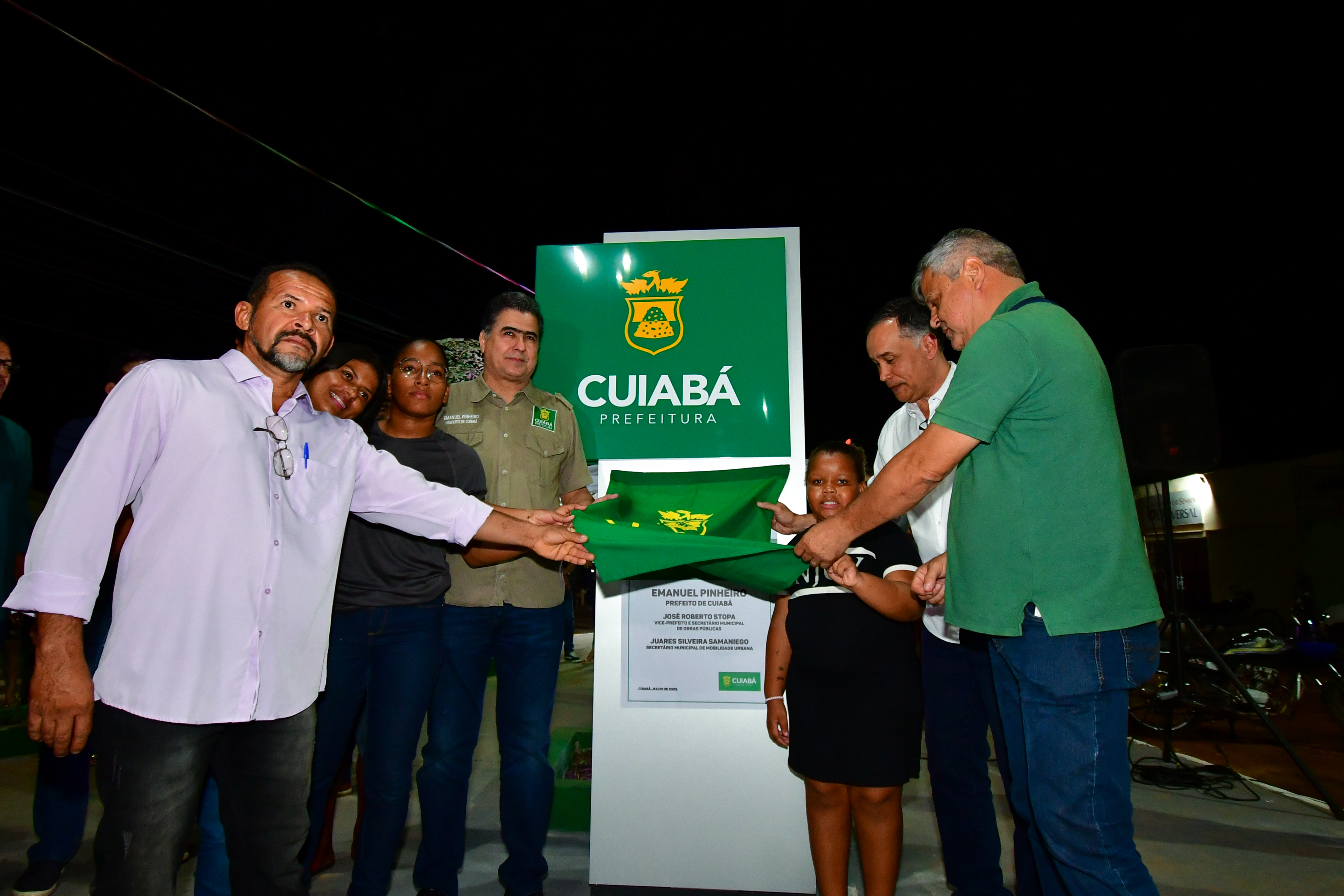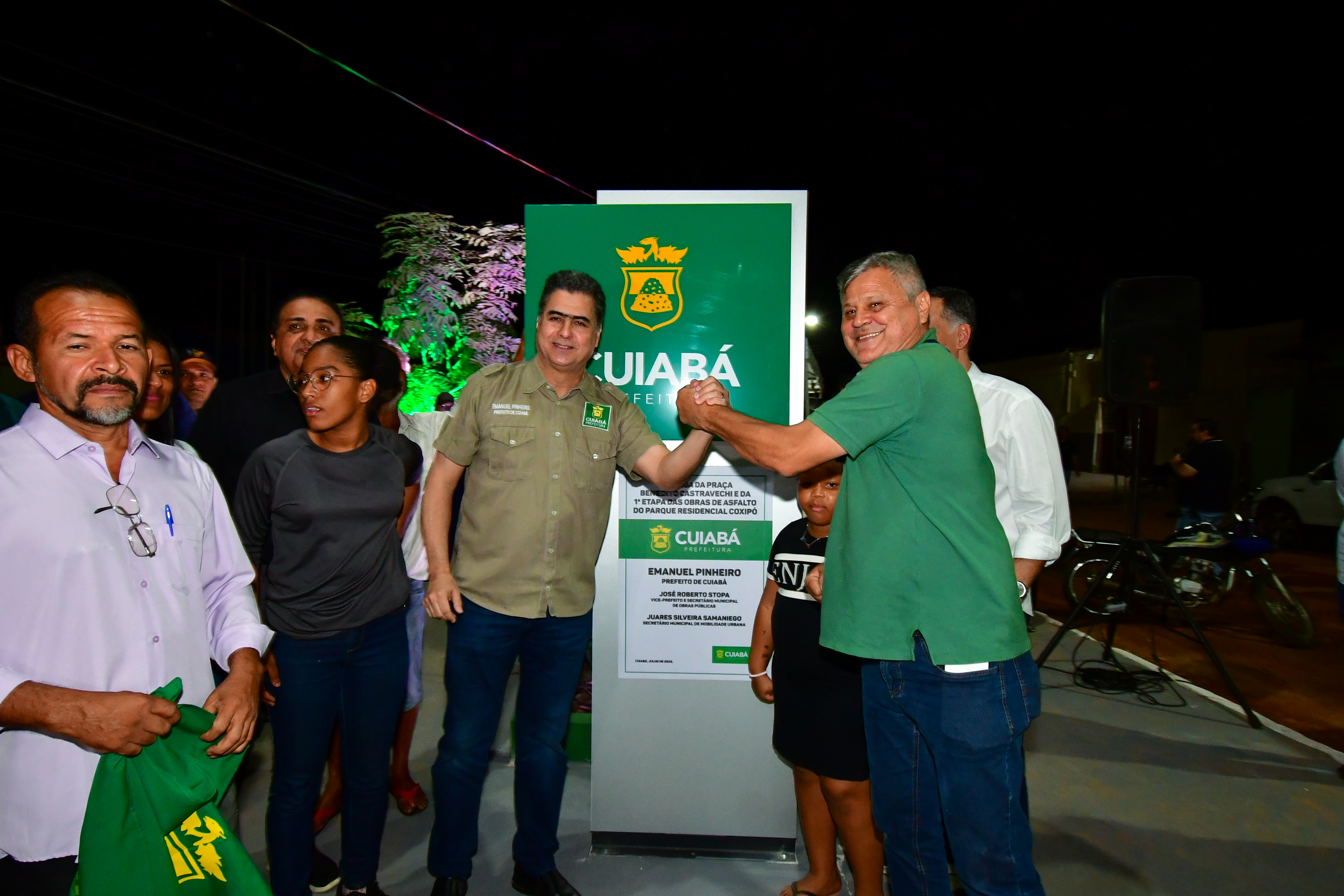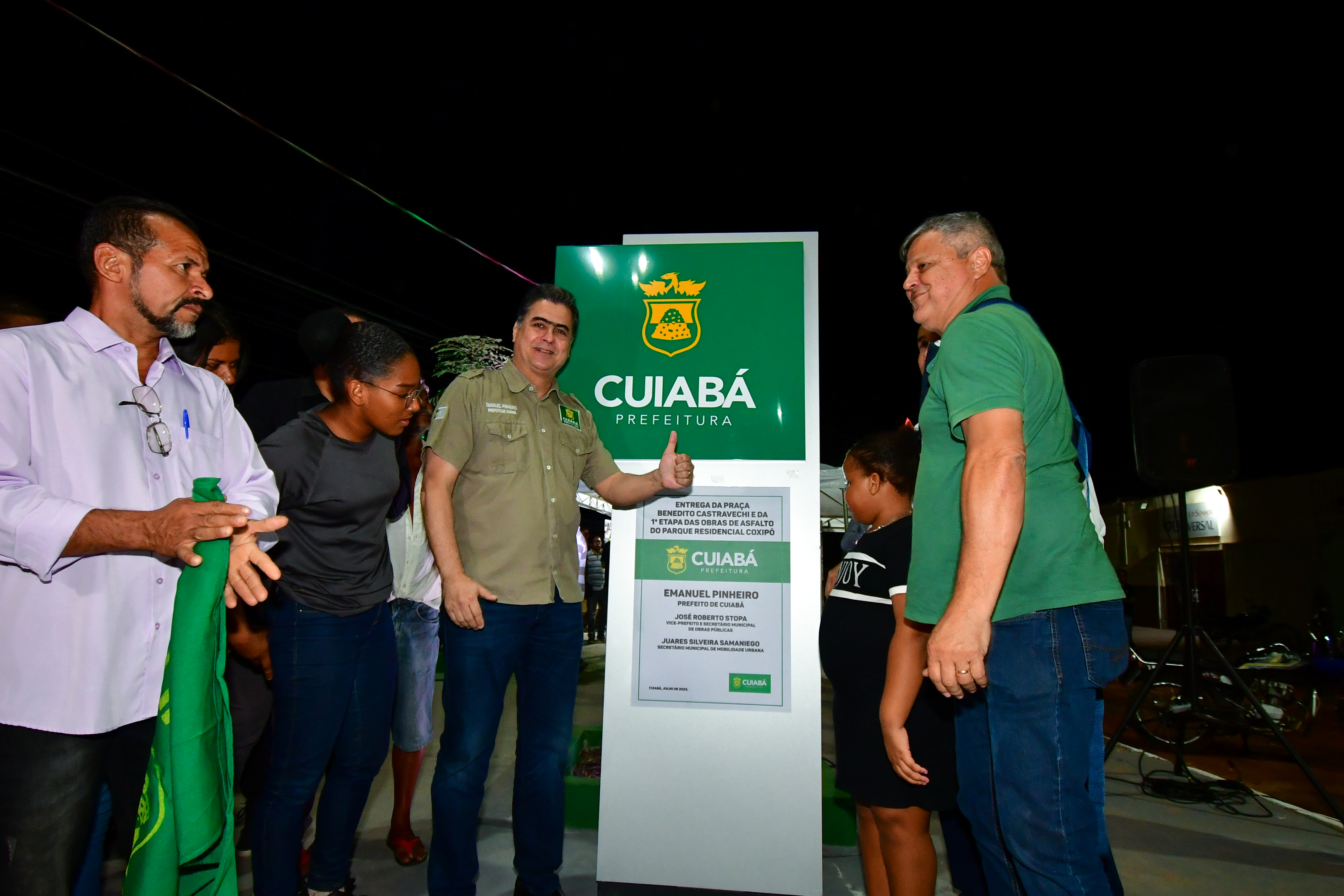 O prefeito Emanuel Pinheiro entregou, na noite desta sexta-feira (8), duas importantes obras para melhoria na qualidade de vida dos moradores do bairro Parque Residencial Coxipó, sendo elas: um quilômetro de rede de drenagem de águas pluviais e pavimentação, além da revitalização da Praça Benedito Castravechi. O gestor, acompanhado pelo vice-prefeito e secretário de Obras Públicas, José Roberto Stopa, vereadores Cezinha Nascimento, Kassio Coelho, Luís Cláudio, secretário de Governo Wilton Coelho, lideranças comunitárias e a população, aproveitaram a ocasião para homenagear o ex-líder comunitário, Justino Campos (in memoriam).