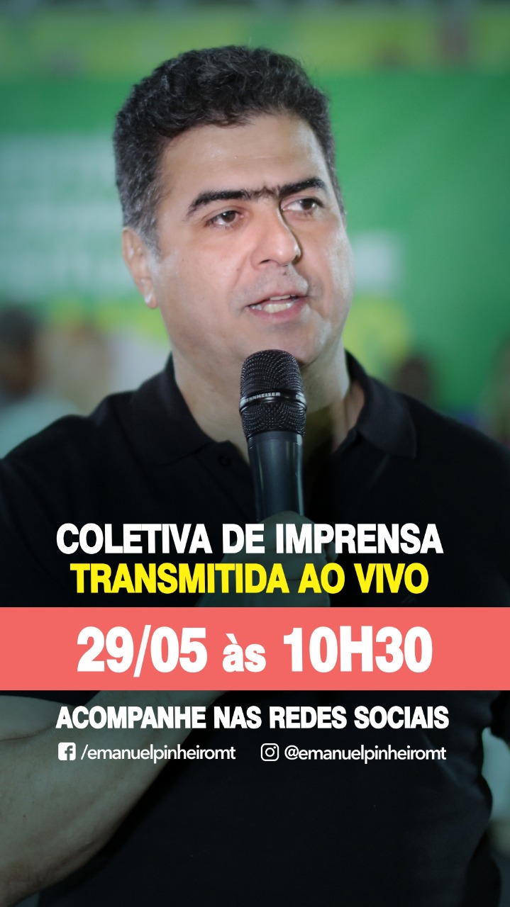 O prefeito Emanuel Pinheiro convida a imprensa para uma coletiva nesta sexta-feira (29), a partir das 10h30 para responder a perguntas pertinentes as Secretarias Municipais e as ações de combate ao novo Coronavírus em Cuiabá. O convite se estende a toda população. O evento será transmitido online nas redes sociais do gestor.