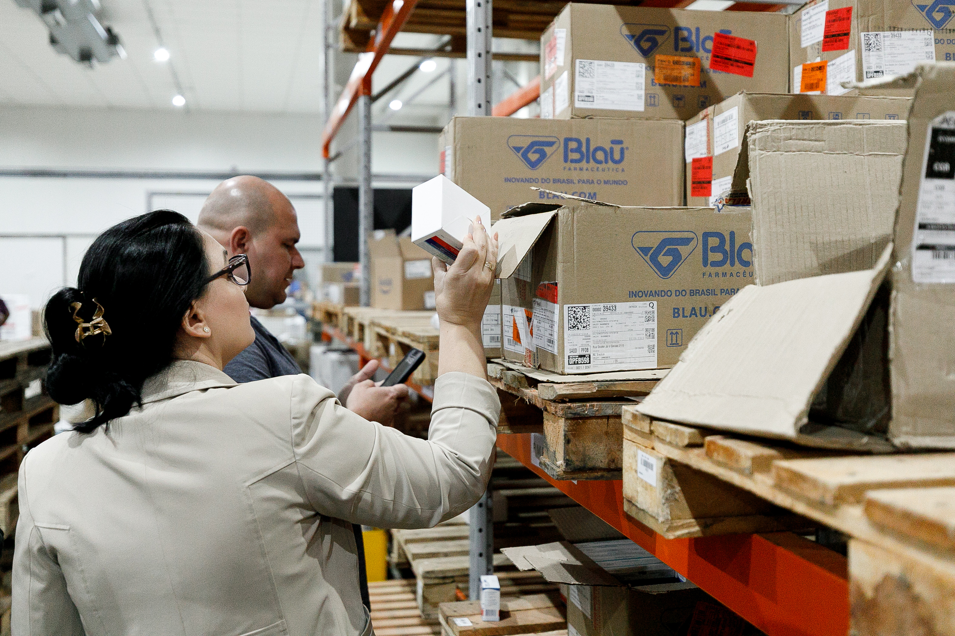 A imagem mostra o prefeito Abilio Brunini olhando uma caixa de medicamento, apontando informações da embalagem para a primeira-dama e vereadora Samantha Iris. Eles estão em um galpão de estoque.