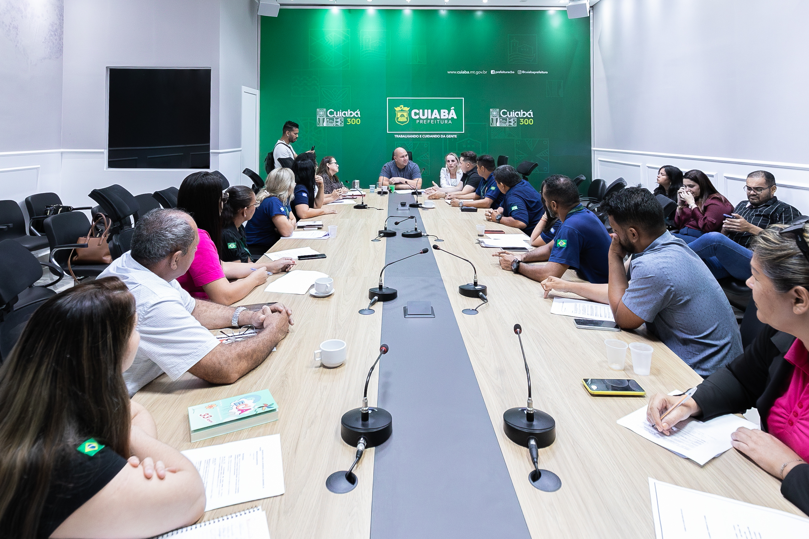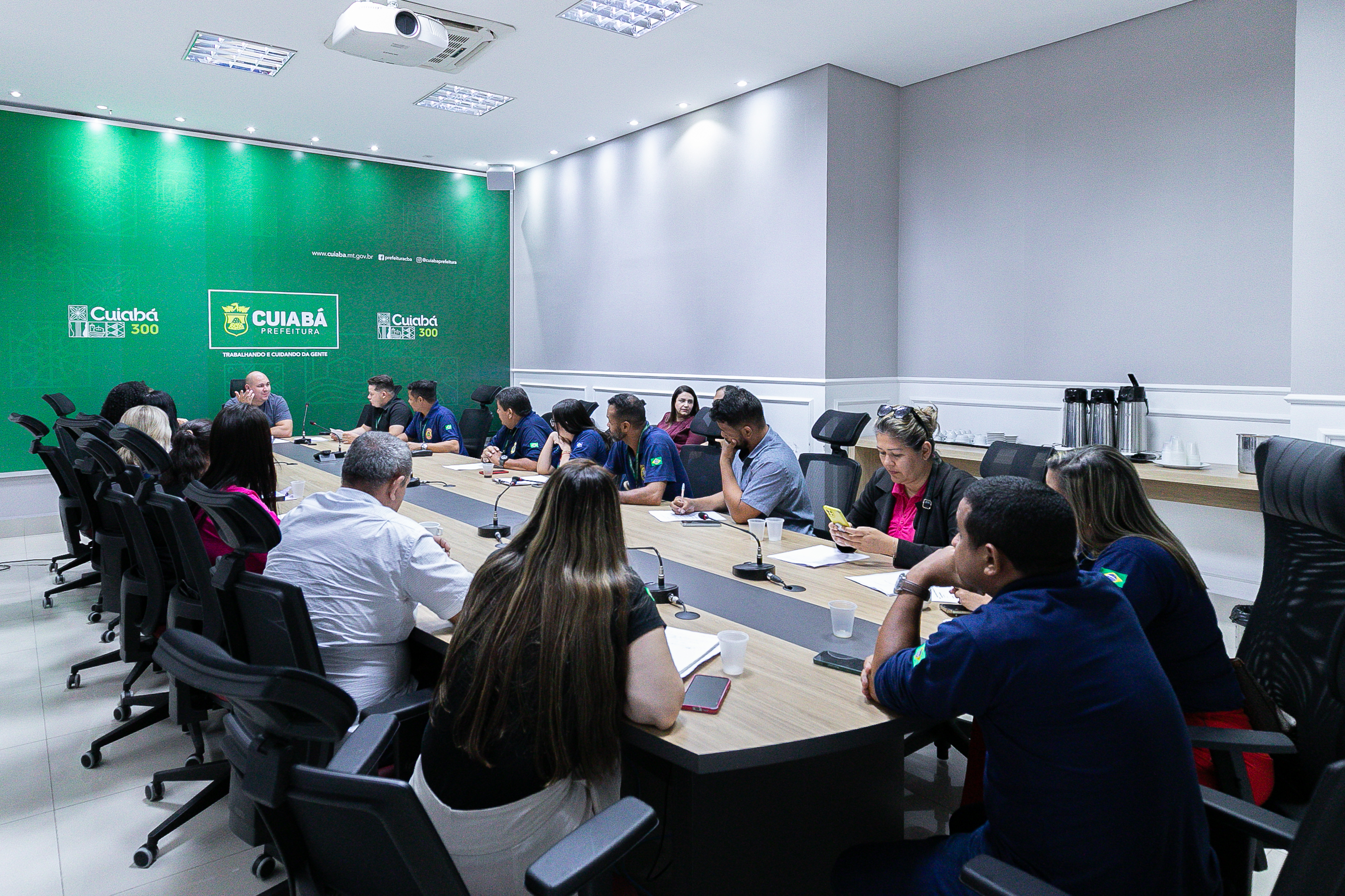 A imagem mostra o prefeito Abilio Brunini em reunião com conselheiros tutelares da capital. Ele se encontra sentado, usando camiseta cinza, olhando um documento entregue pela categoria. Ao redor da mesa também se encontram os conselheiros tutelares, que estão sentados articulando com o prefeito.