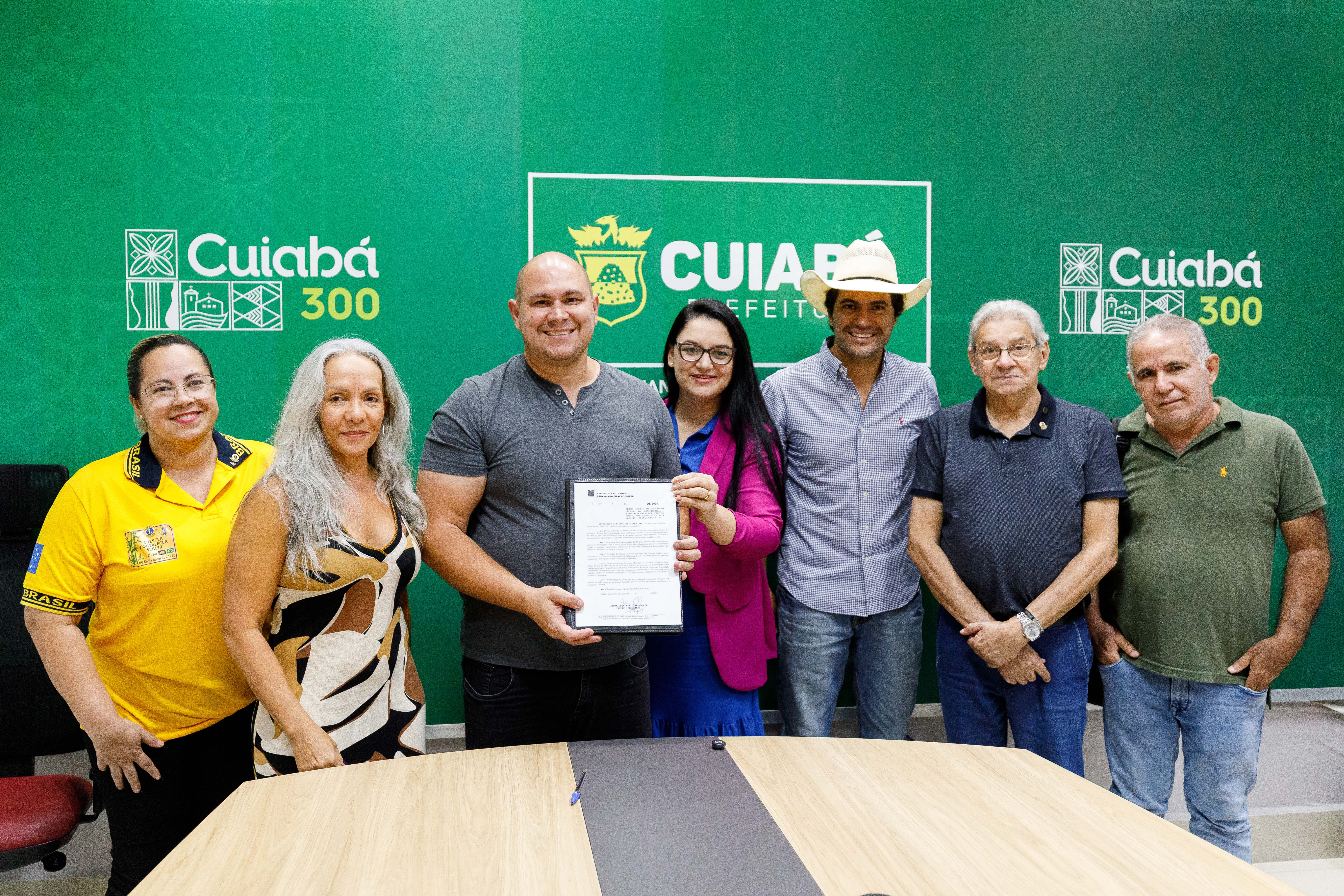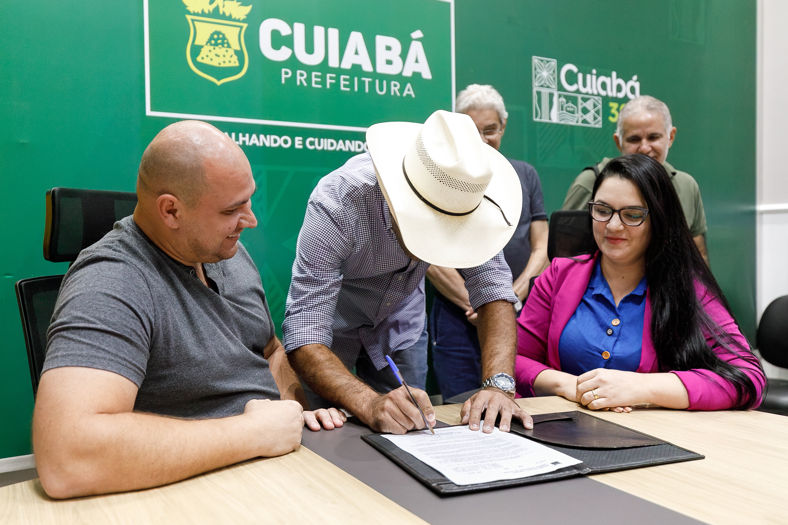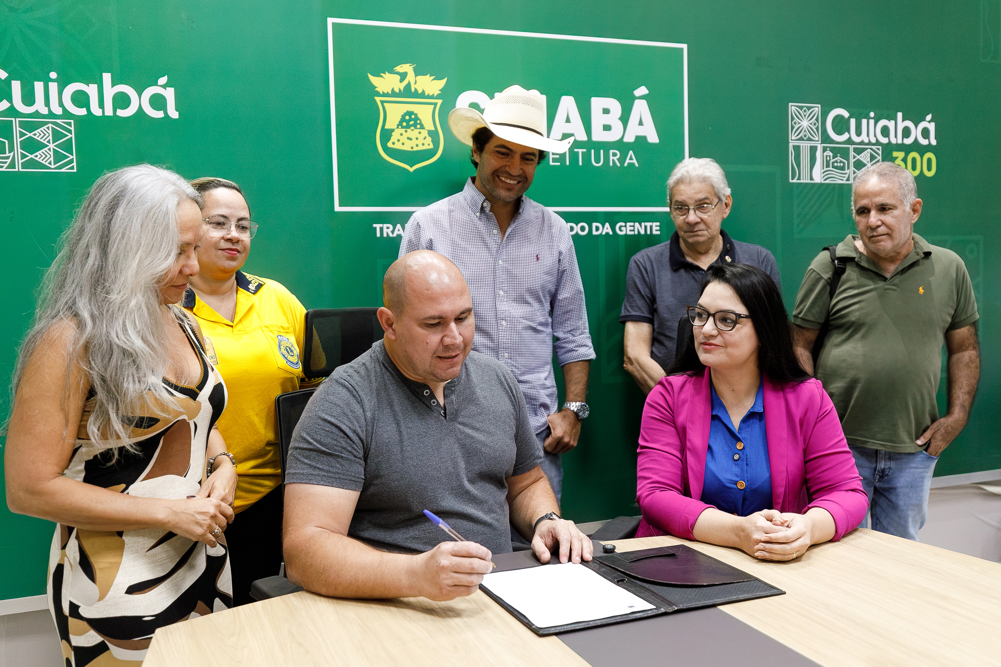 A imagem mostra o prefeito Abilio Brunini, de camisa cinza, ao lado da vereadora Samantha Iris de blazer rosa. Ele assina e sanciona a lei em uma mesa de reunião no Salão Nobre da Prefeitura de Cuiabá.