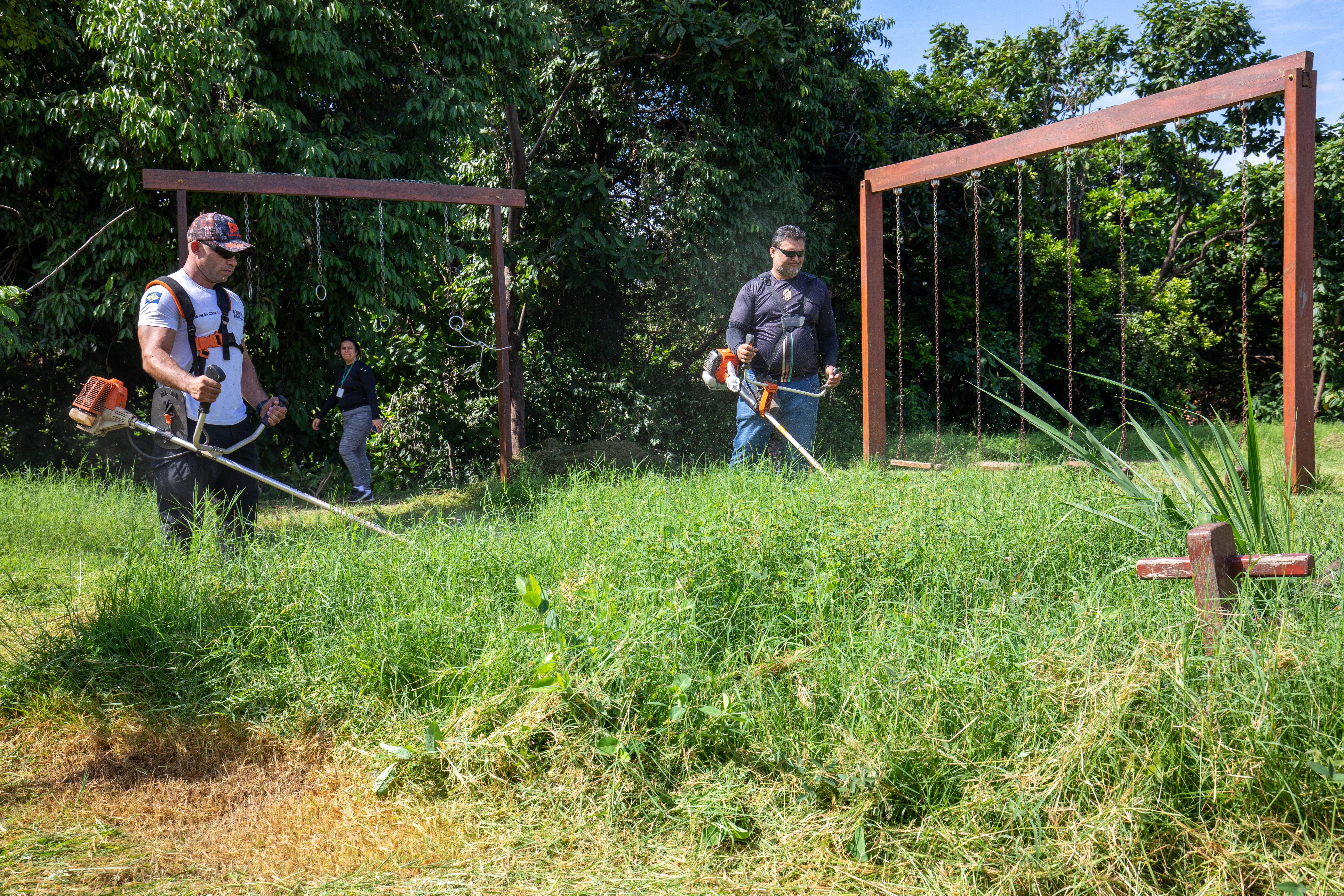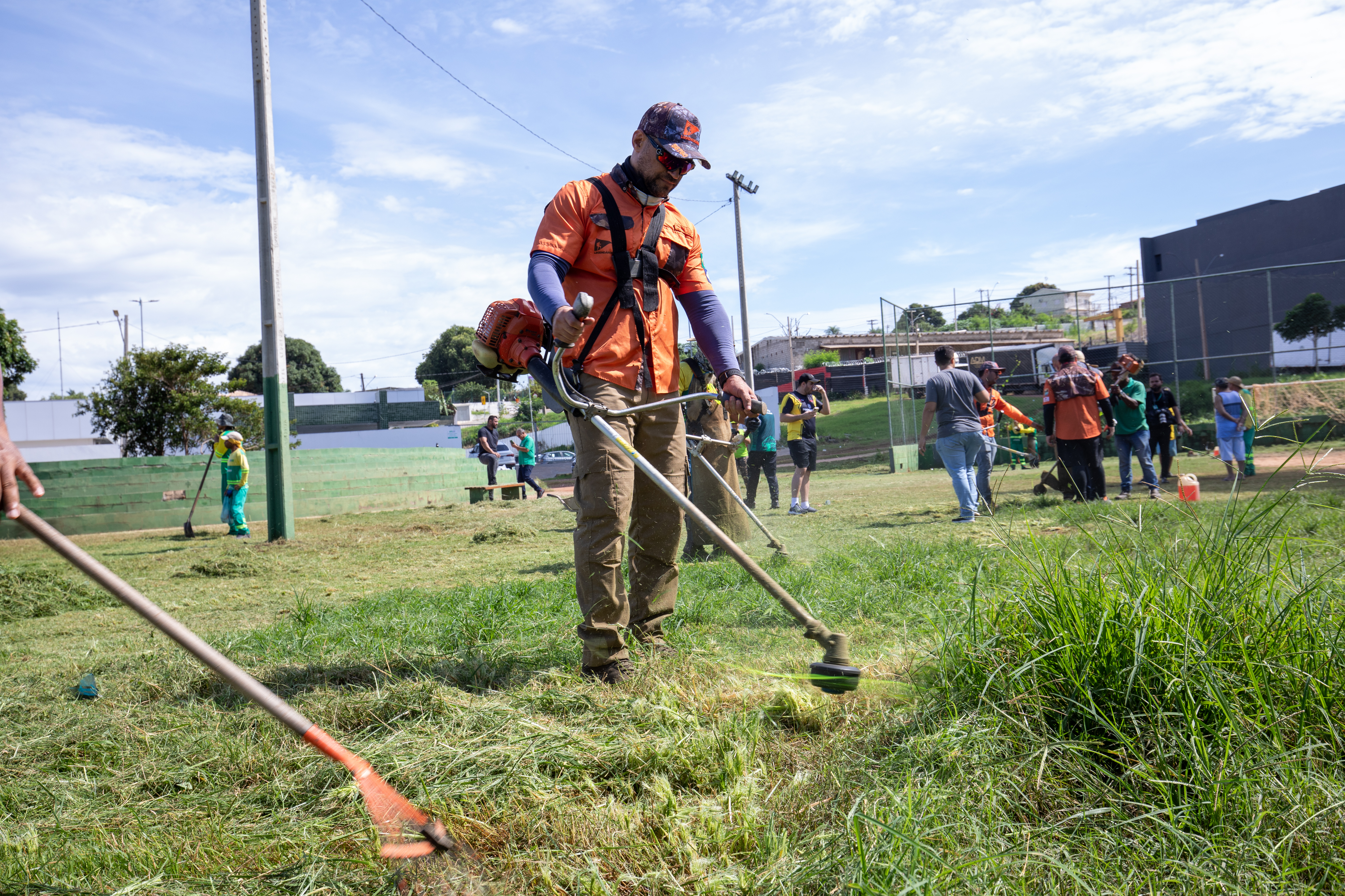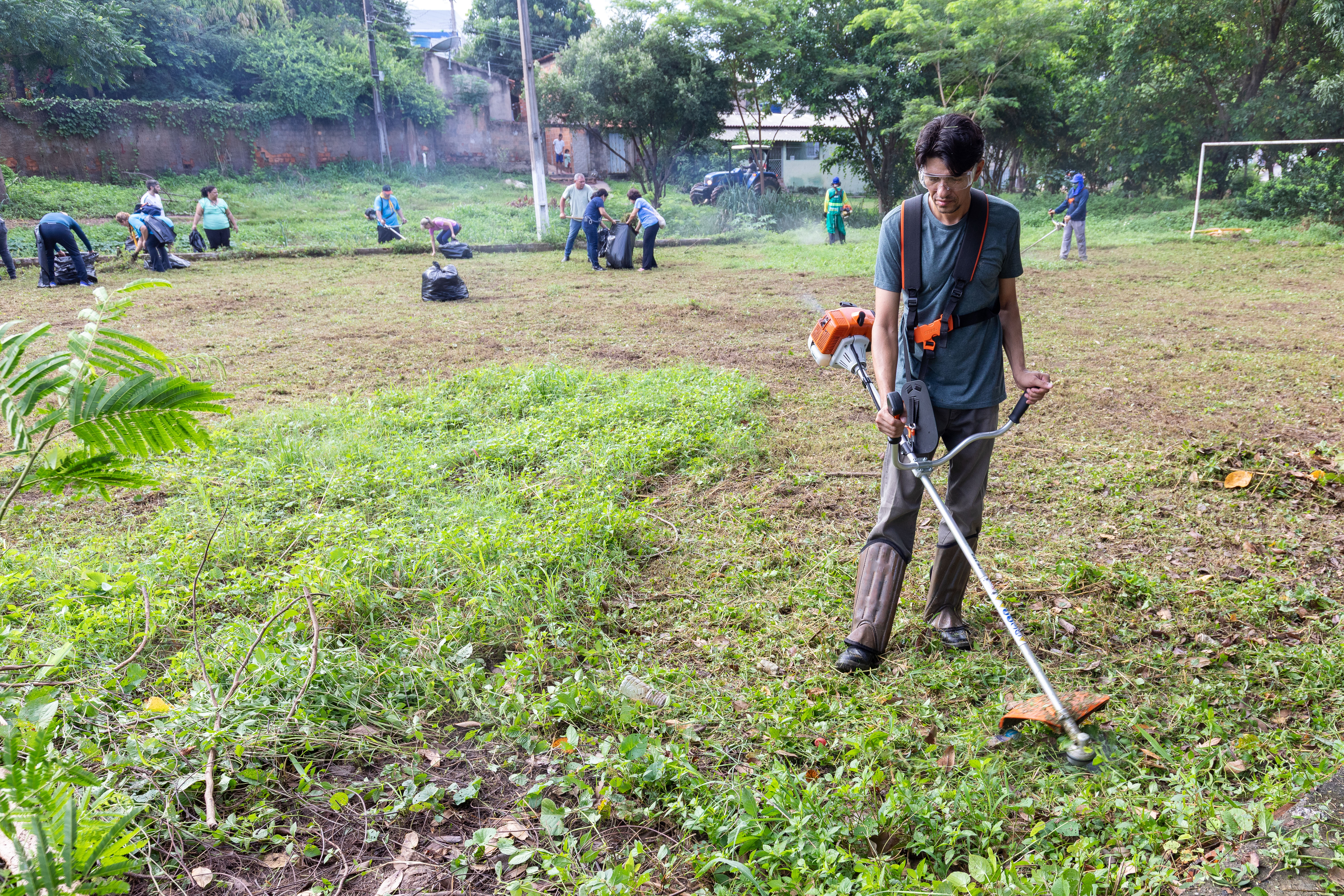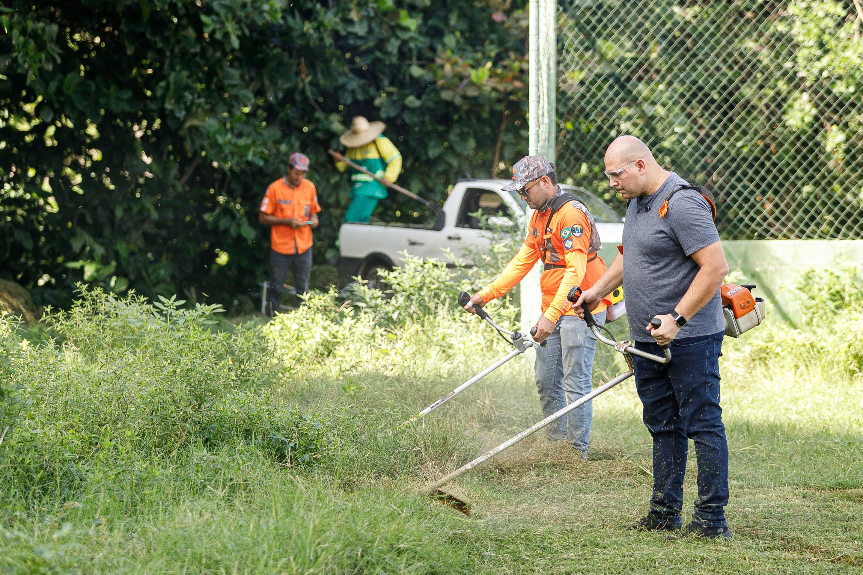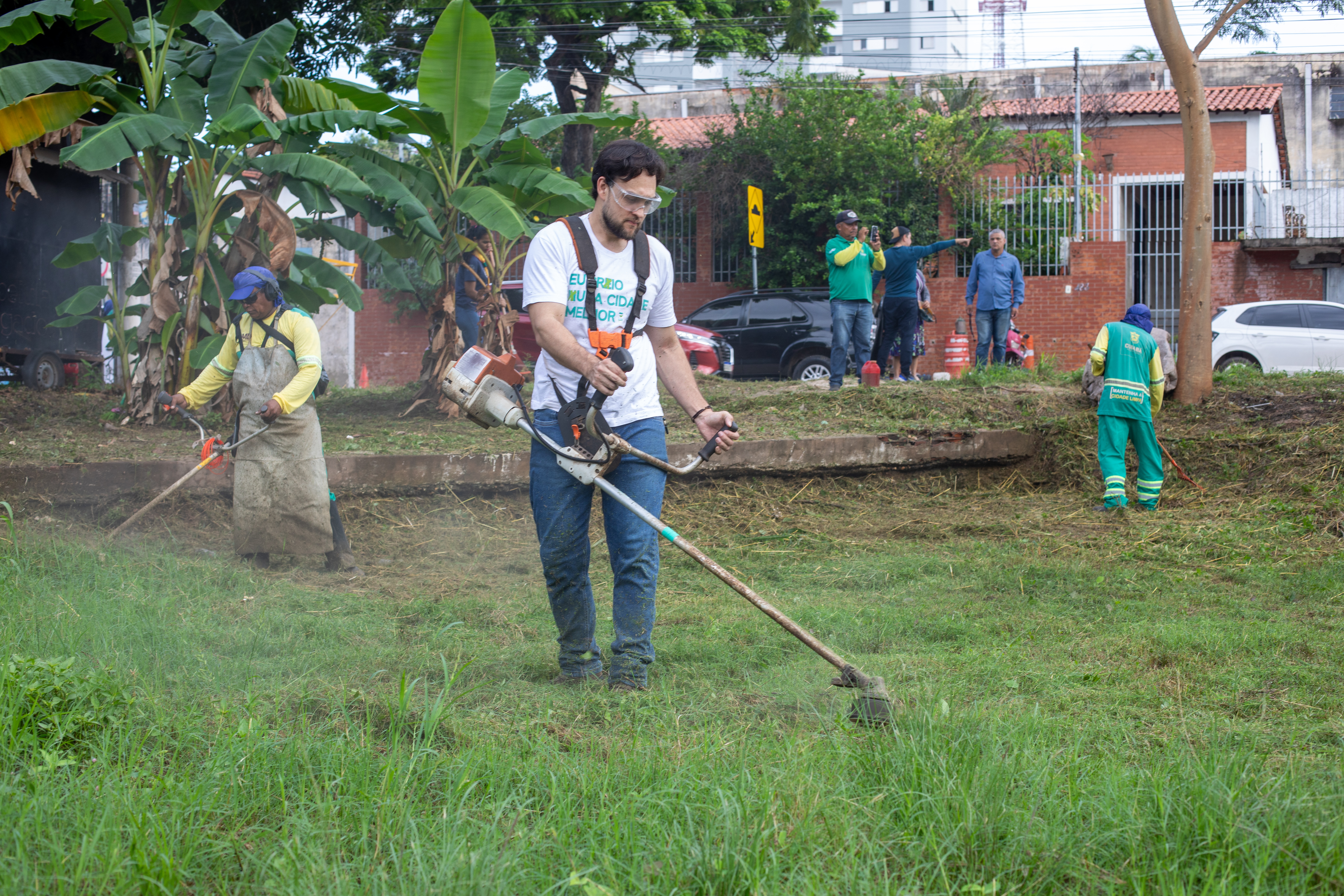 Na imagem principal, Abilio está com uma roçadeira ao lado de outros servidores e voluntários promovendo a limpeza do mato nas praças da Capital. Nas imagens da galeria, várias fotos ilustrando ao mutirão de limpeza com secretários de gestão, a primeira-dama Samantha Iris entre outros fazendo serviços de jardinagem.