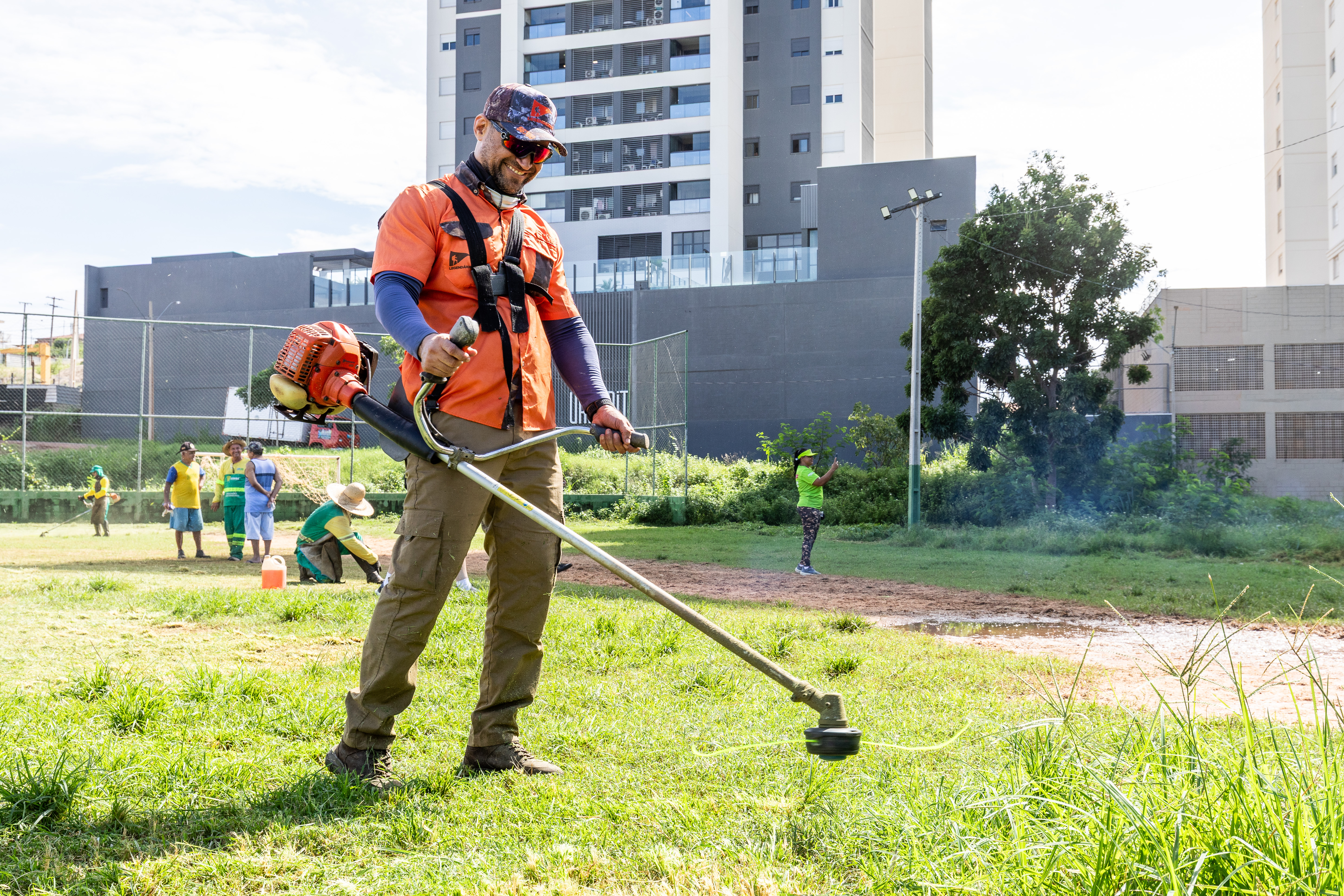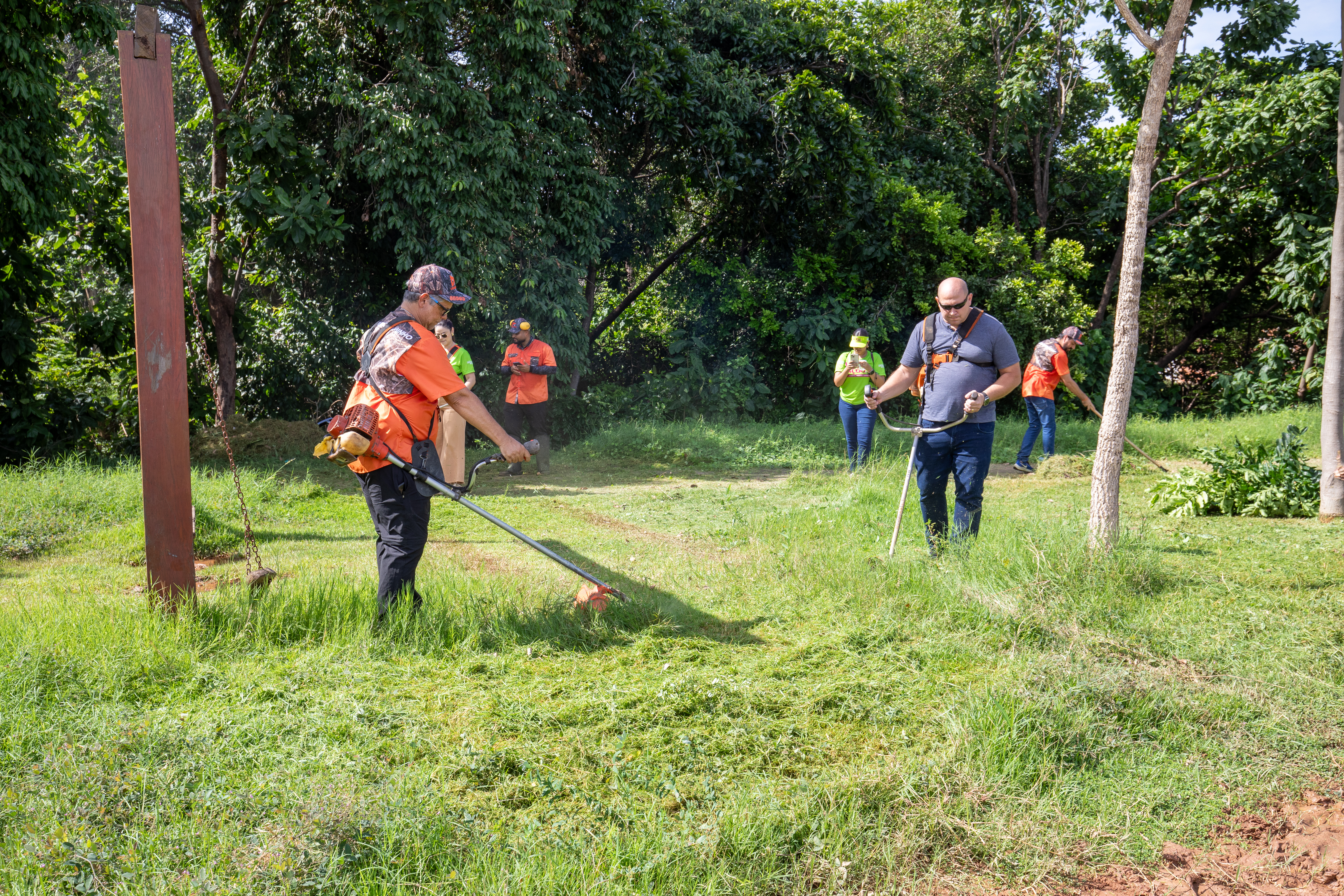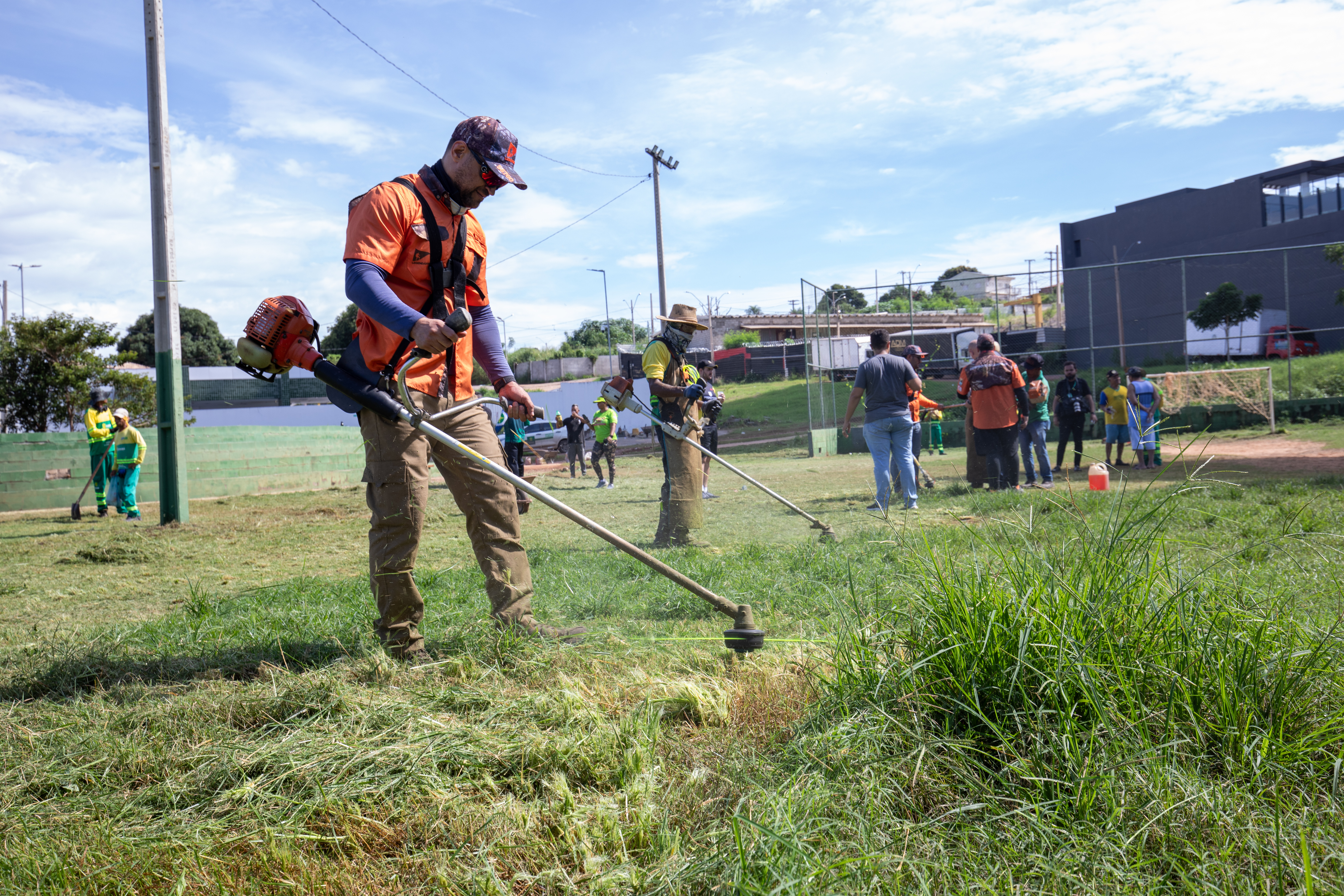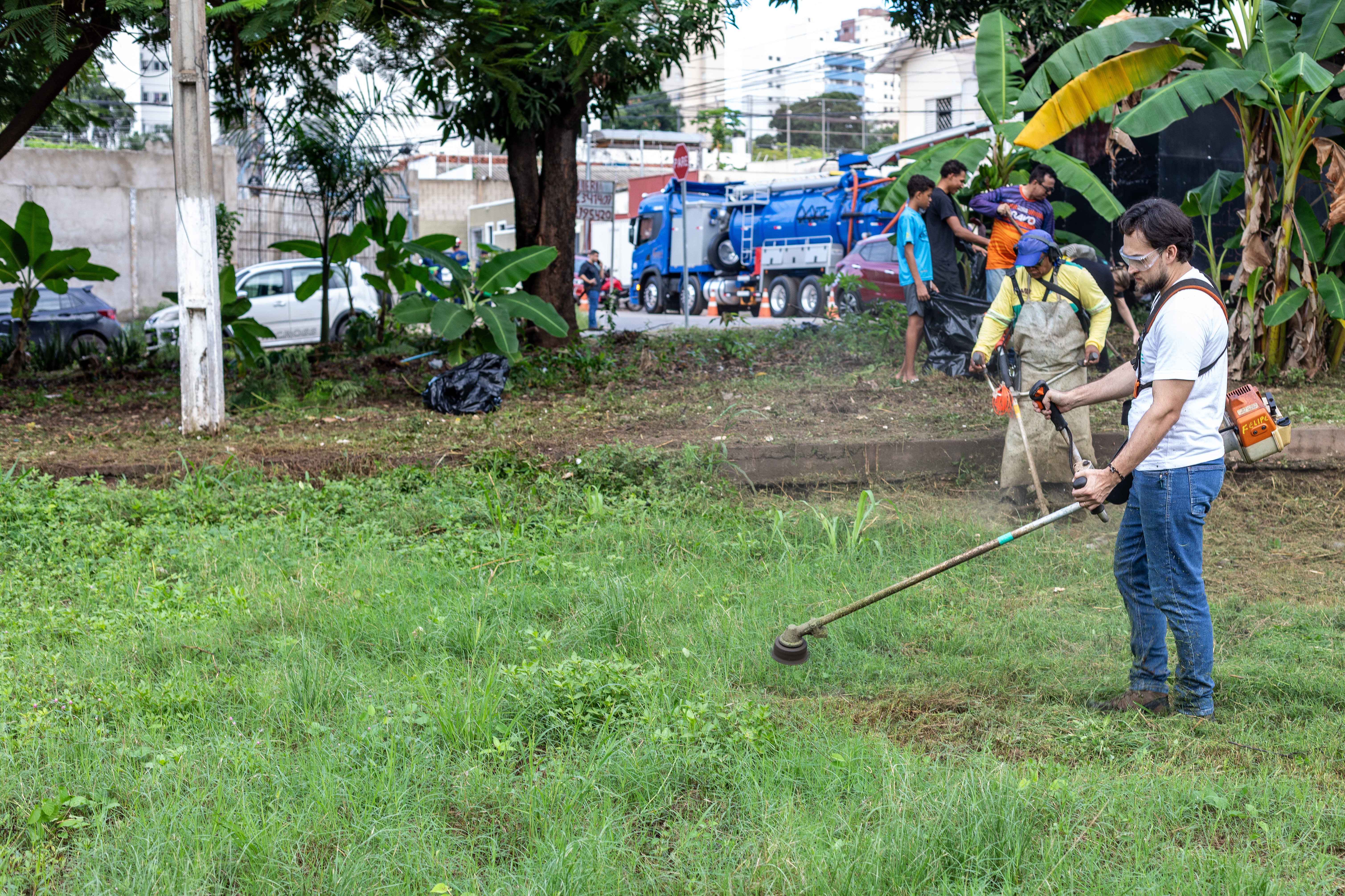 Na imagem principal, Abilio está com uma roçadeira ao lado de outros servidores e voluntários promovendo a limpeza do mato nas praças da Capital. Nas imagens da galeria, várias fotos ilustrando ao mutirão de limpeza com secretários de gestão, a primeira-dama Samantha Iris entre outros fazendo serviços de jardinagem.