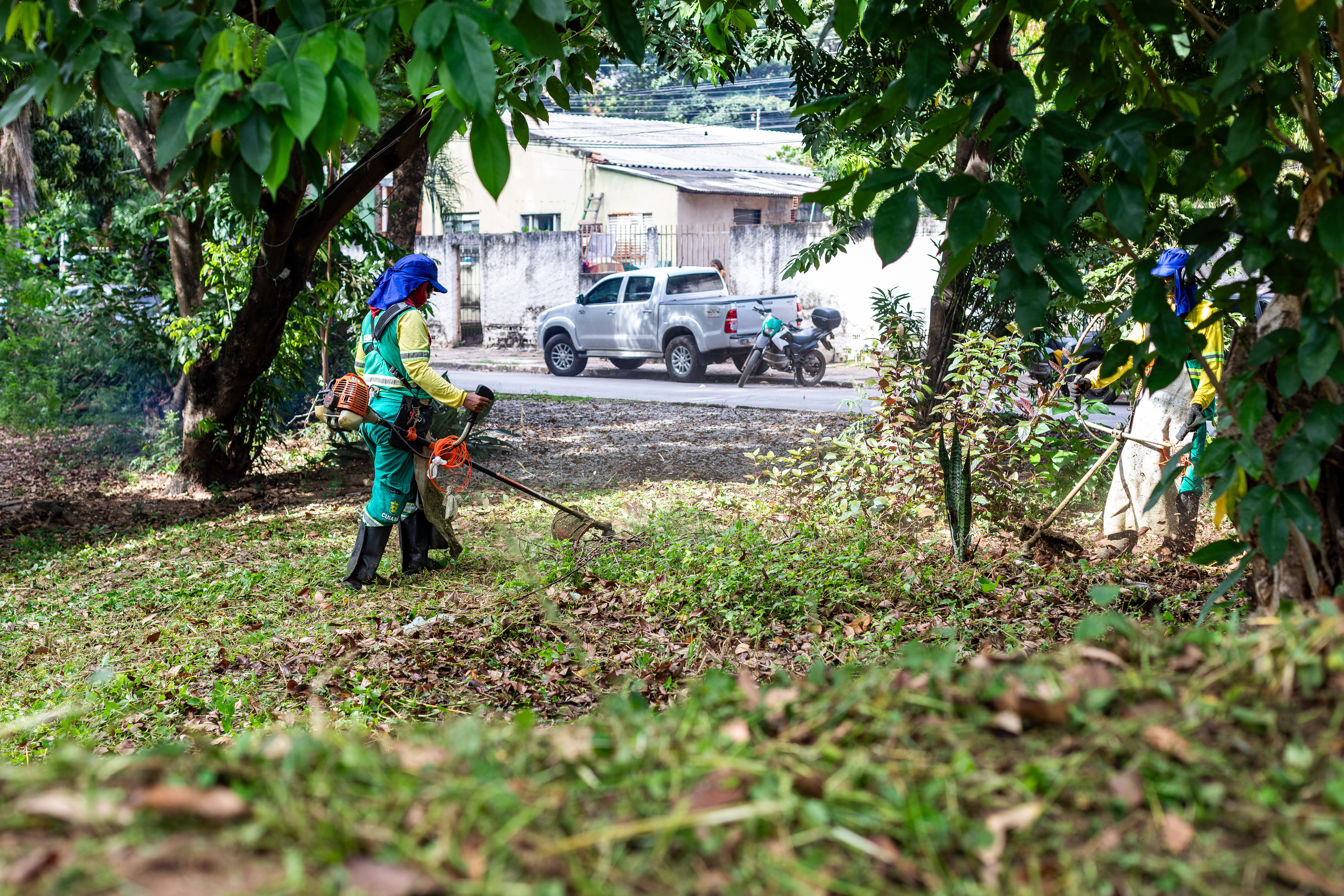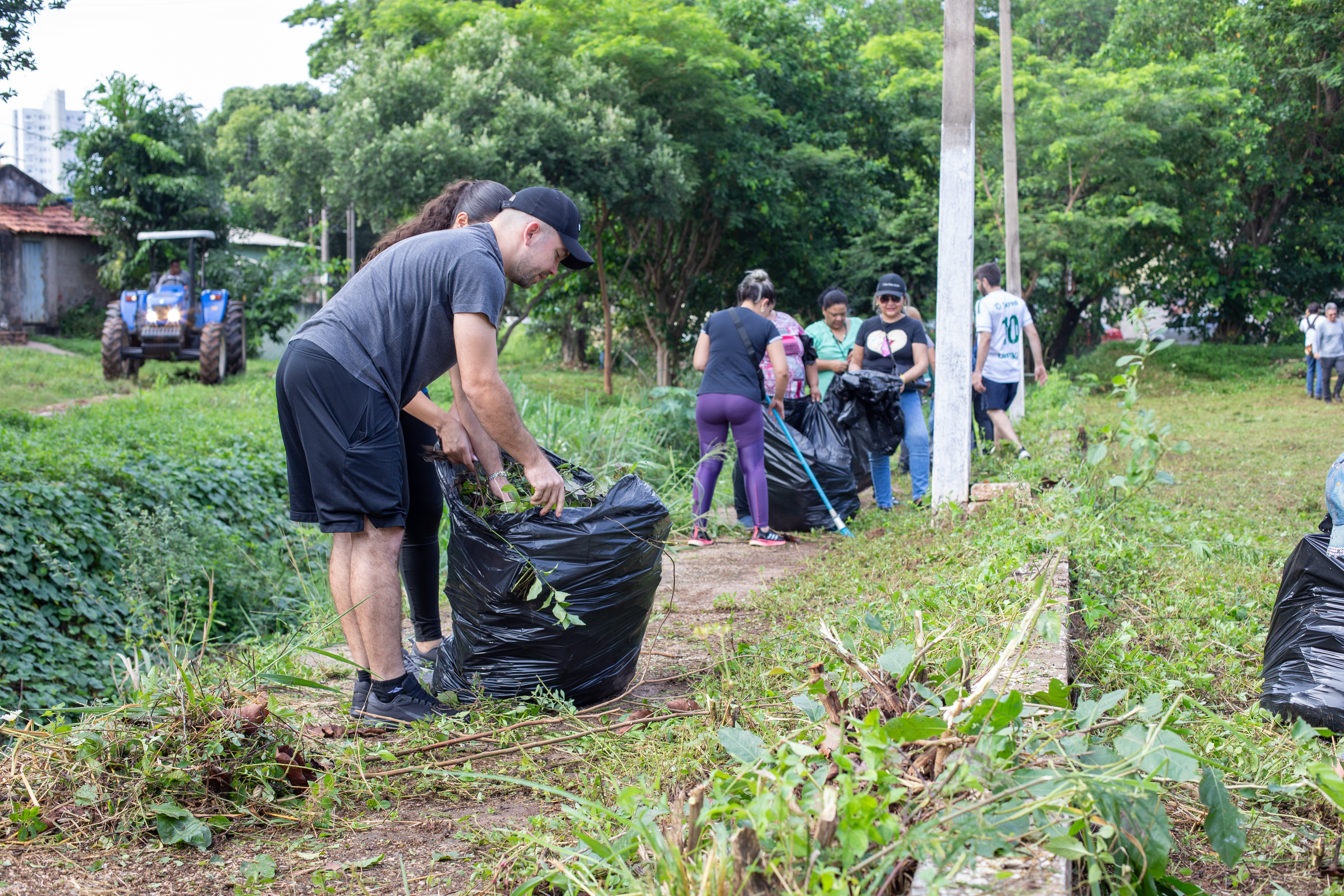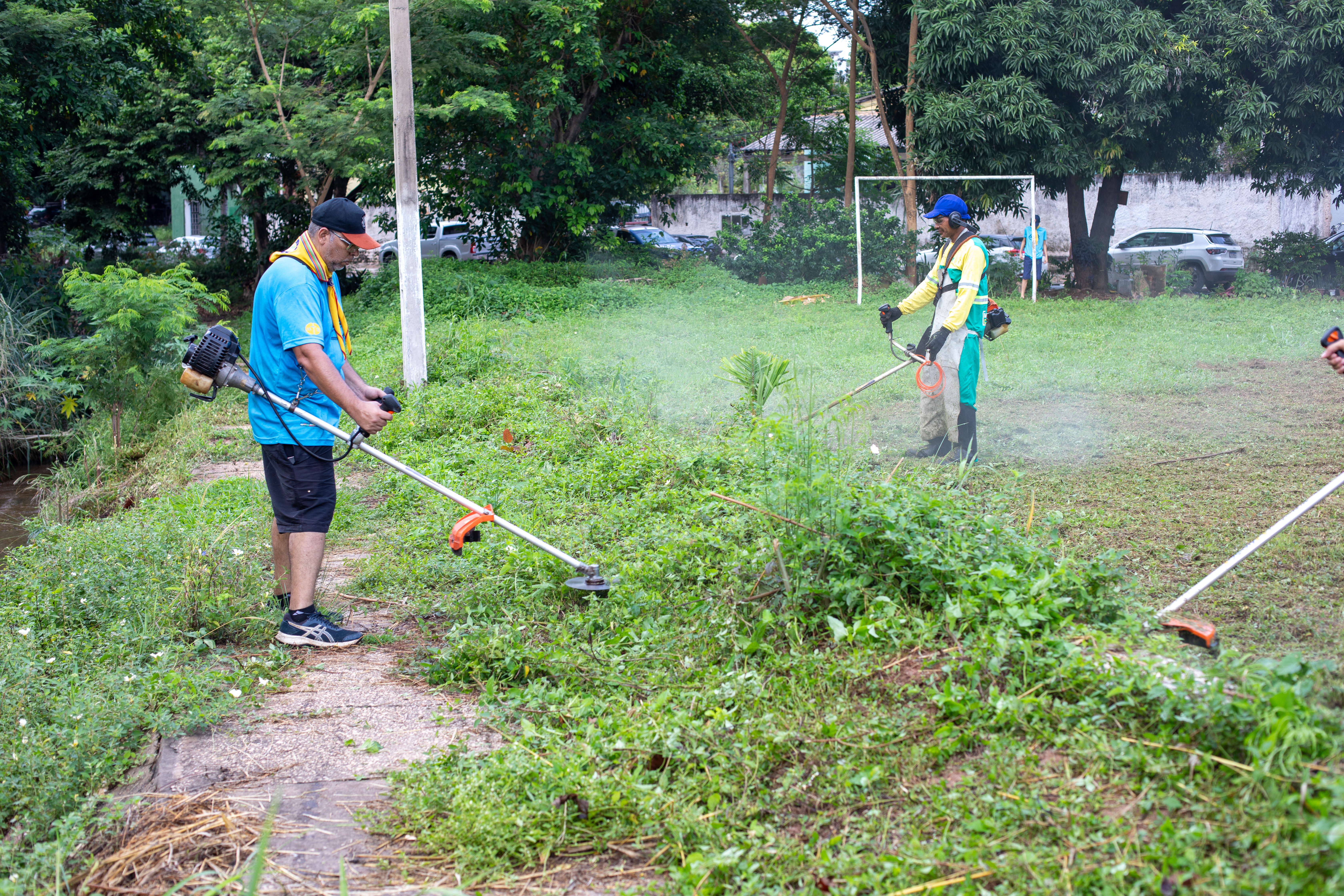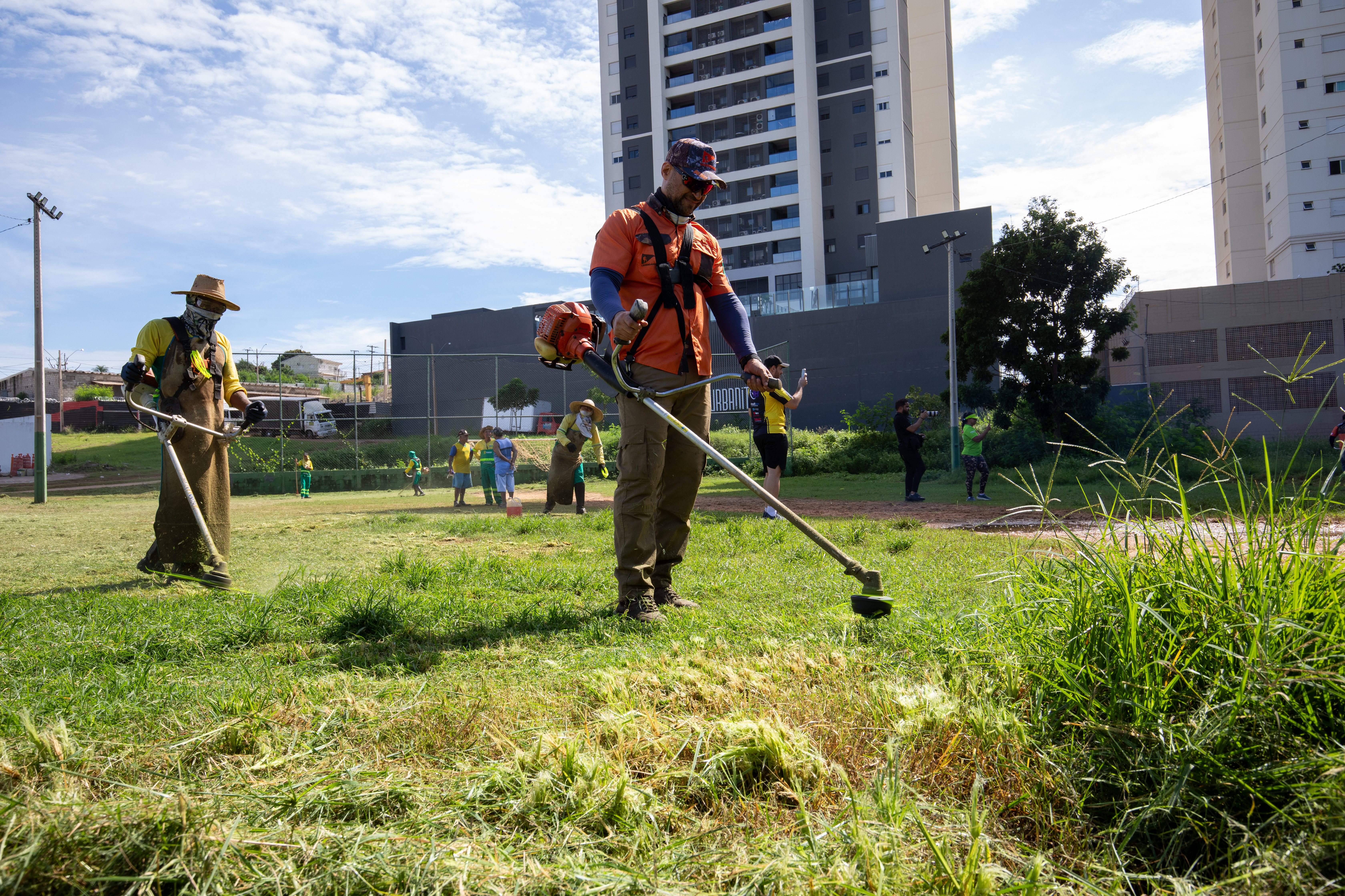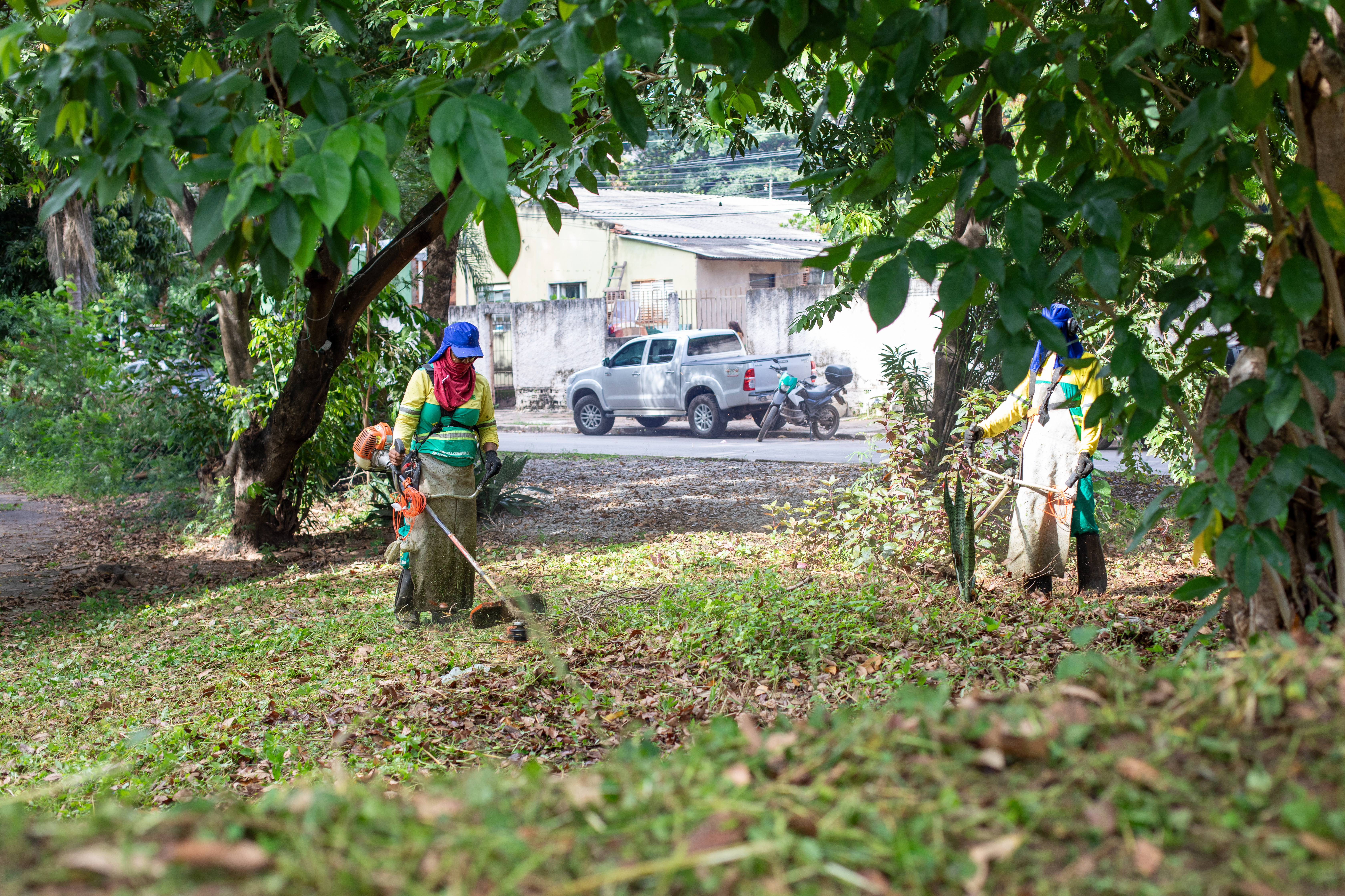 Na imagem principal, Abilio está com uma roçadeira ao lado de outros servidores e voluntários promovendo a limpeza do mato nas praças da Capital. Nas imagens da galeria, várias fotos ilustrando ao mutirão de limpeza com secretários de gestão, a primeira-dama Samantha Iris entre outros fazendo serviços de jardinagem.