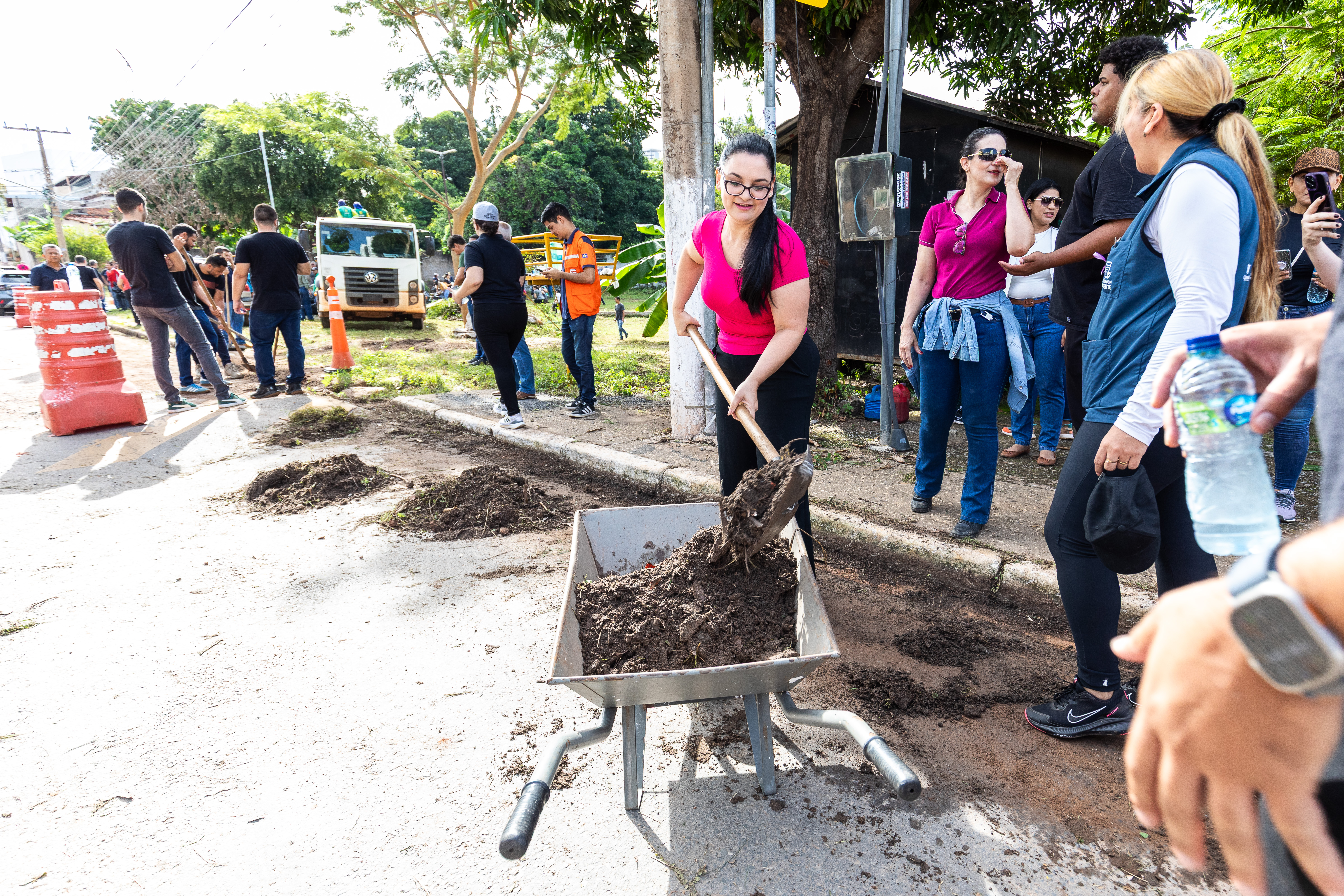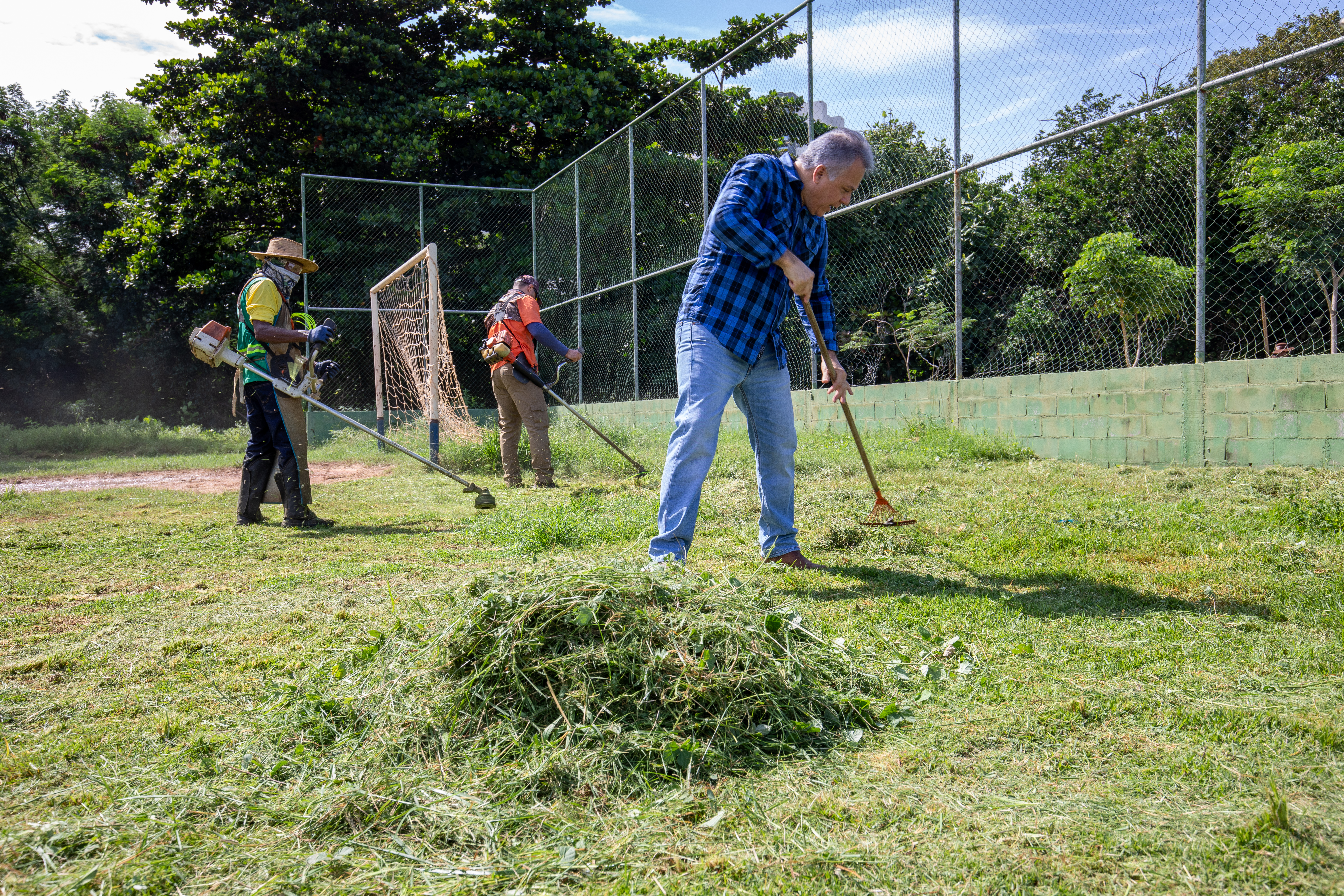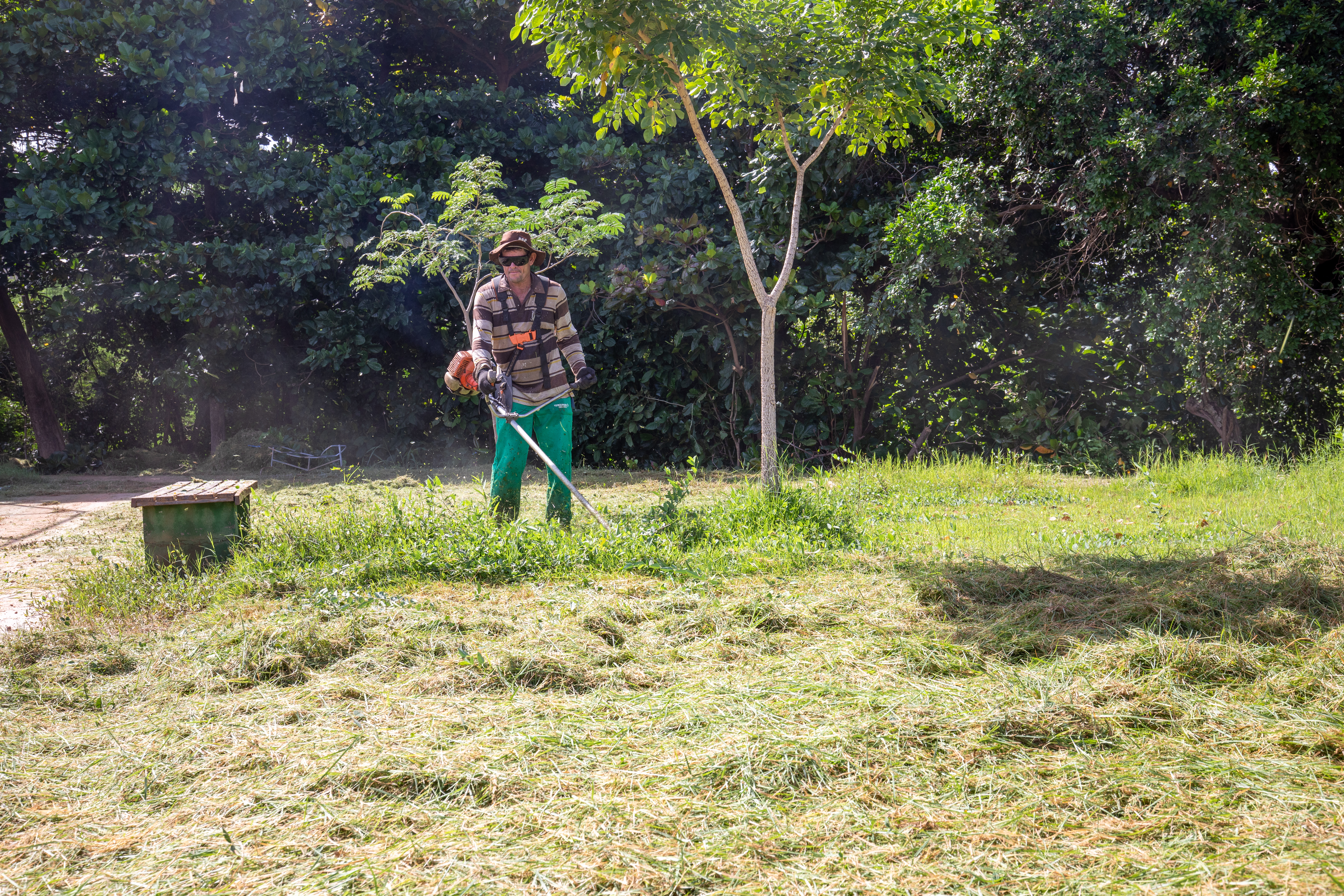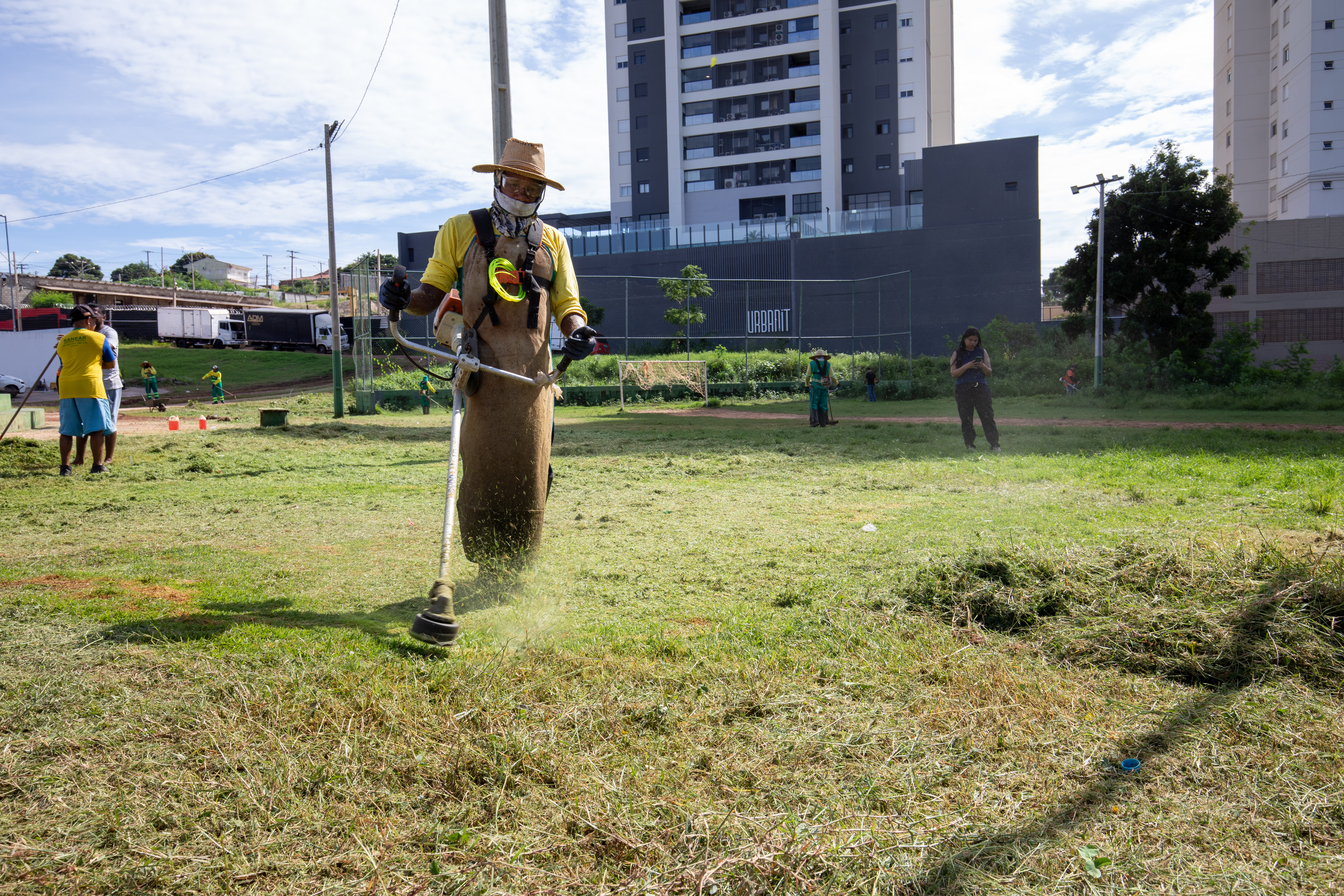 Na imagem principal, Abilio está com uma roçadeira ao lado de outros servidores e voluntários promovendo a limpeza do mato nas praças da Capital. Nas imagens da galeria, várias fotos ilustrando ao mutirão de limpeza com secretários de gestão, a primeira-dama Samantha Iris entre outros fazendo serviços de jardinagem.