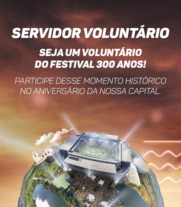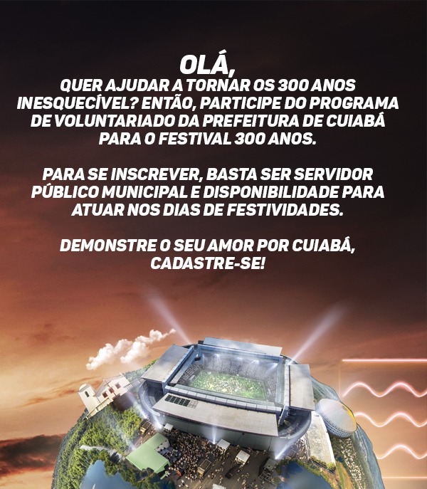 A Prefeitura de Cuiabá está selecionando servidores públicos para serem voluntários na realização do Festival 300 anos, que acontece nos dias 06, 07 e 08 de abril, na Arena Pantanal, com diversas atrações nacionais, regionais e a entrada totalmente gratuíta.