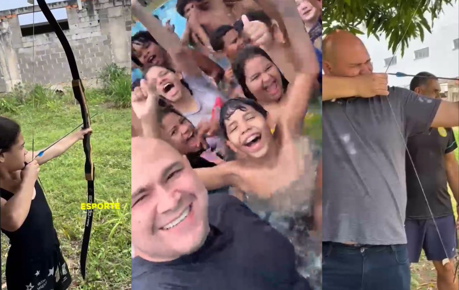 A foto mostra imagens do prefeito Abilio Brunini na piscina da Escola Municipal Maria Dimpina Lobo Duarte com estudantes do local e praticando arco e flecha.