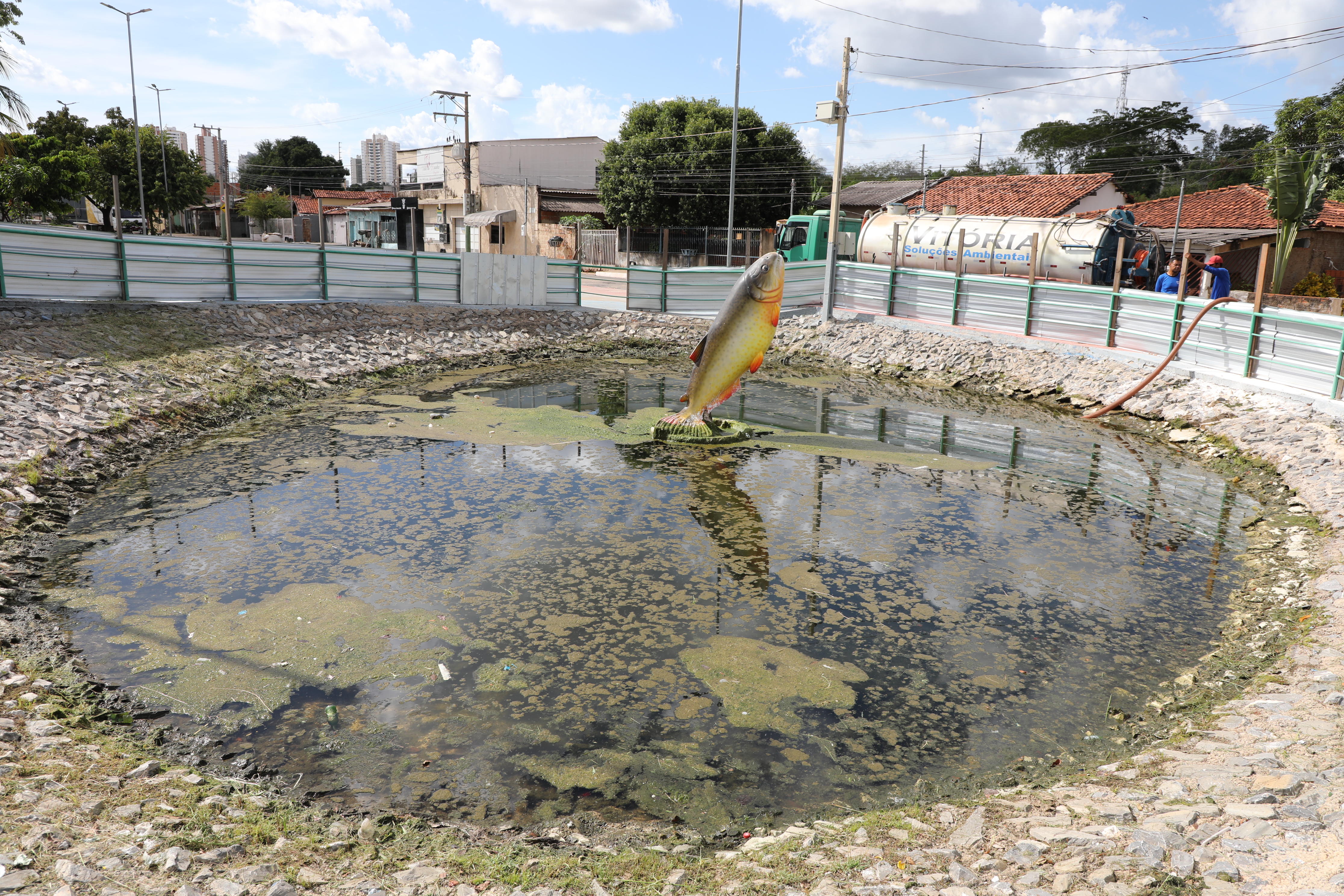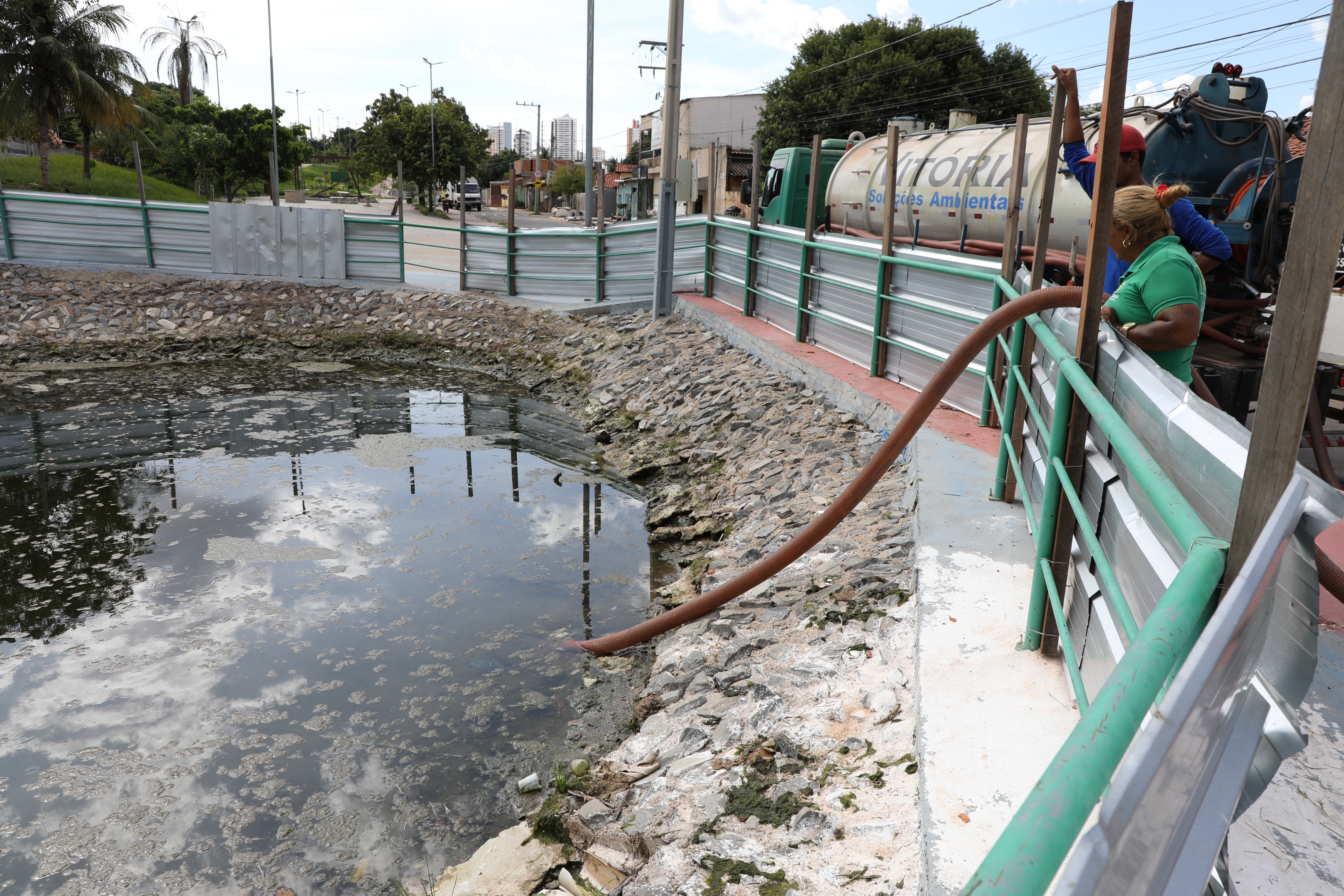 Os serviços estão sendo executados em três etapas. Na primeira fase, as equipes atuam na desobstrução e limpeza do lago artificial, realizando a drenagem total da água e aplicando tratamento com cloro ativo para controle de odores, prevenção do crescimento de fungos e lodo, remoção de impurezas e combate ao desenvolvimento de bactérias nas tubulações.