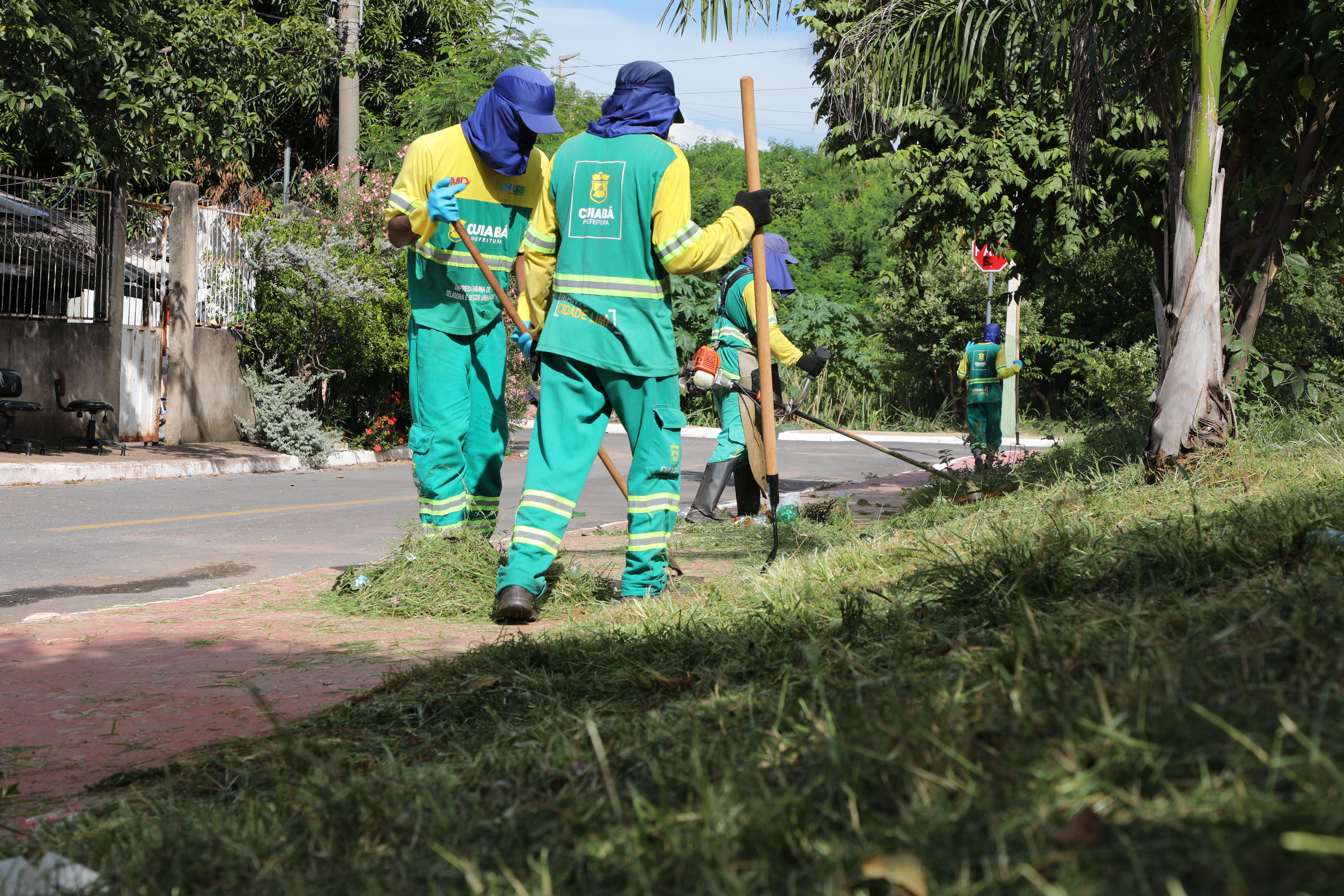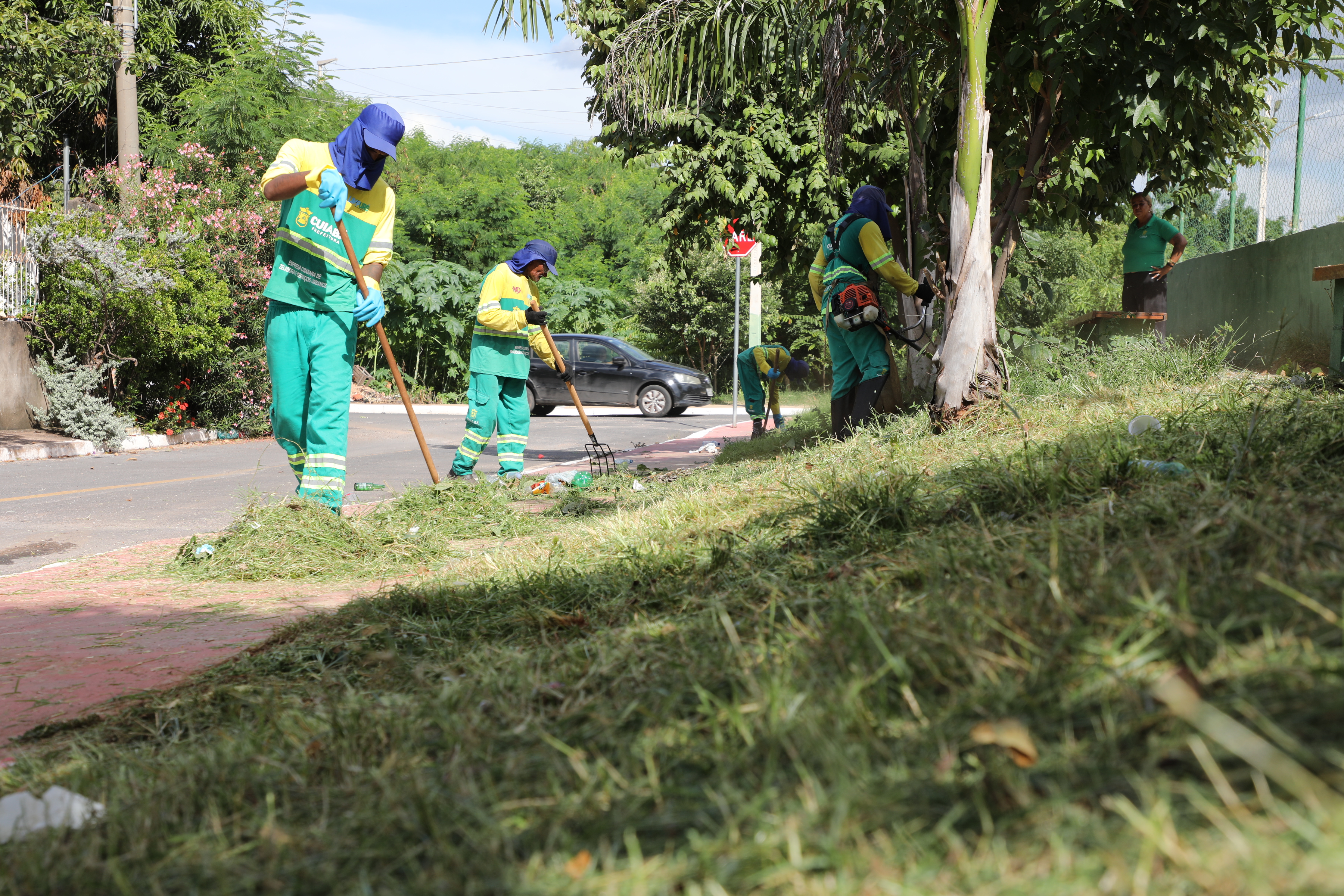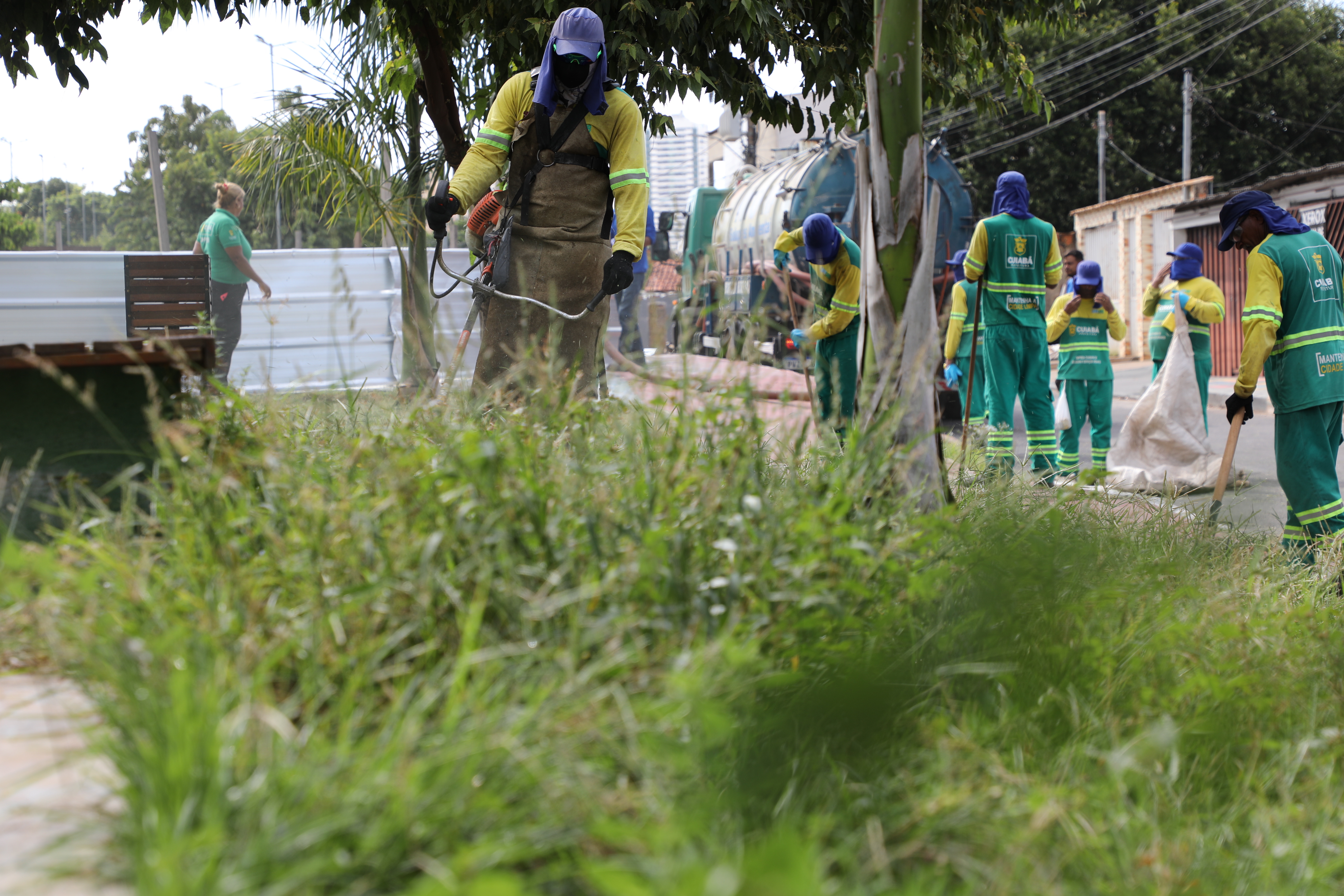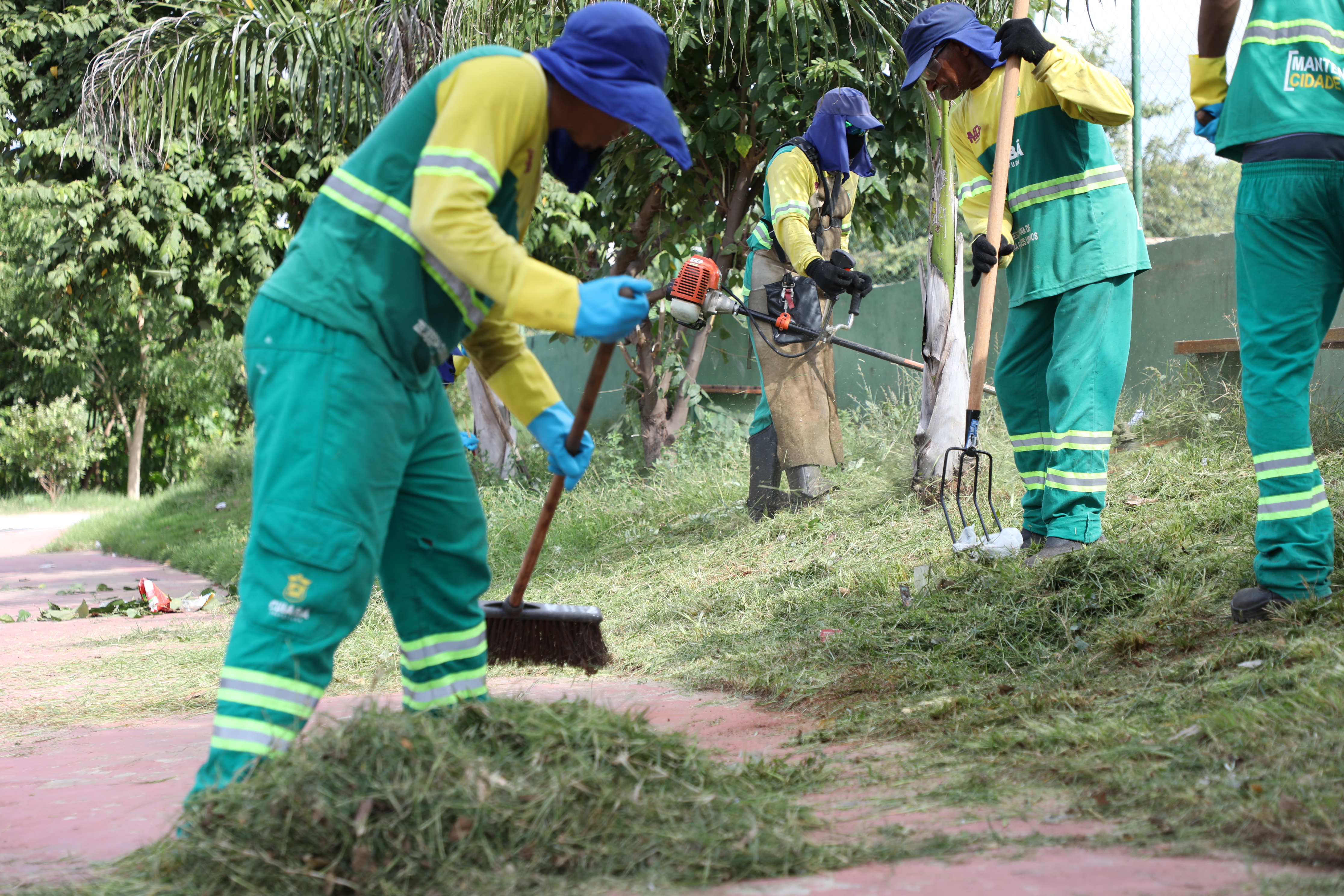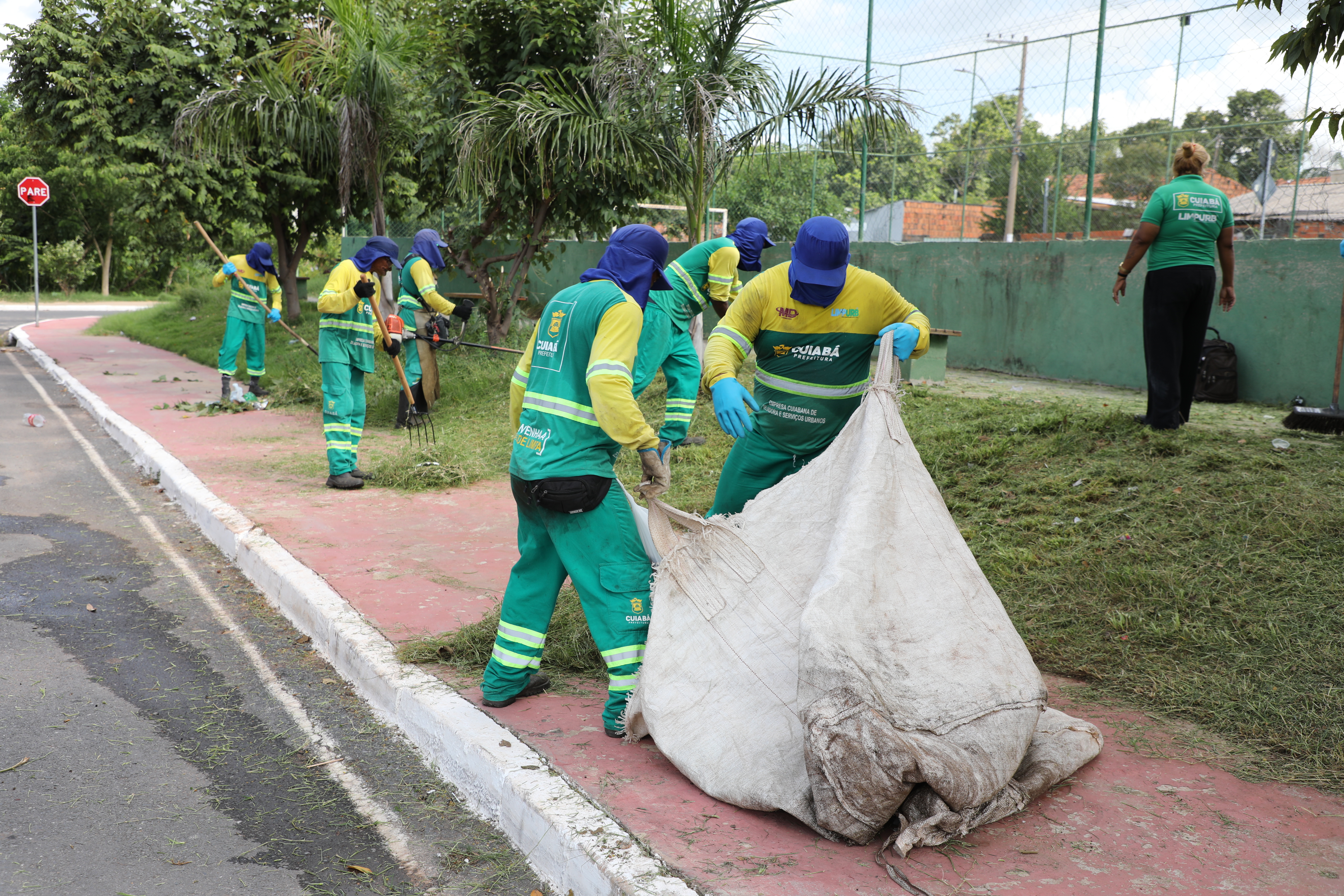 A imagem mostra trabalhadores dos serviços urbanos da Prefeitura de Cuiabá realizando uma força-tarefa de limpeza na Praça Wilson Tozi, no bairro Pedregal. Eles vestem uniforme verde.